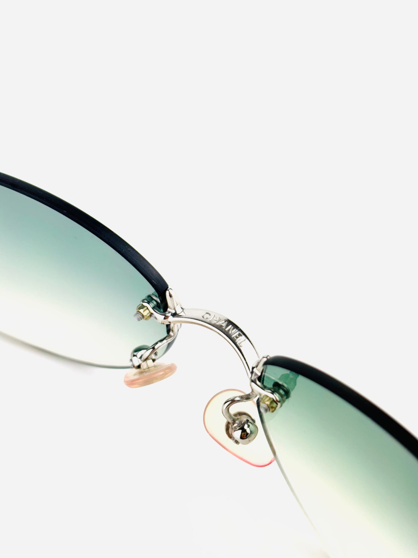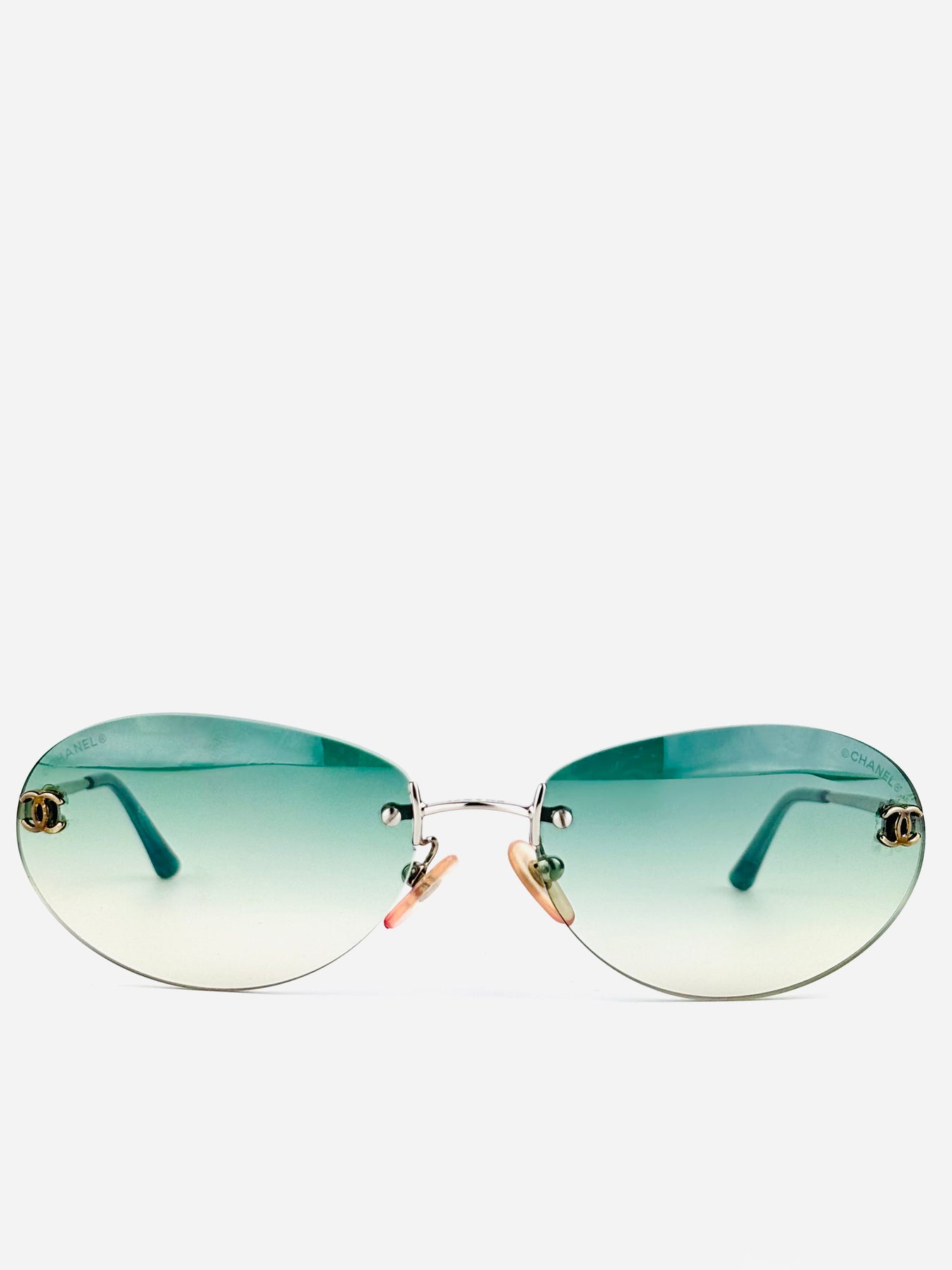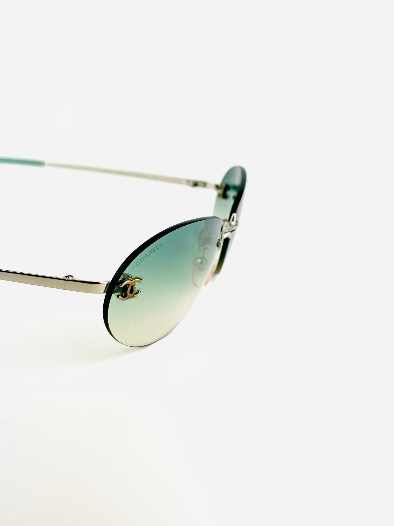 A stunning and rare Chanel design from the early 2000s, the 4013 features a smooth C-shaped oval silhouette in translucent green-blue acetate. The color shifts beautifully between turquoise and emerald under the light, giving the frame a soft, liquid glow.