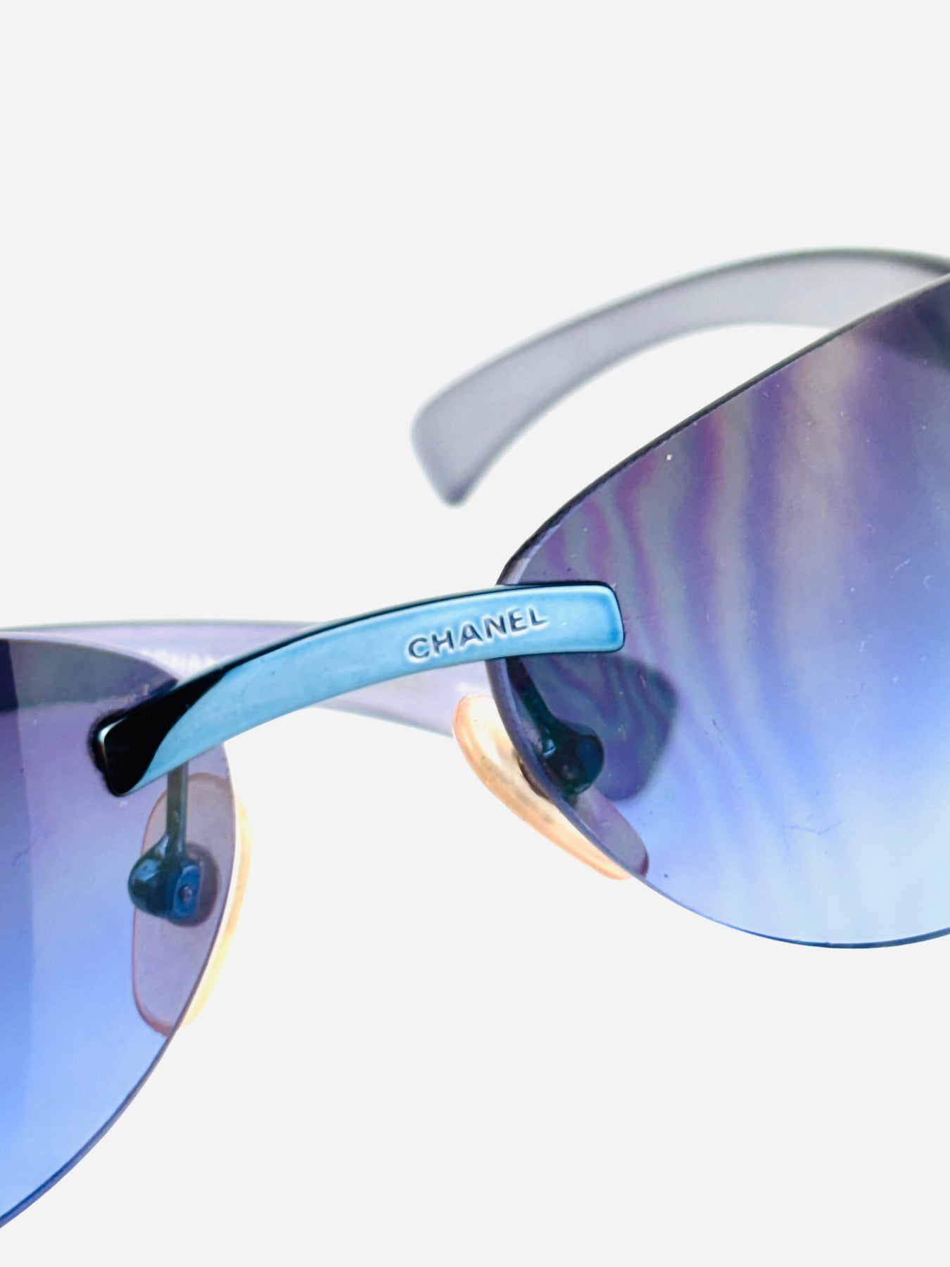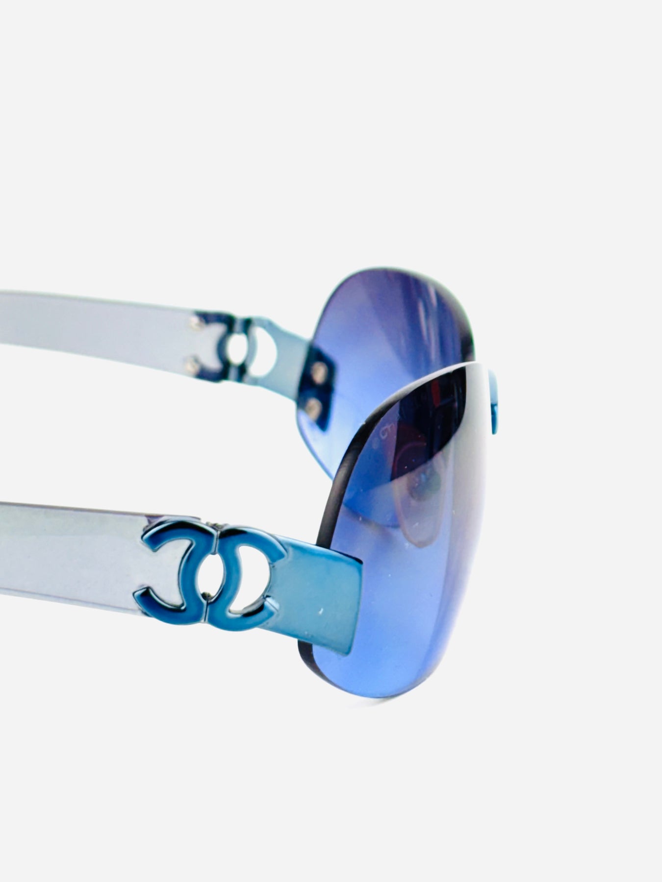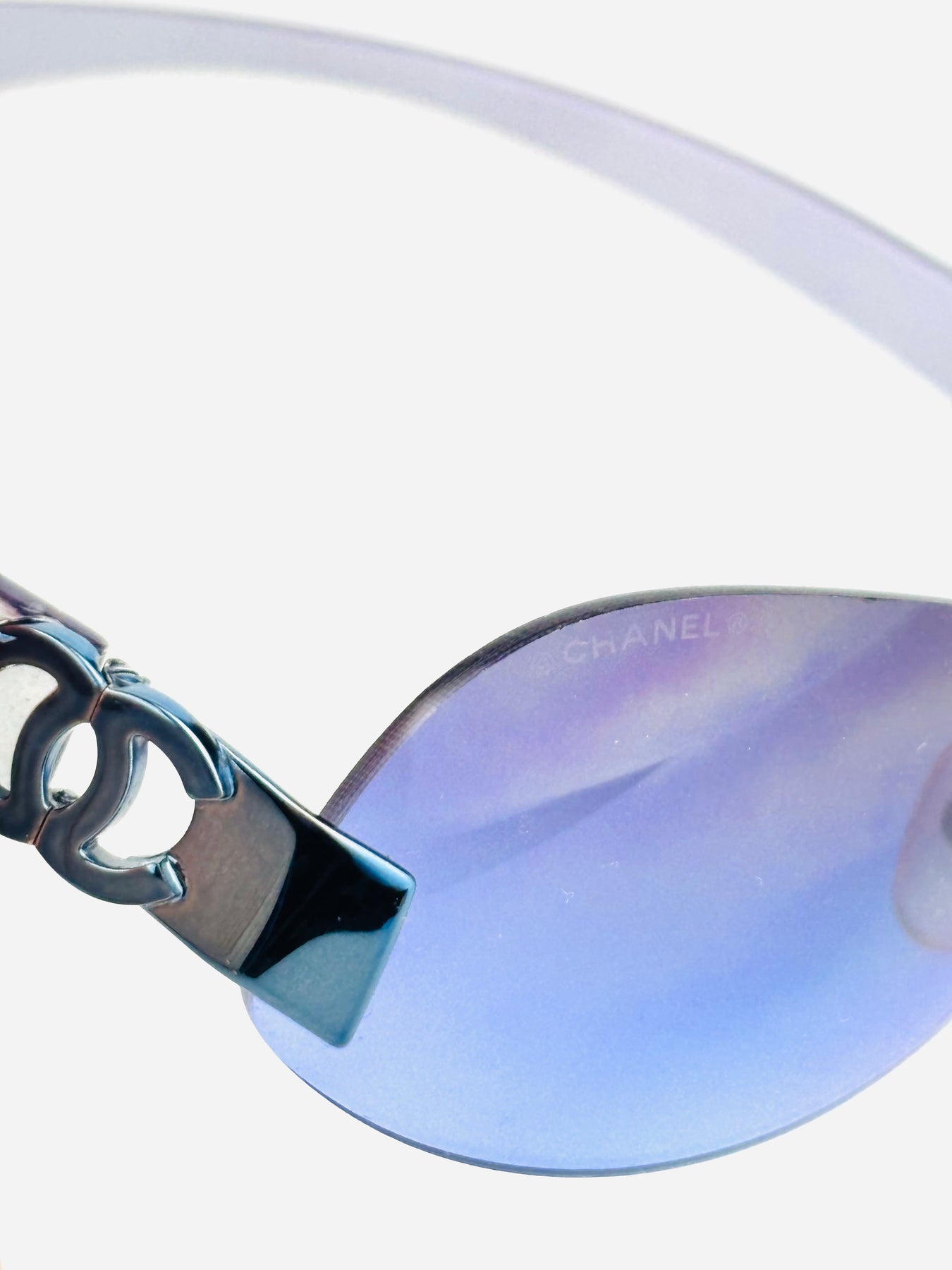 Its rimless construction gives a weightless, futuristic feel, while the subtle color shift adds depth and luxury — a perfect example of Chanel’s Y2K sophistication.