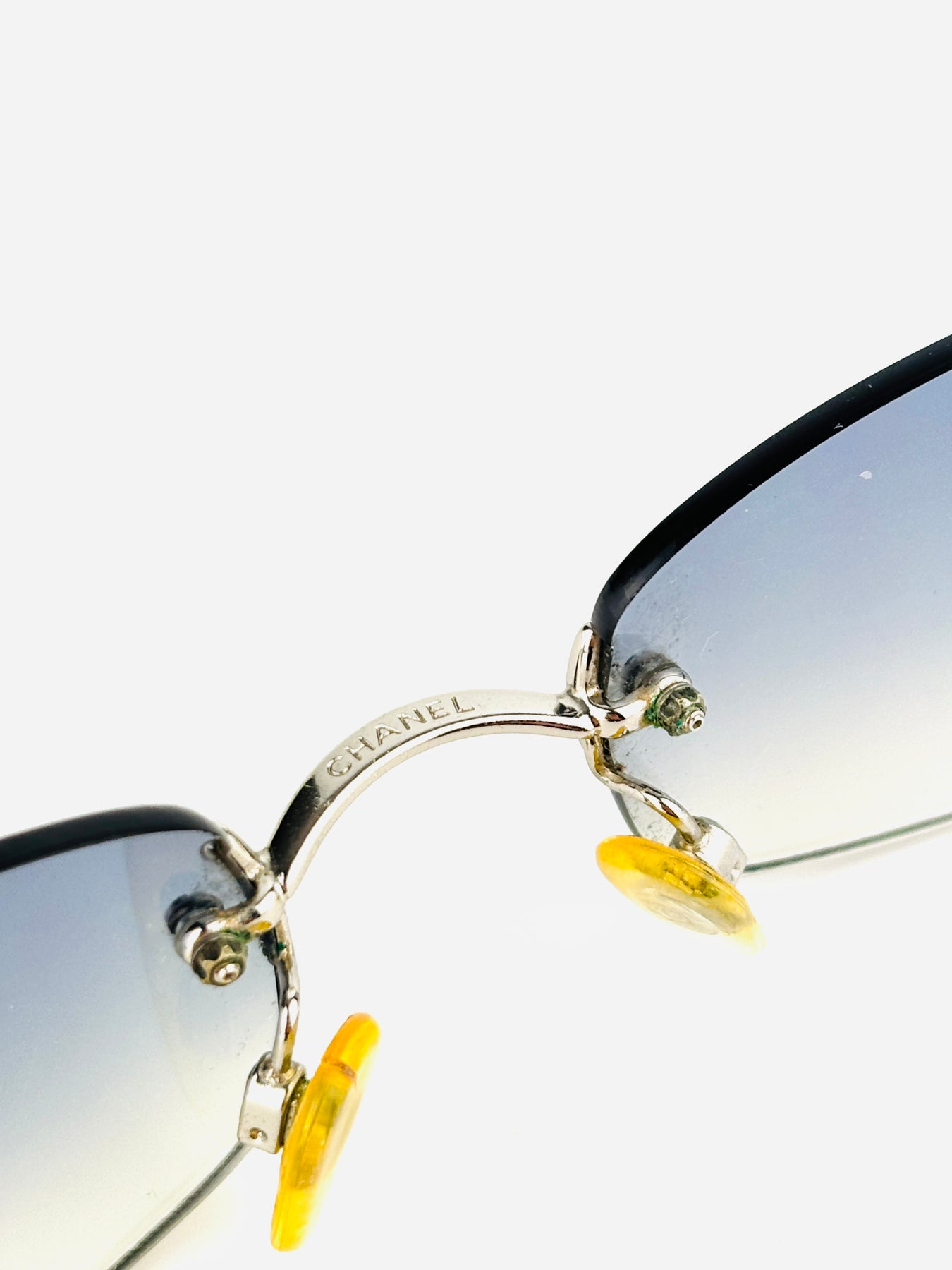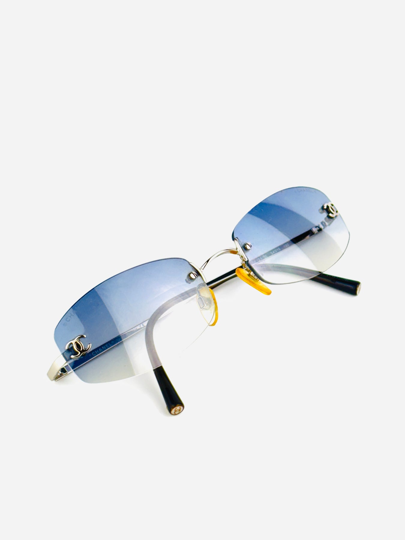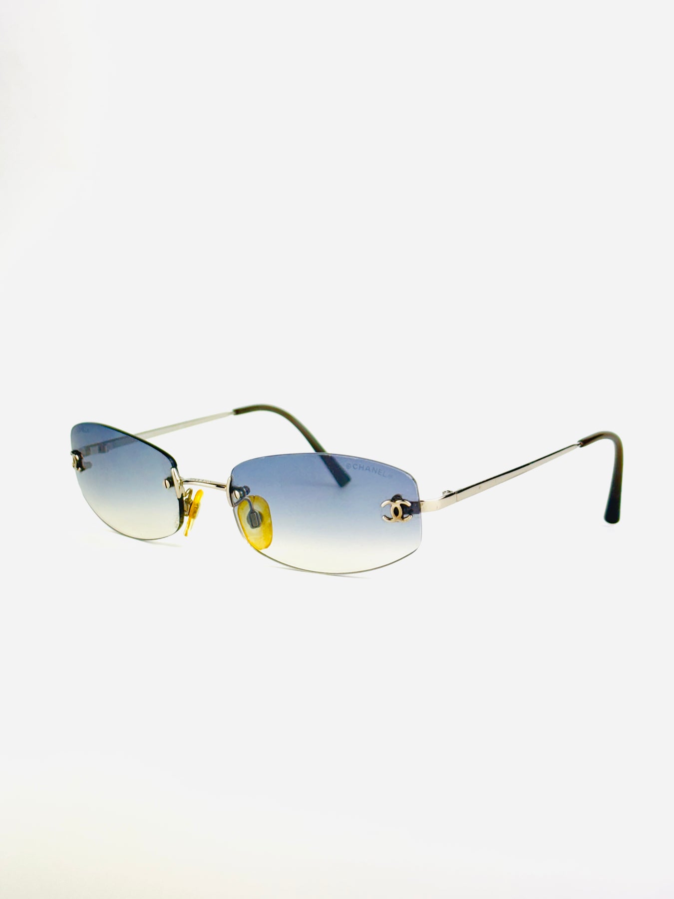 A rare and elegant Chanel design from the early 2000s, the 4002 model features light blue gradient lenses and a delicate rimless metal frame.