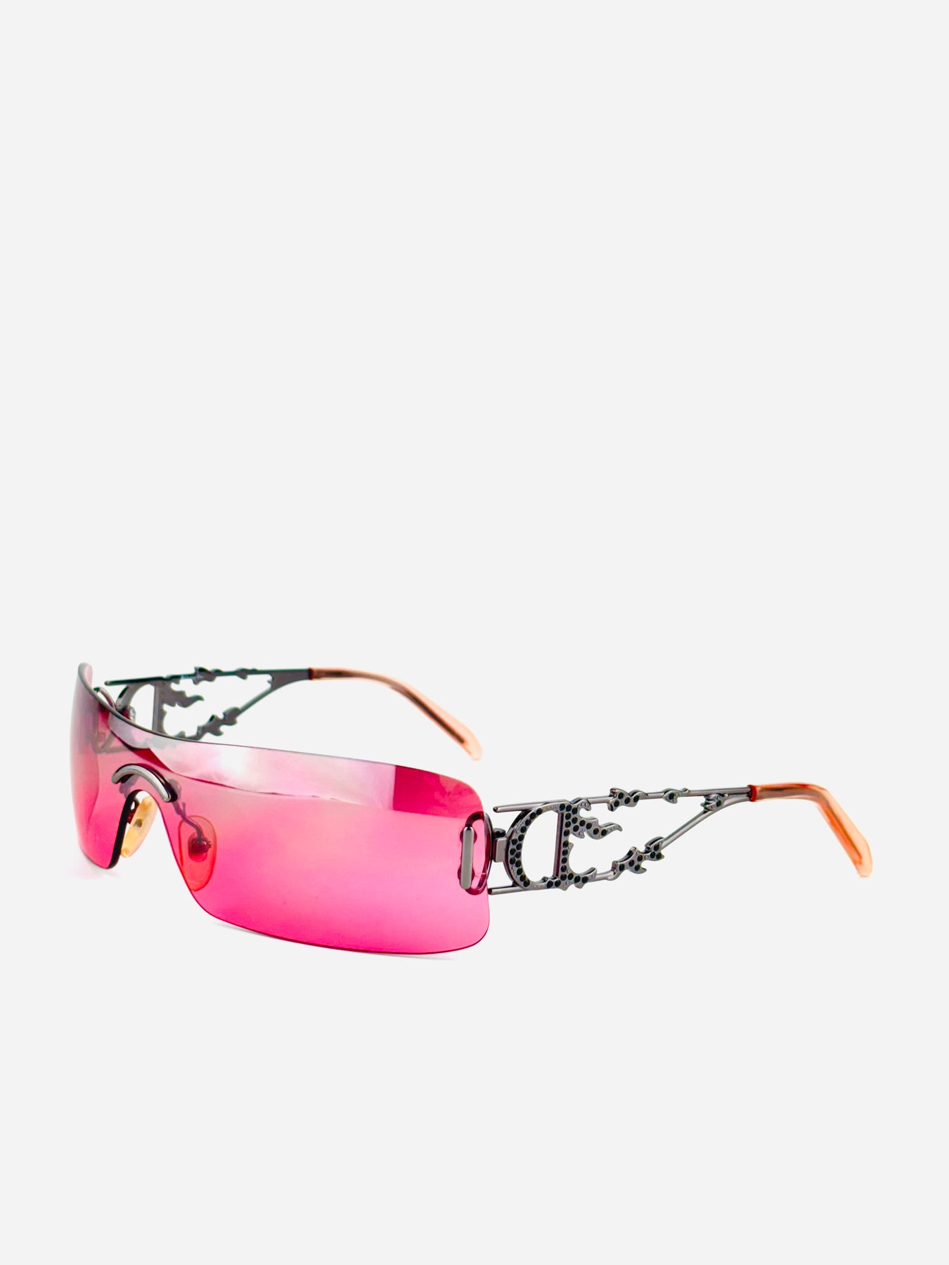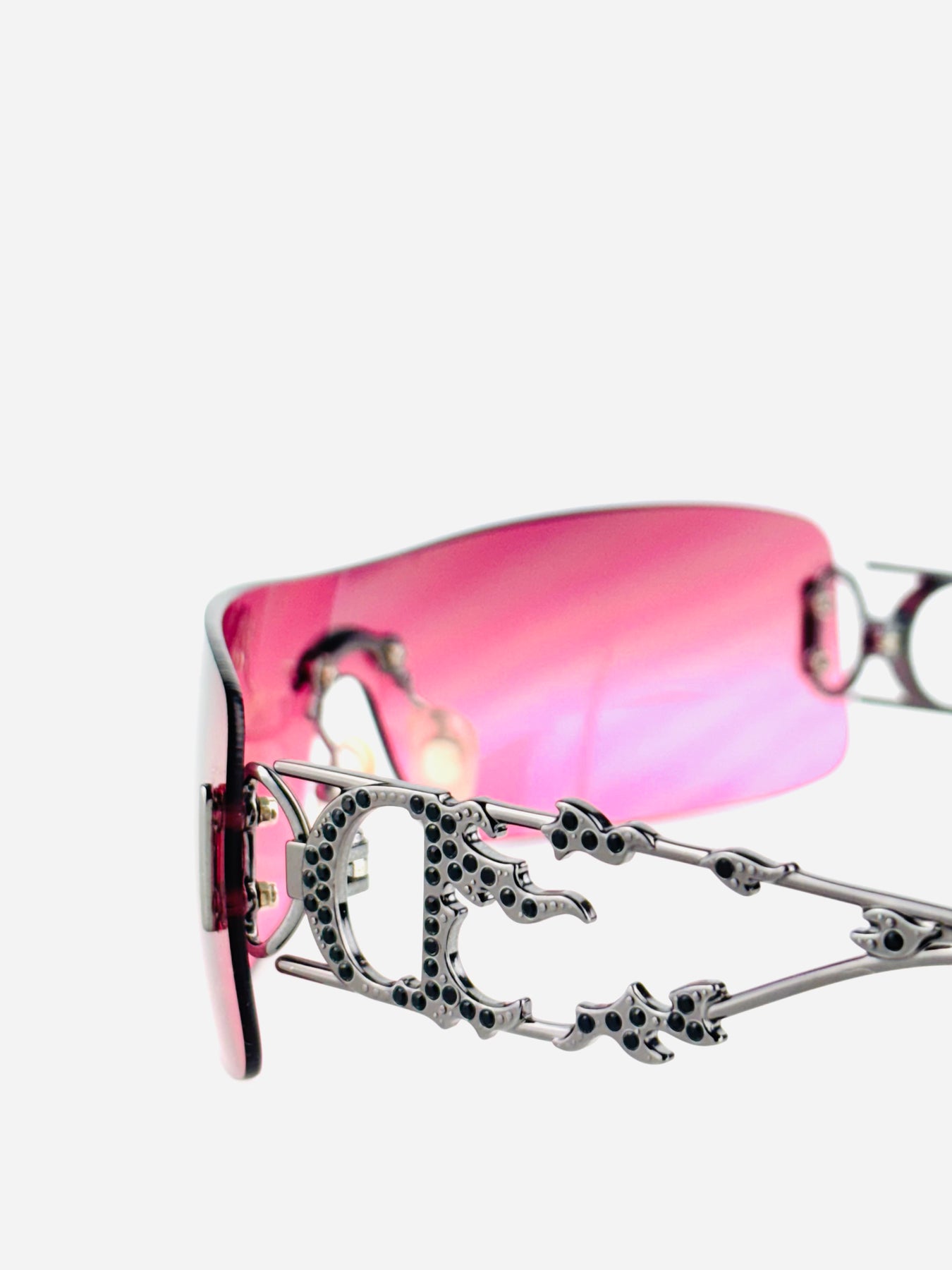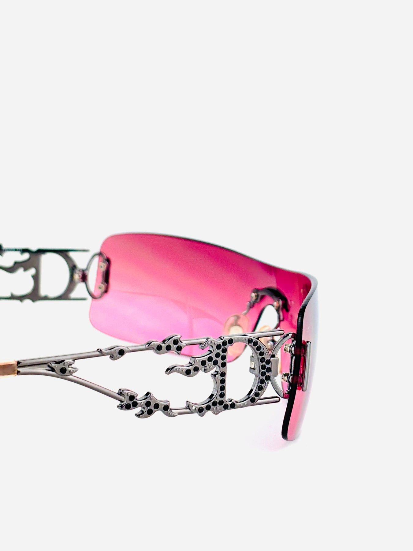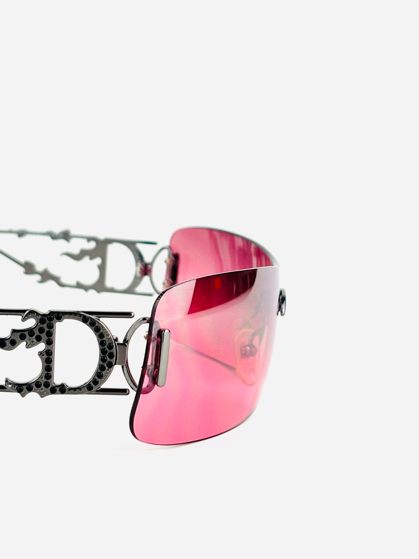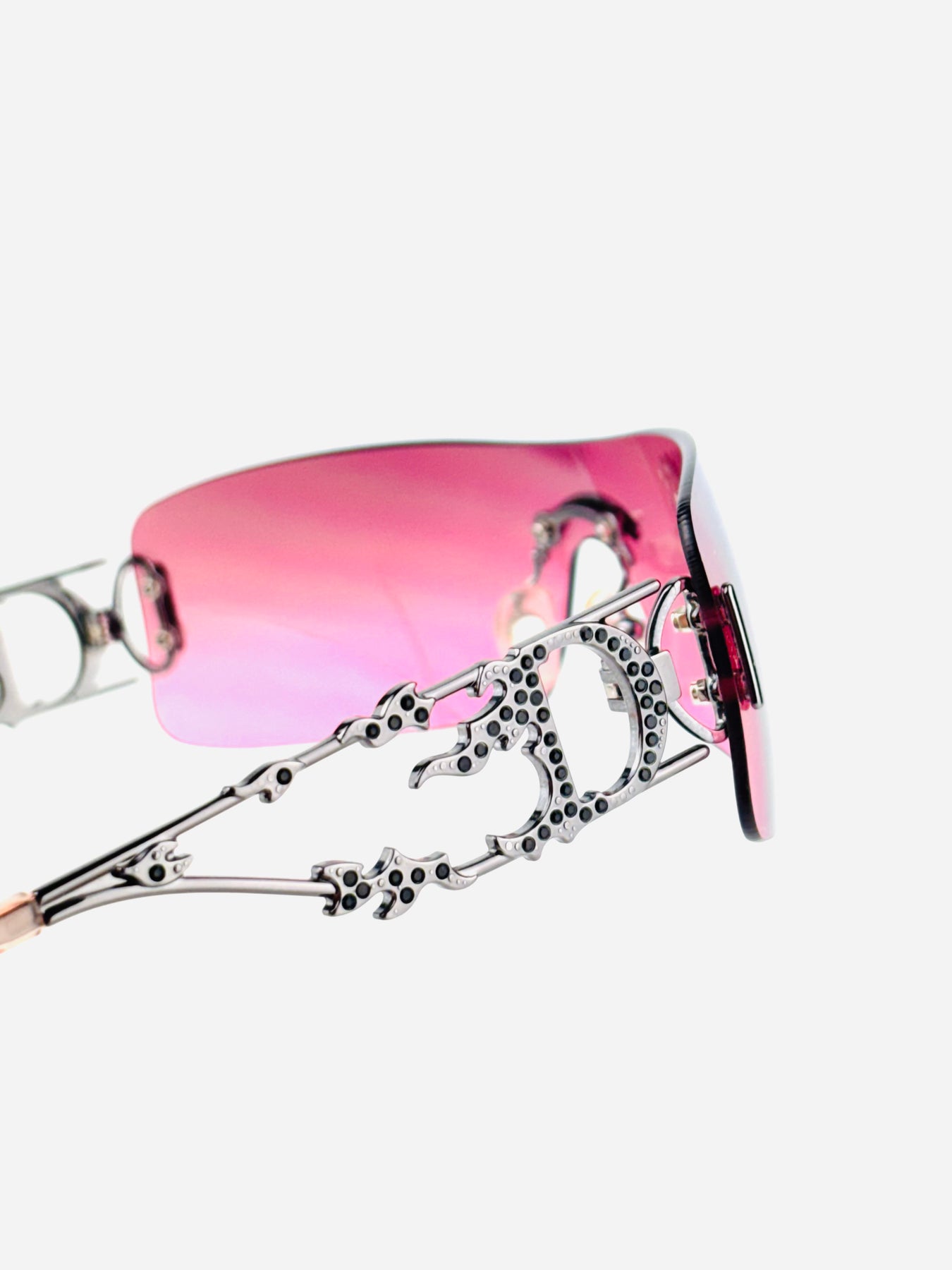 Featuring soft pink mirrored lenses, metallic accents and a streamlined mask silhouette, it embodies Dior’s futuristic vision under Galliano — bold, sensual and technical.