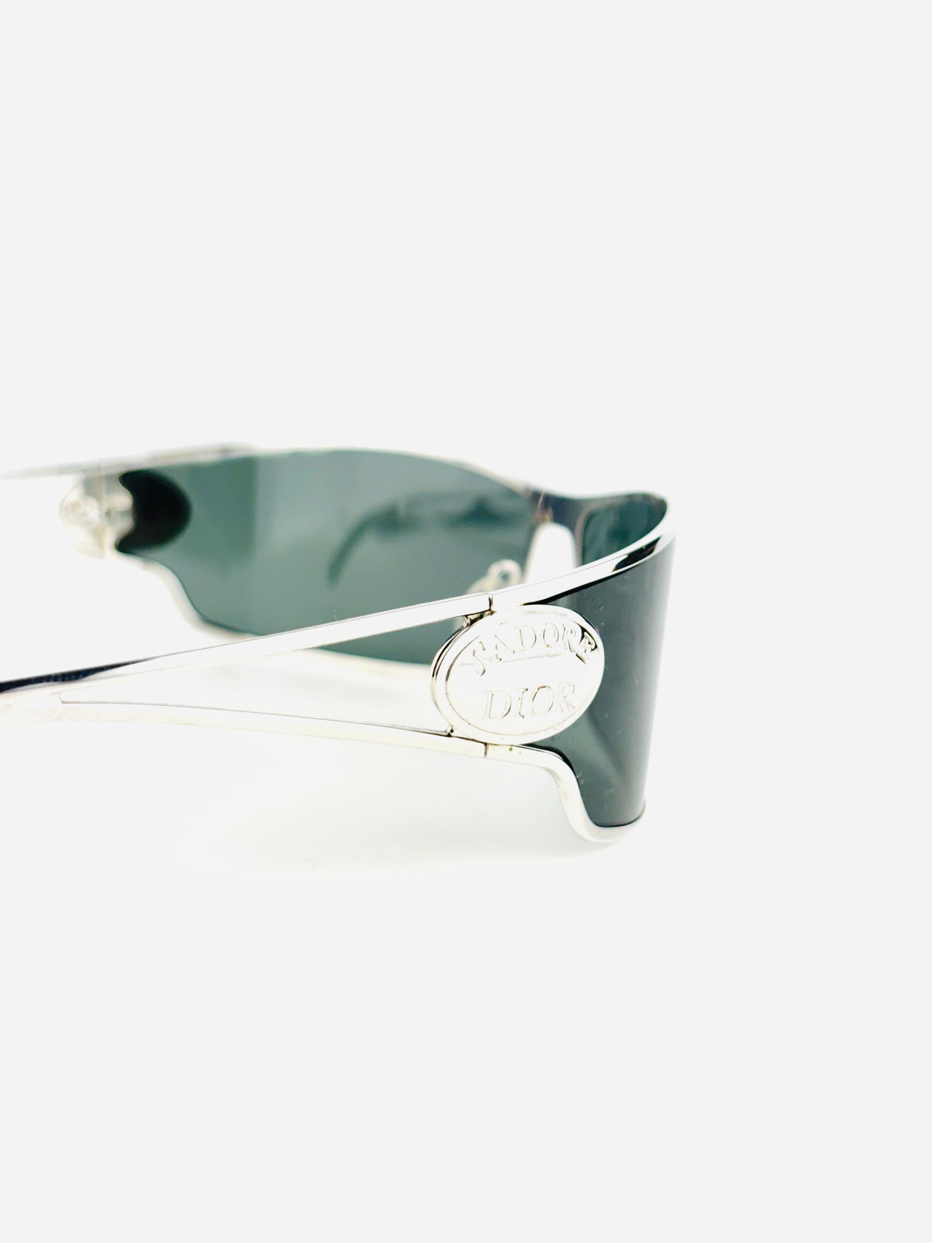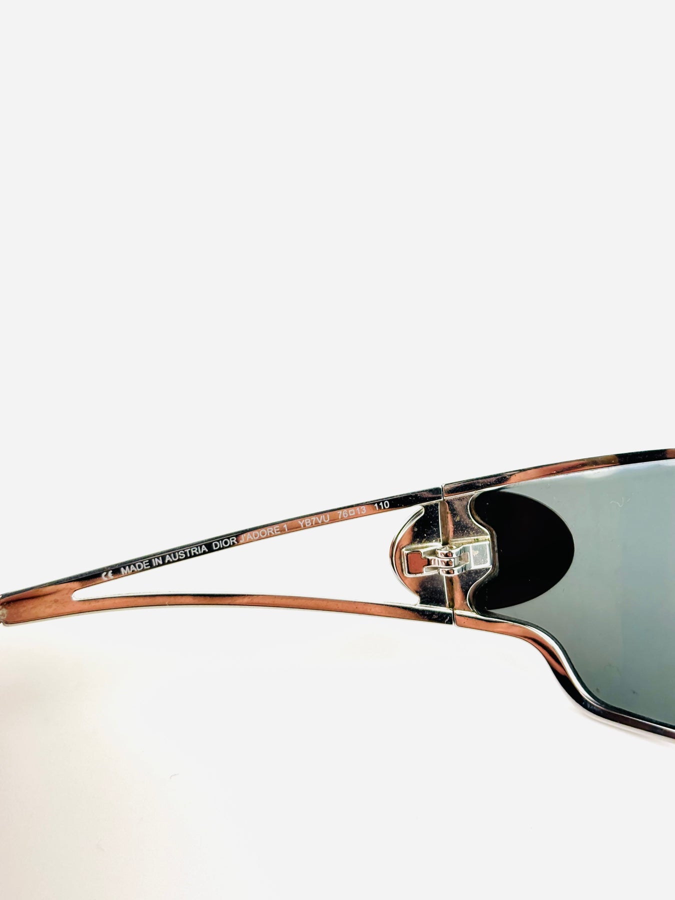 The J’Adore Dior sunglasses feature a metallic wrap-style frame engraved with the iconic “J’Adore Dior” logo on each temple, paired with smoky grey-blue lenses.