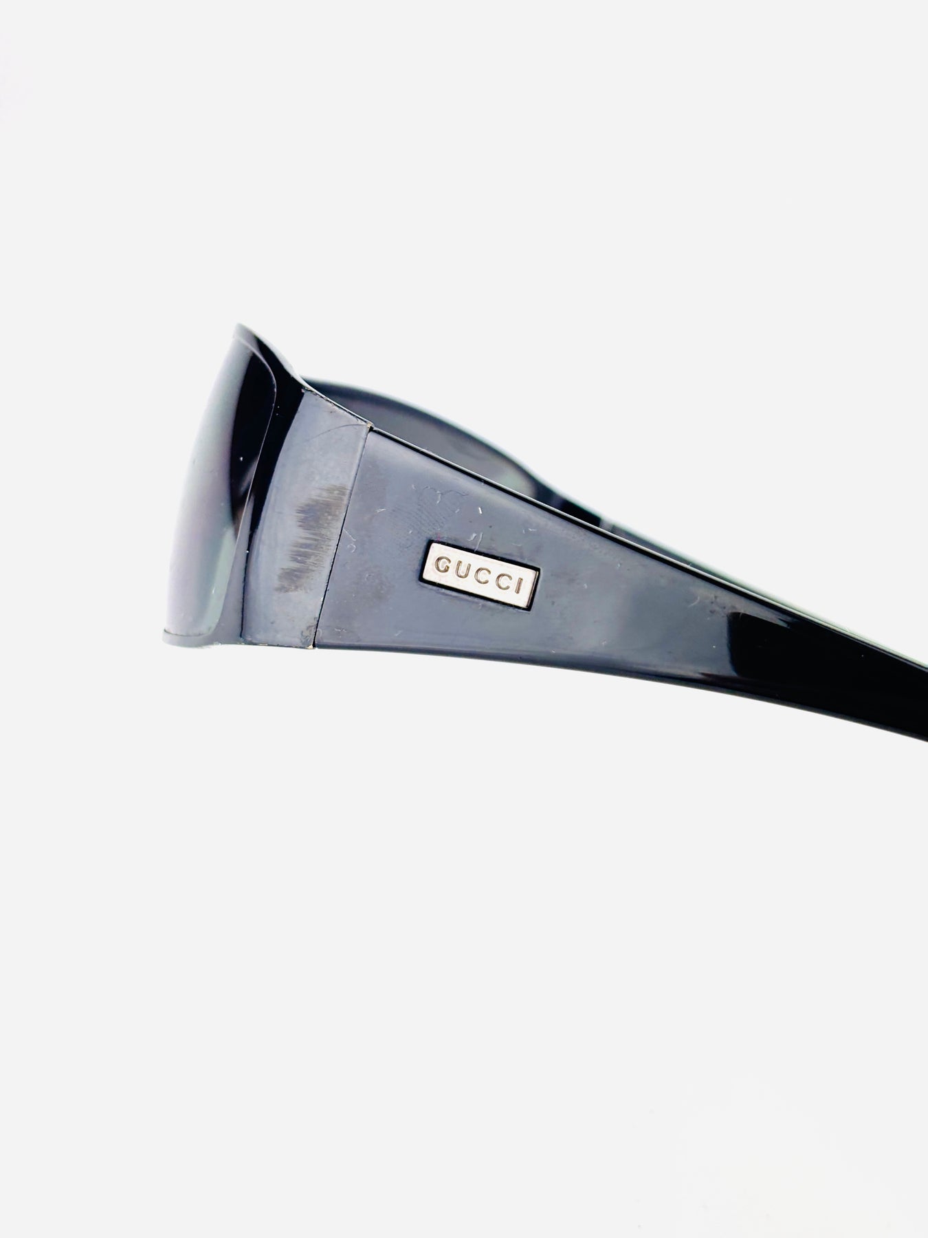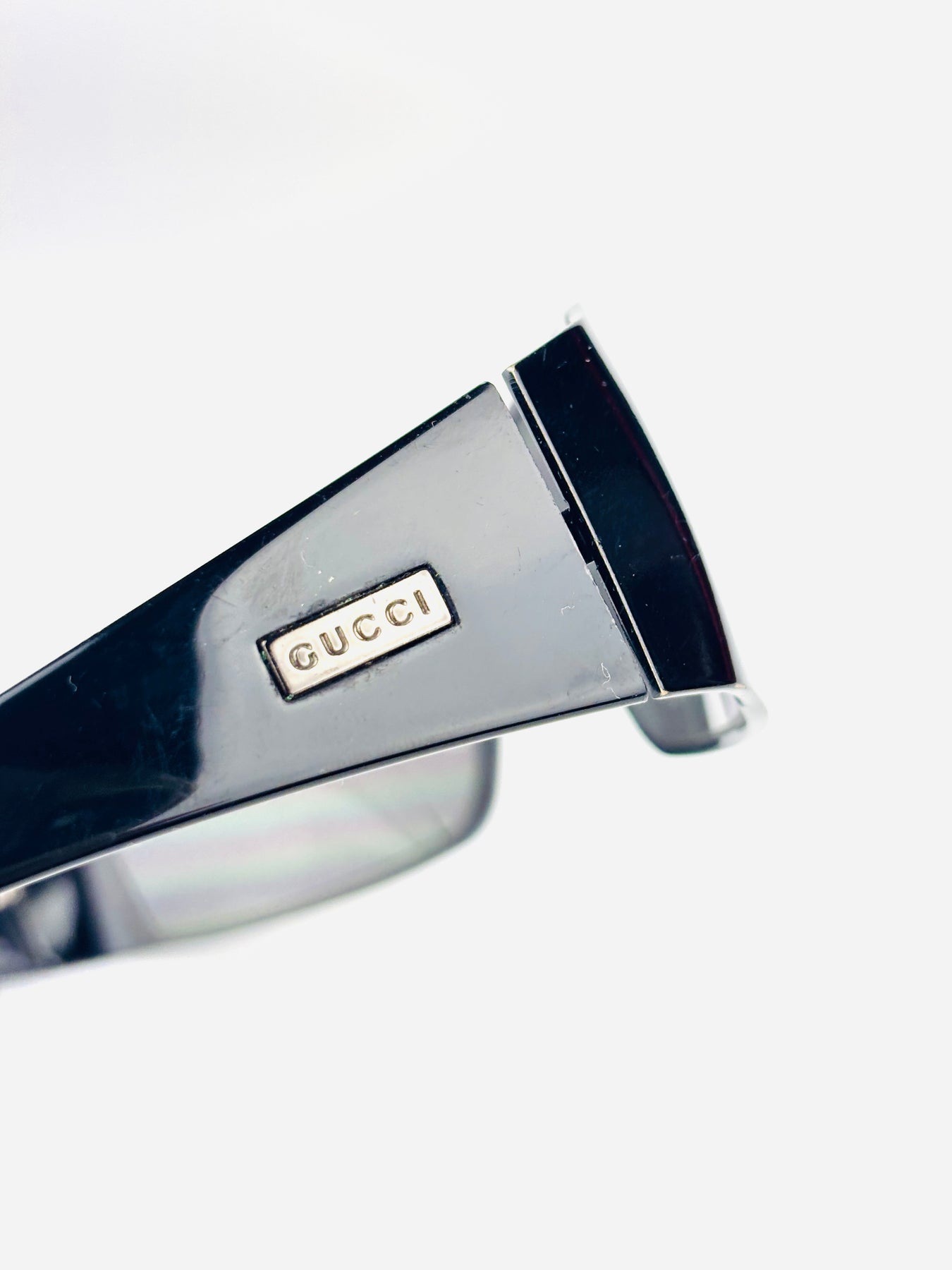 The frame features a rectangular shield lens integrated into a wide sculptural front, finished with a discreet metallic Gucci plaque on the temples. The smoked grey lens adds a subtle iridescent sheen depending on the light. Very good condition with only minor signs of wear — a true rarity from this era.