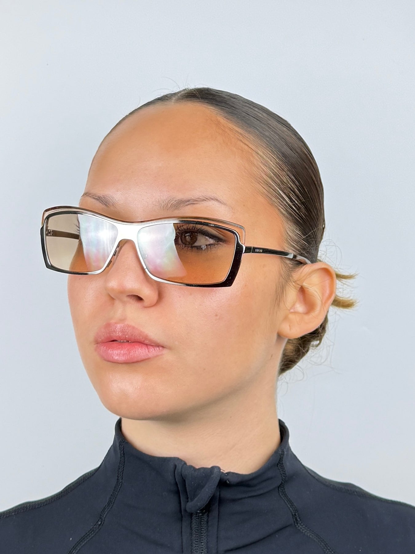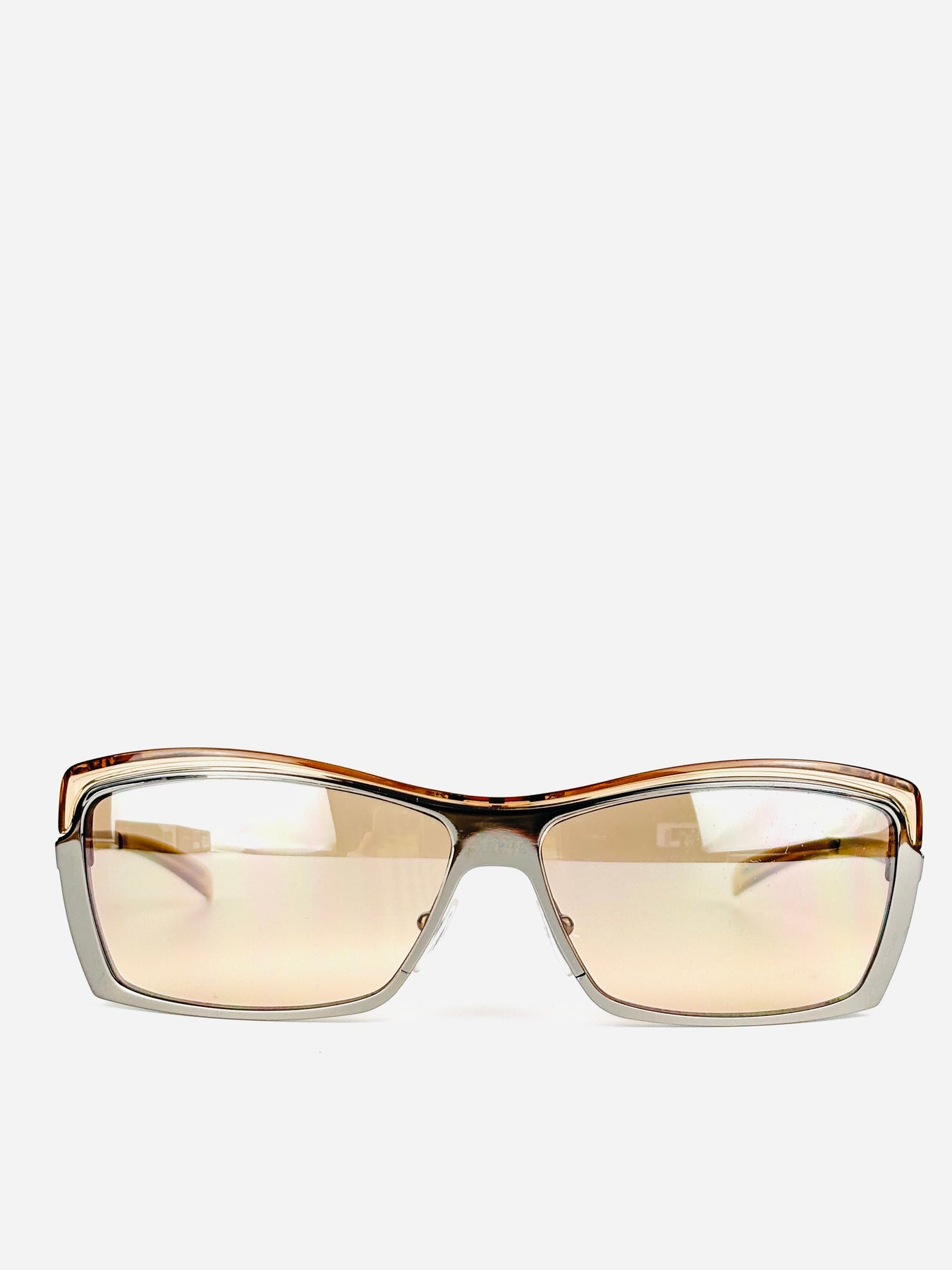 A refined and rare Gucci 2688, featuring a unique architectural metal frame combined with brown translucent acetate. The rectangular design is sophisticated yet bold, reminiscent of Gucci’s clean luxury DNA of the 2000s.