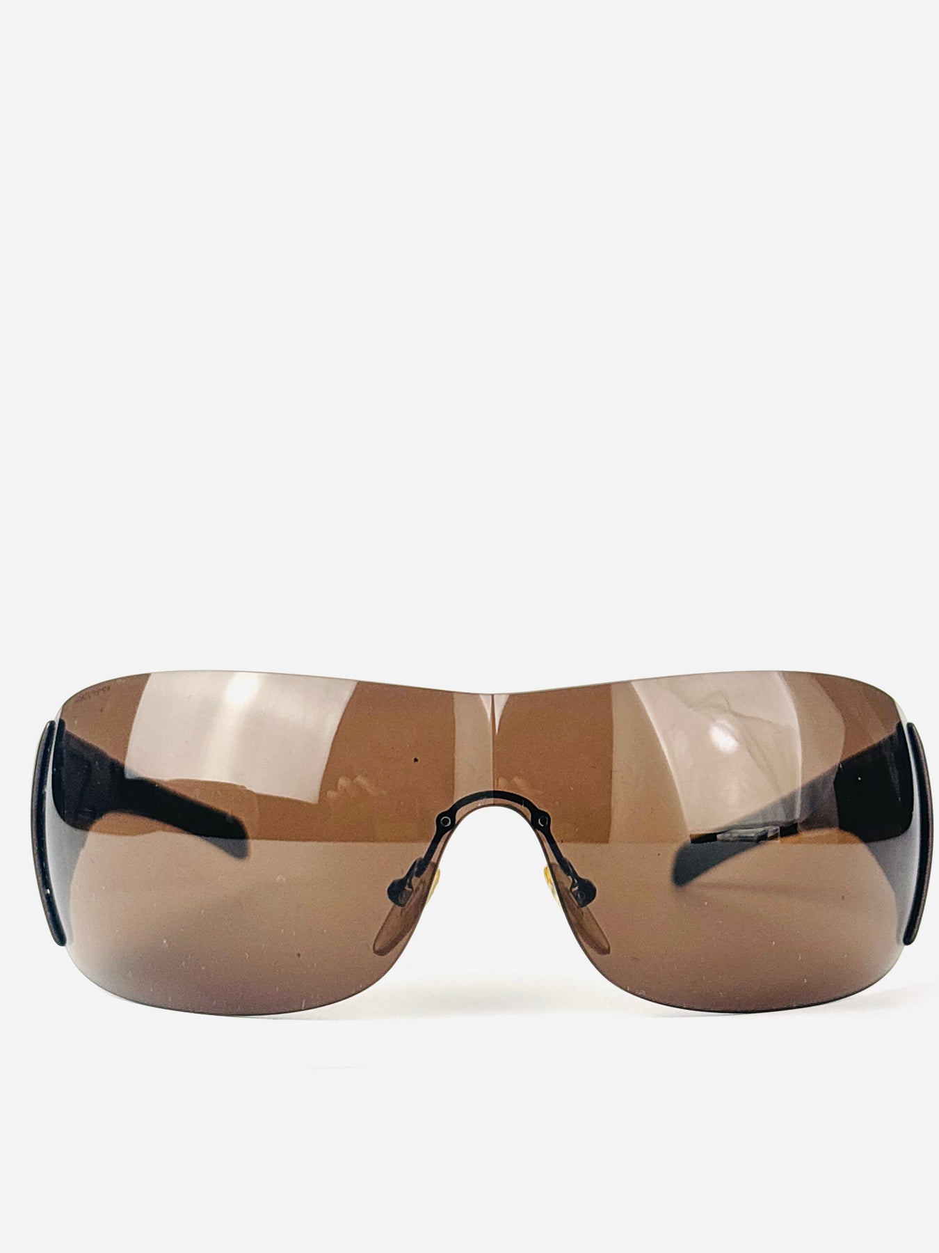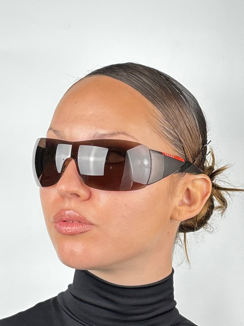 This SPS 07H features a brown mask lens with rimless construction and brown temples highlighted by a red Prada detail. A sharp and sporty Y2K silhouette. Very good vintage condition.