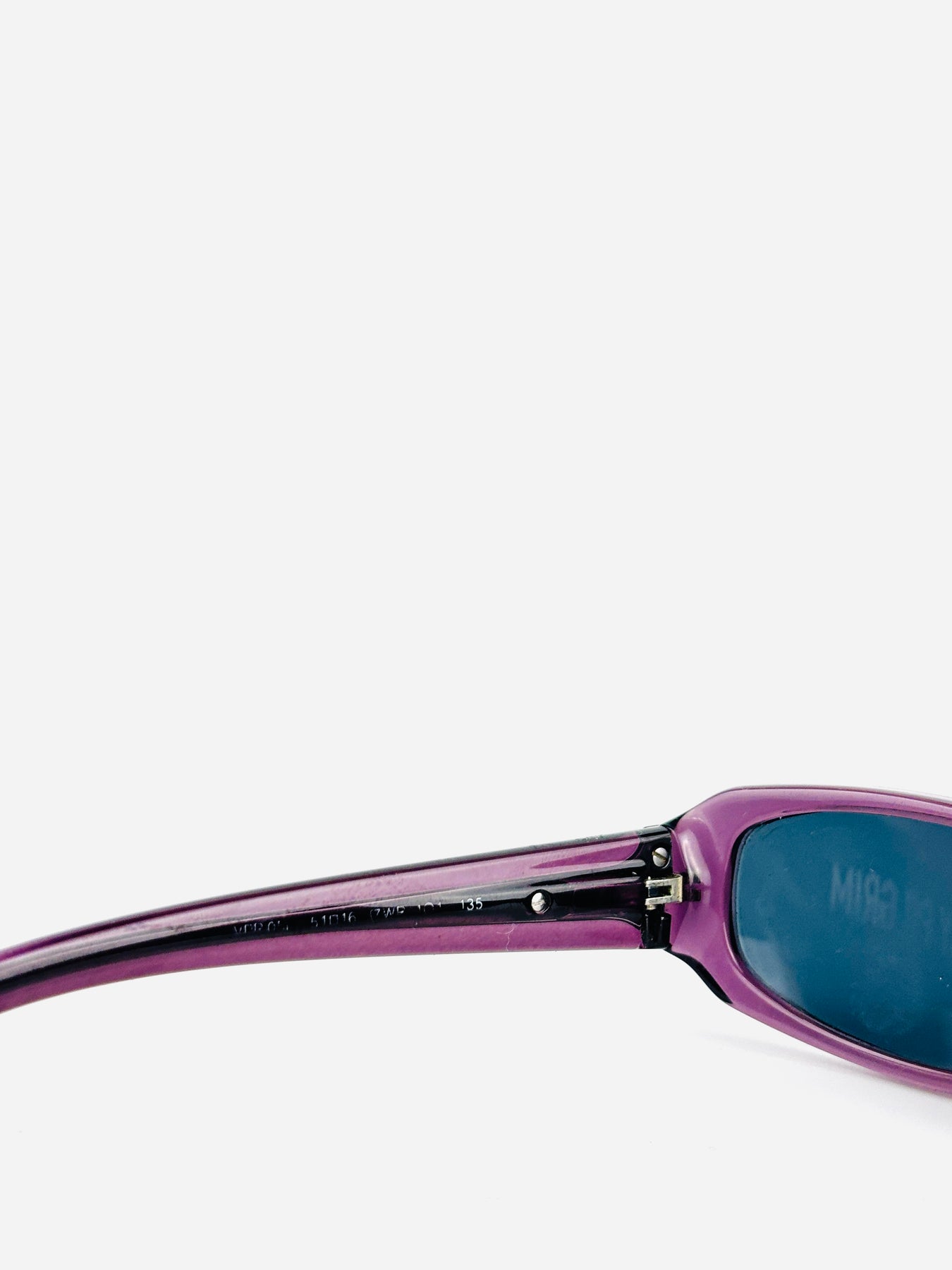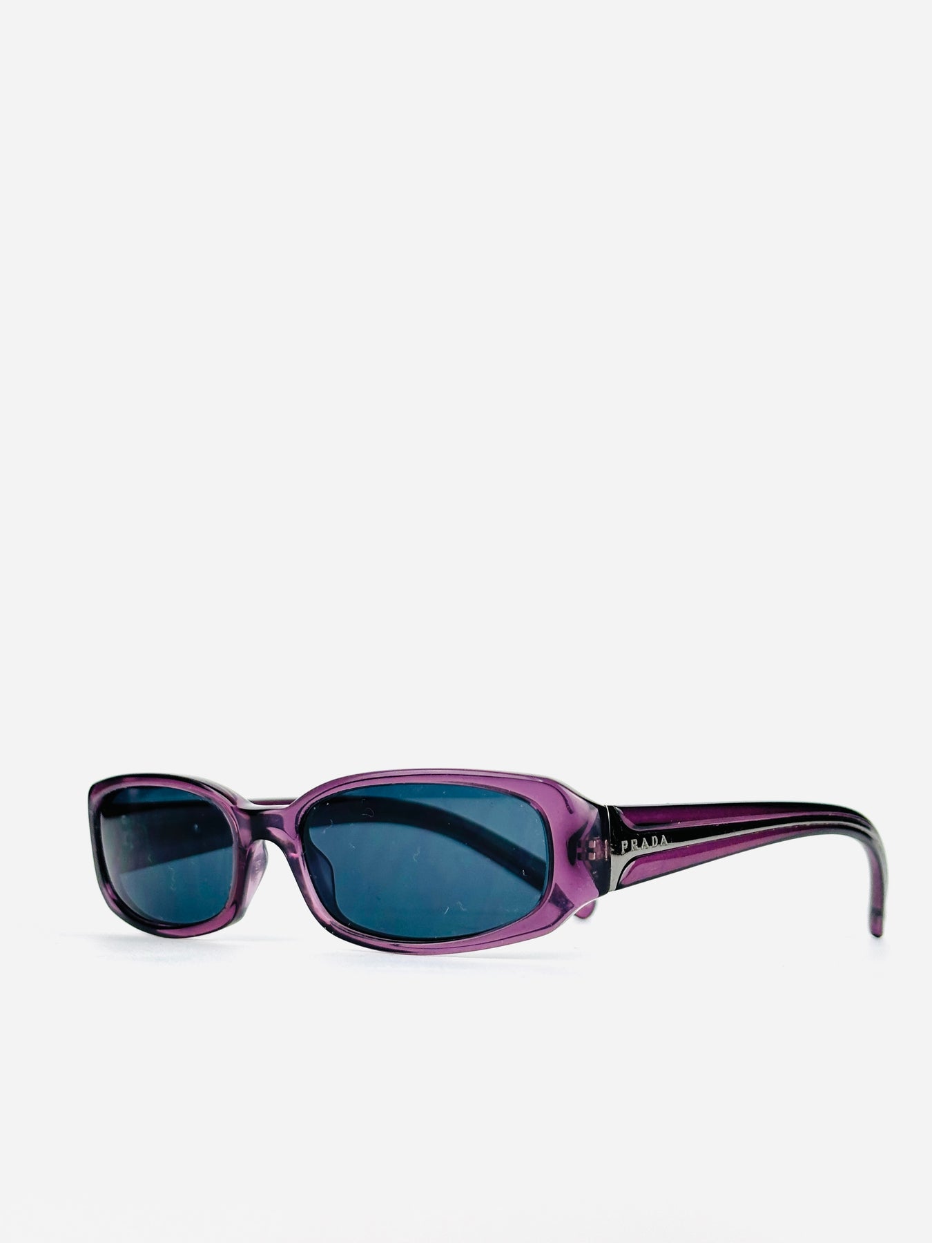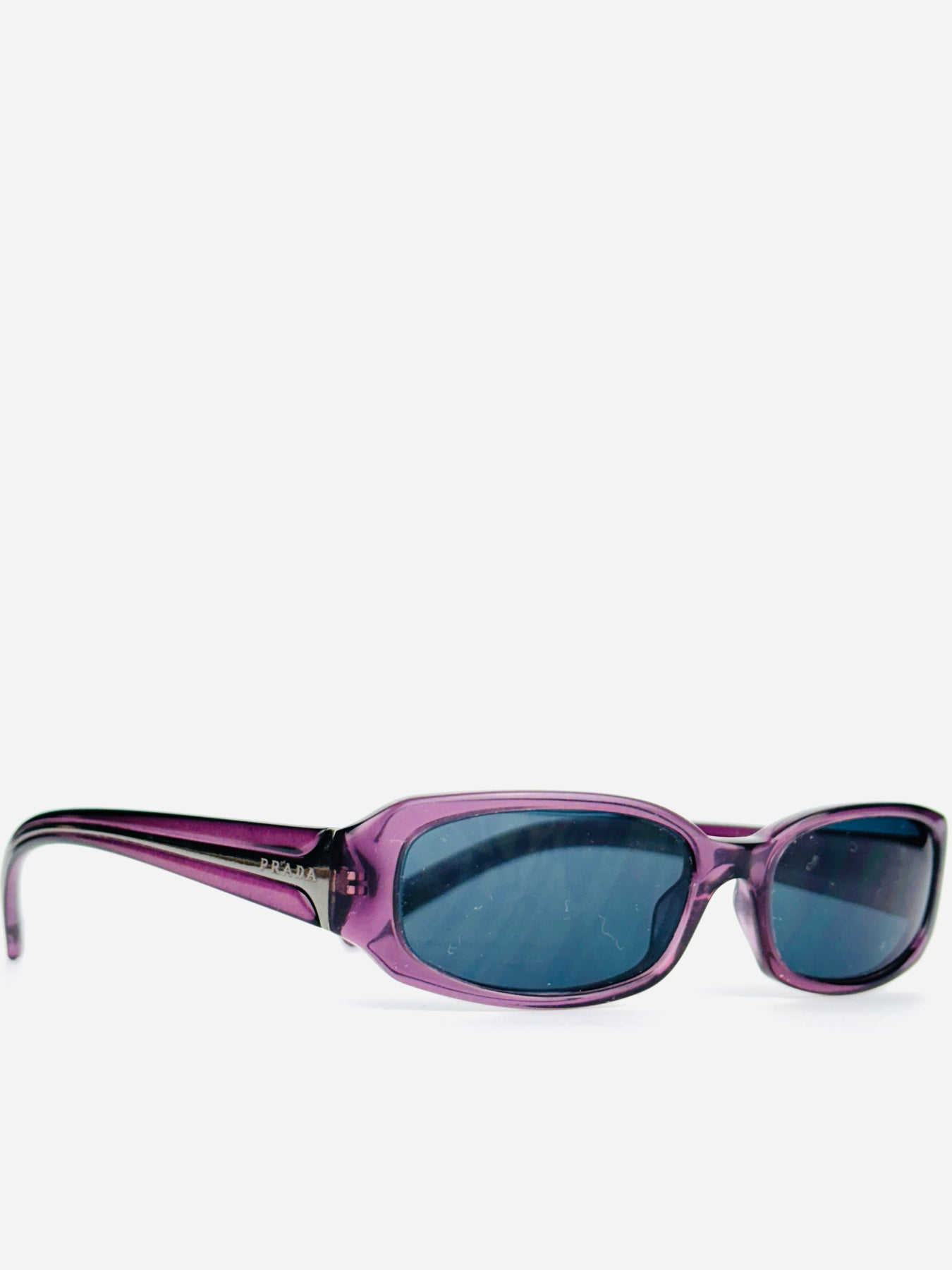 This Prada VPR 05 features a sleek rectangular shape in translucent violet acetate, paired with deep blue lenses. The slim proportions and sculpted temples give it that iconic “Bayonetta” energy — bold, confident, ultra Y2K.