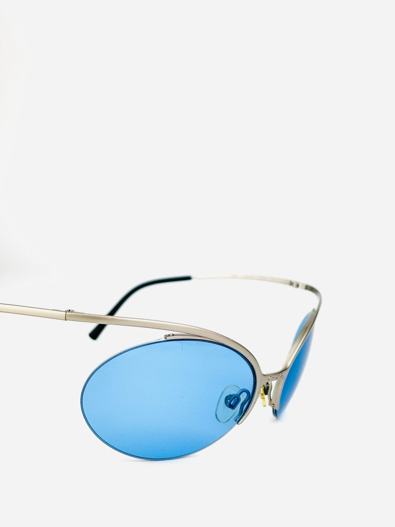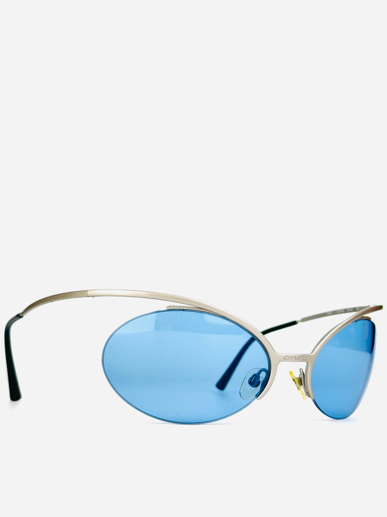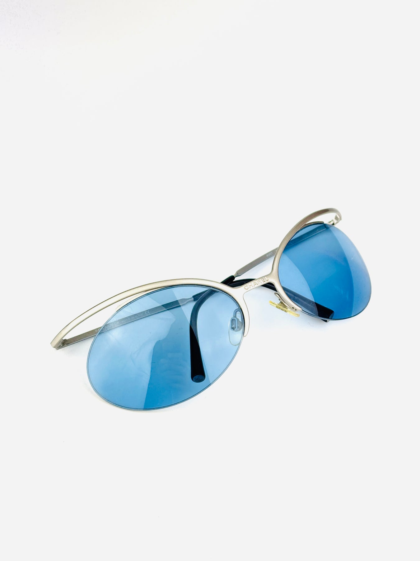 The frame combines a lightweight metallic structure with striking oval blue lenses, delivering a bold yet elegant Y2K aesthetic. The temples showcase discreet Chanel branding, and the rimless construction enhances the sleek, aerodynamic look. Condition is excellent, with only micro signs of vintage use.