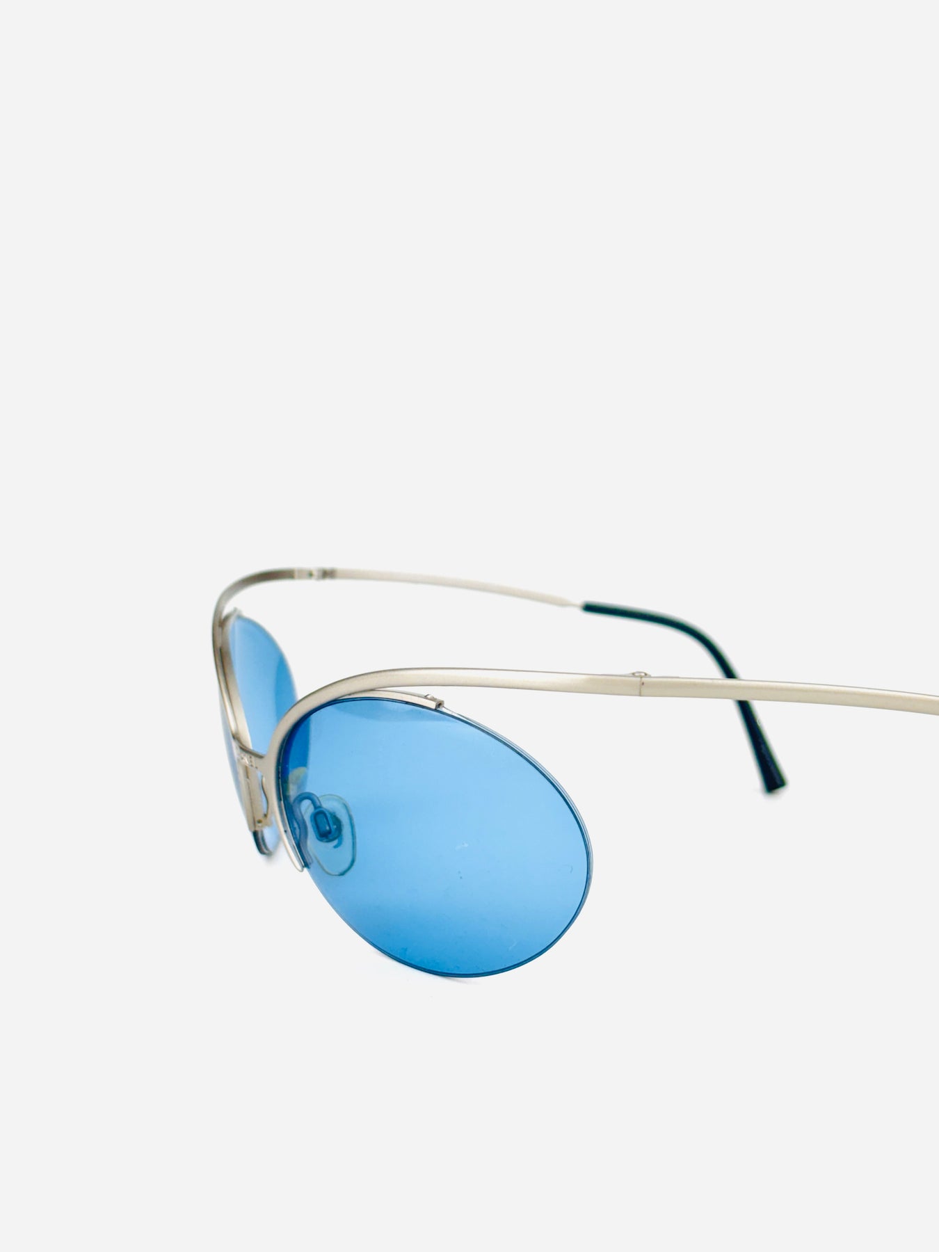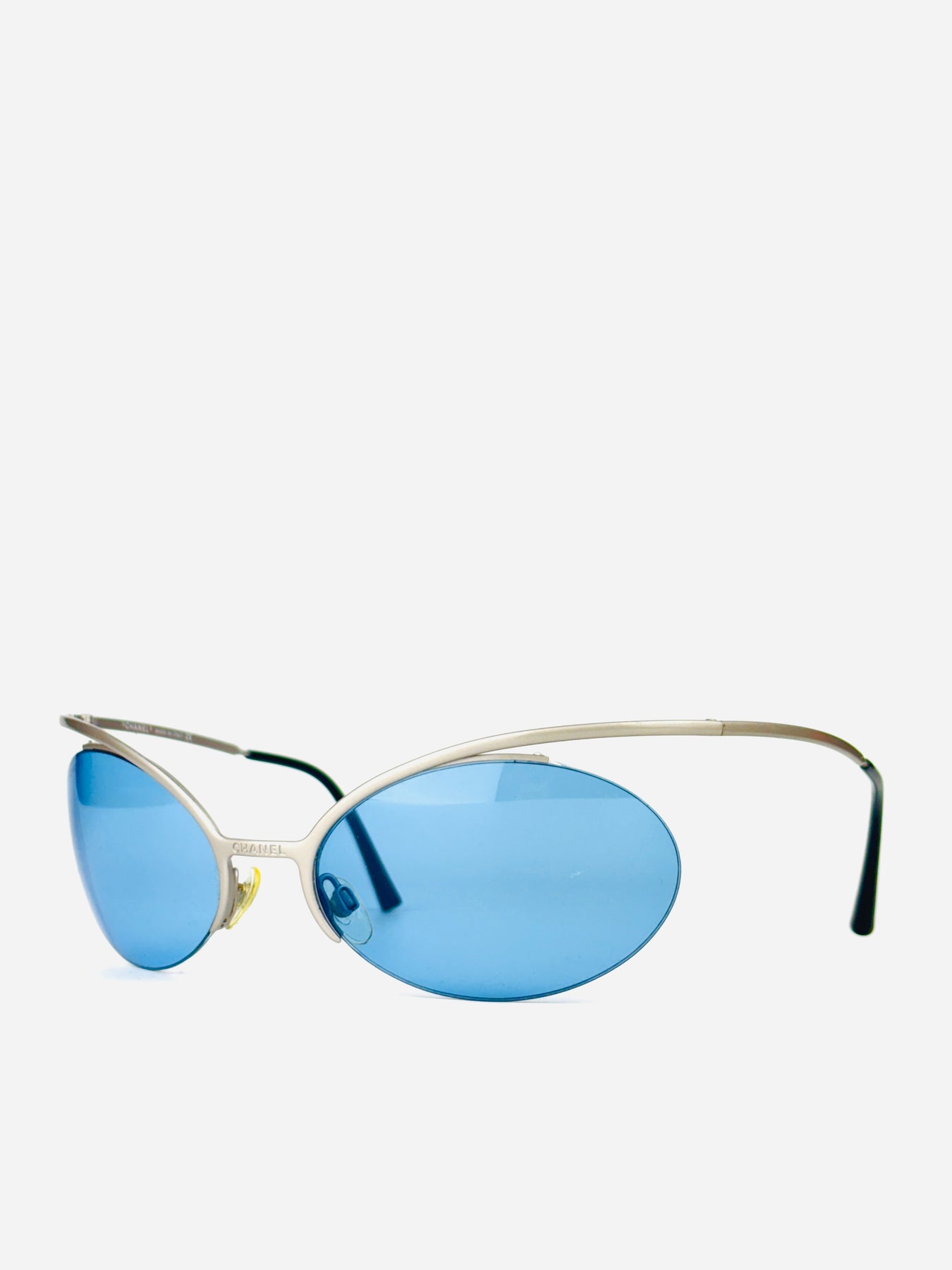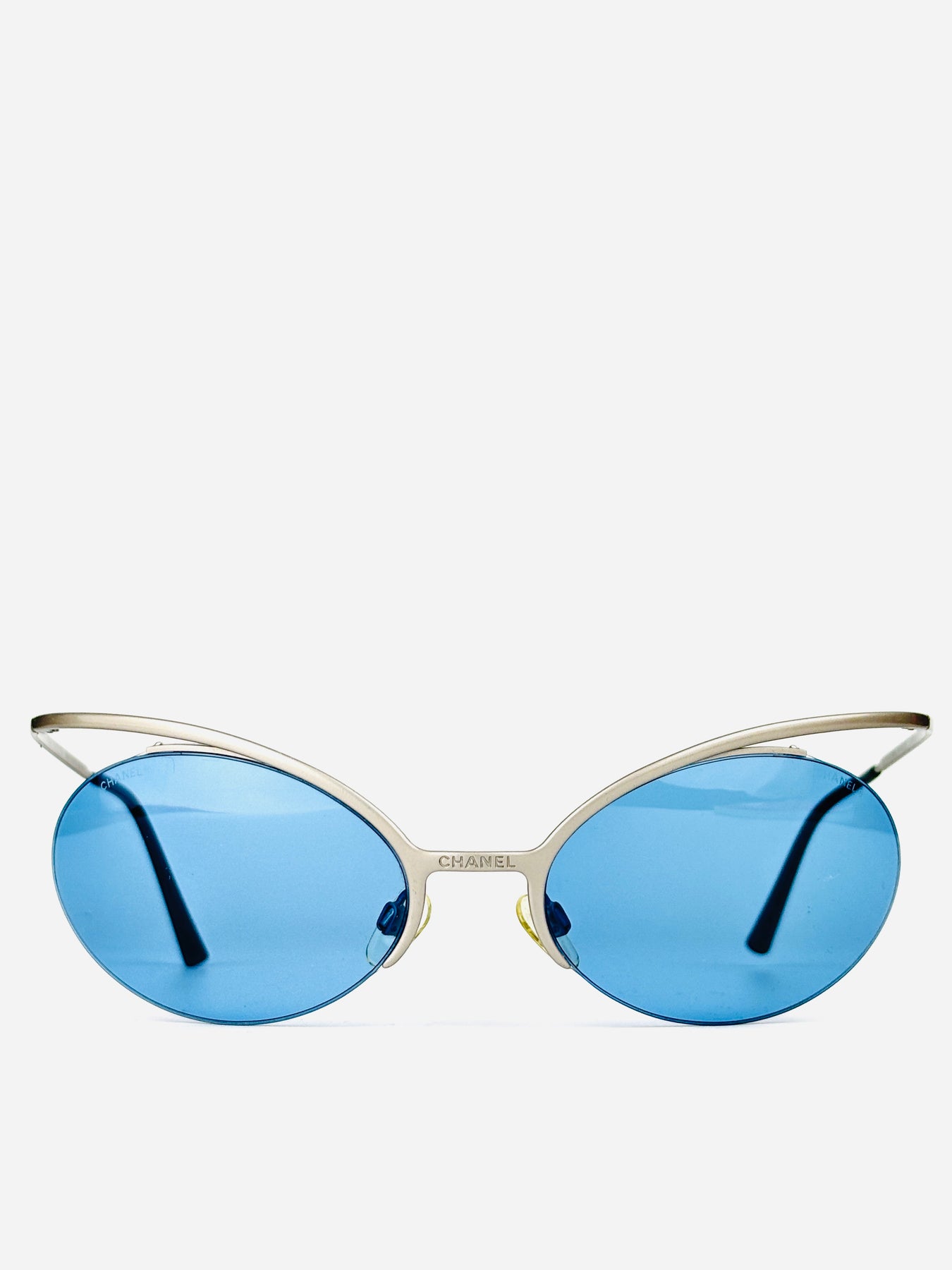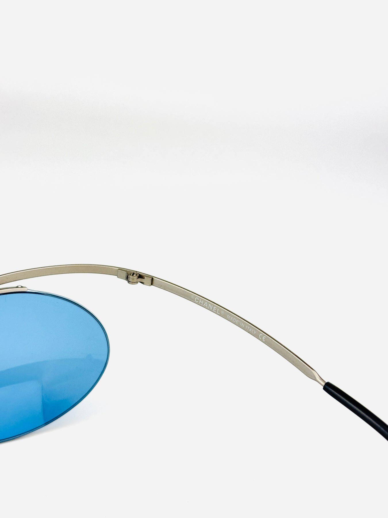 The frame combines a lightweight metallic structure with striking oval blue lenses, delivering a bold yet elegant Y2K aesthetic. The temples showcase discreet Chanel branding, and the rimless construction enhances the sleek, aerodynamic look. Condition is excellent, with only micro signs of vintage use.