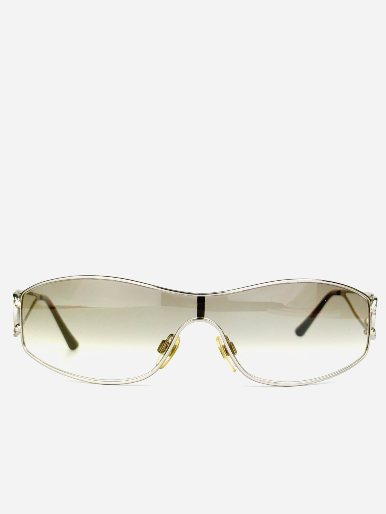 The rimless mask lens offers a soft grey gradient, framed by a light silver structure that keeps the look clean, futuristic, and incredibly elegant. Temples are slim, sculptural, and perfectly balanced, highlighting the jeweled CC emblem. Condition is excellent, with only minimal signs of wear that remain invisible when worn.
