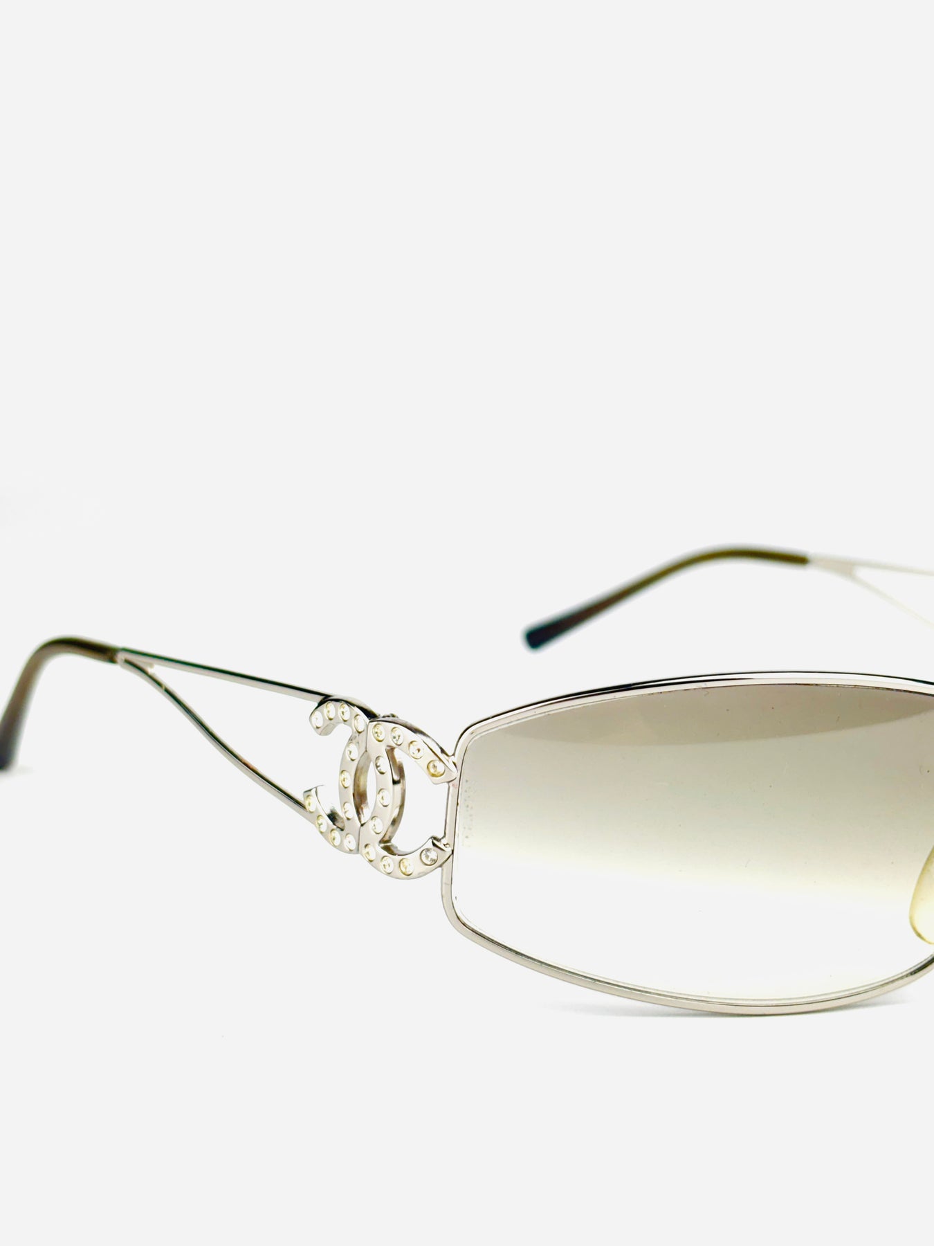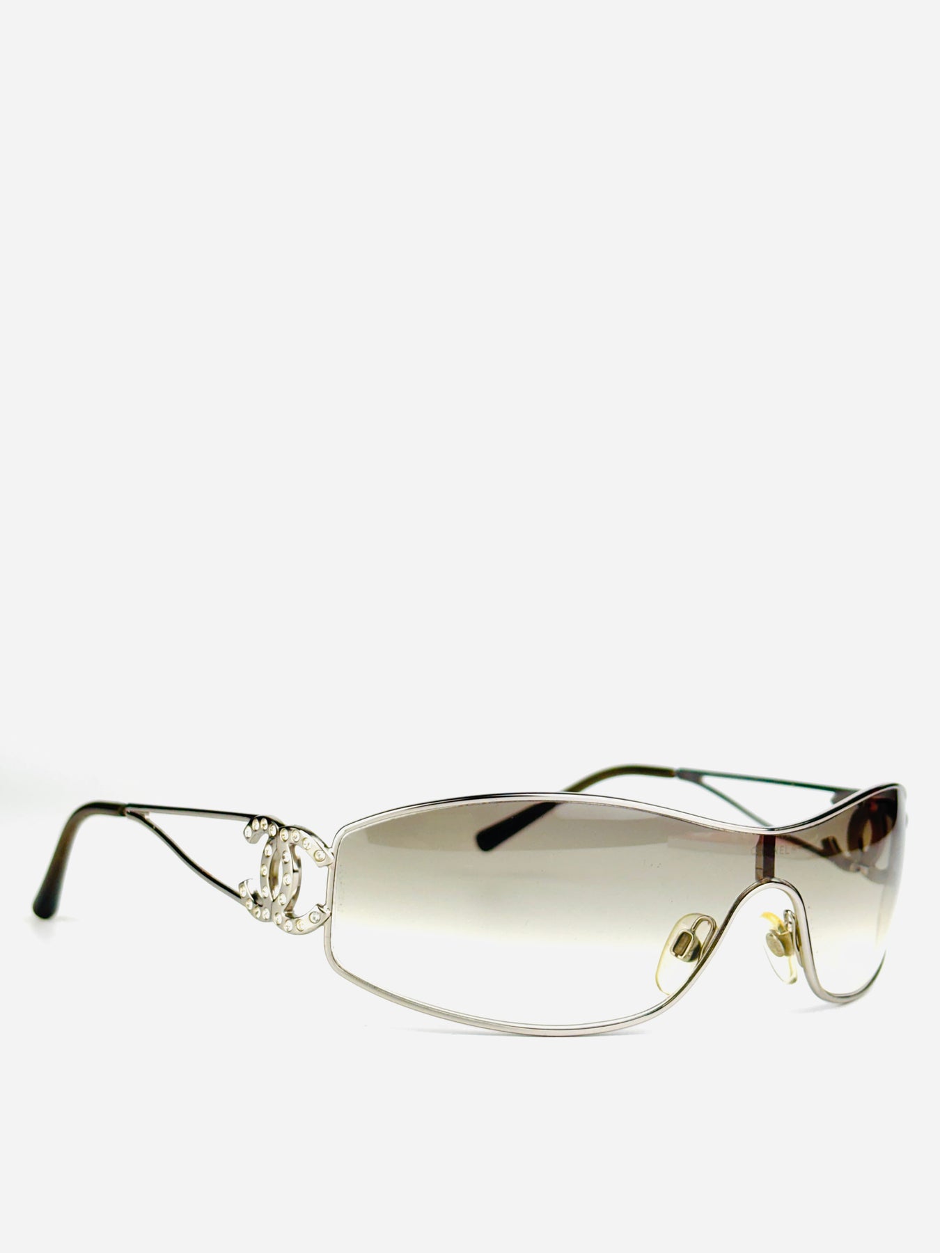 This ultra-rare CHANEL 4073-B from the early 2000s is a true collector’s gem. It features the iconic Y2K mask silhouette and the signature CHANEL double-C on the temples, adorned with delicate grey strass — an unmistakable detail from the house’s most coveted era.
