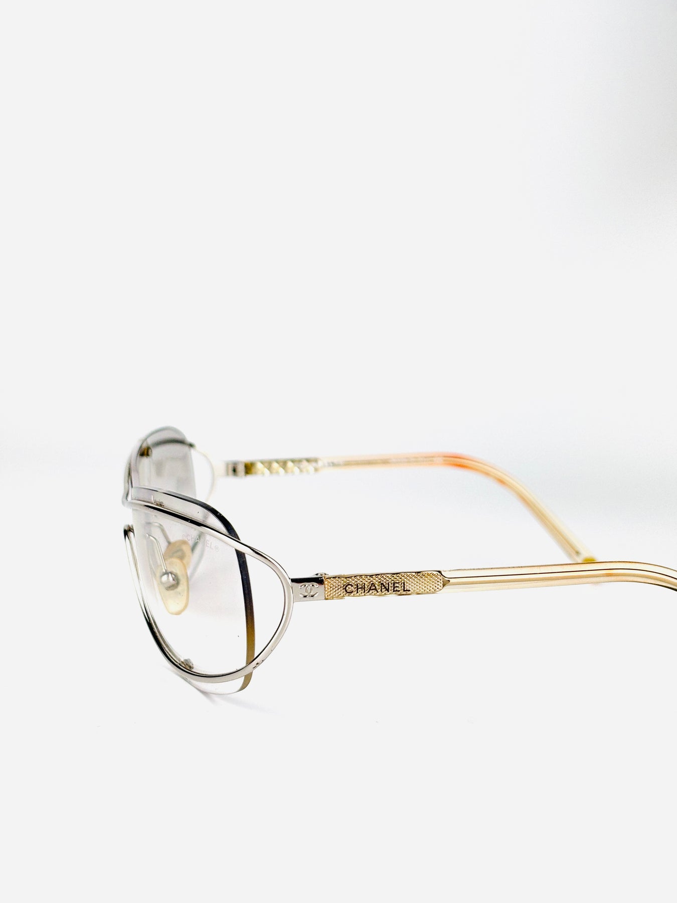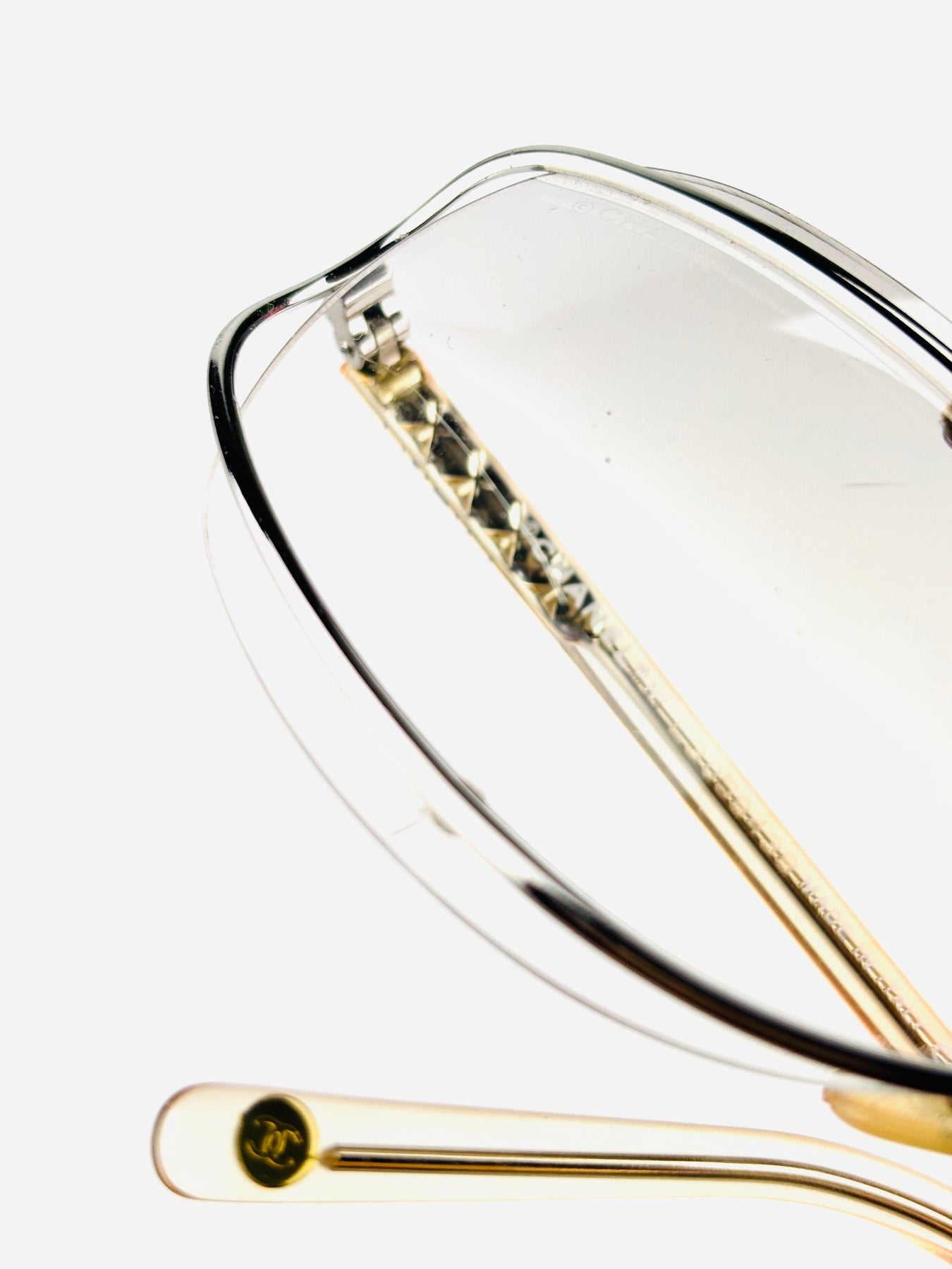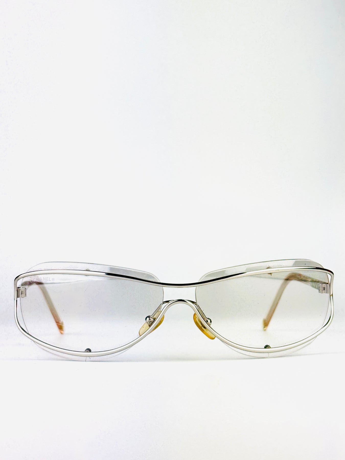 This version features a clear transparent lens paired with a thin metallic silver frame, highlighted by subtle golden temples — a true collector’s piece from the Y2K Chanel archive.