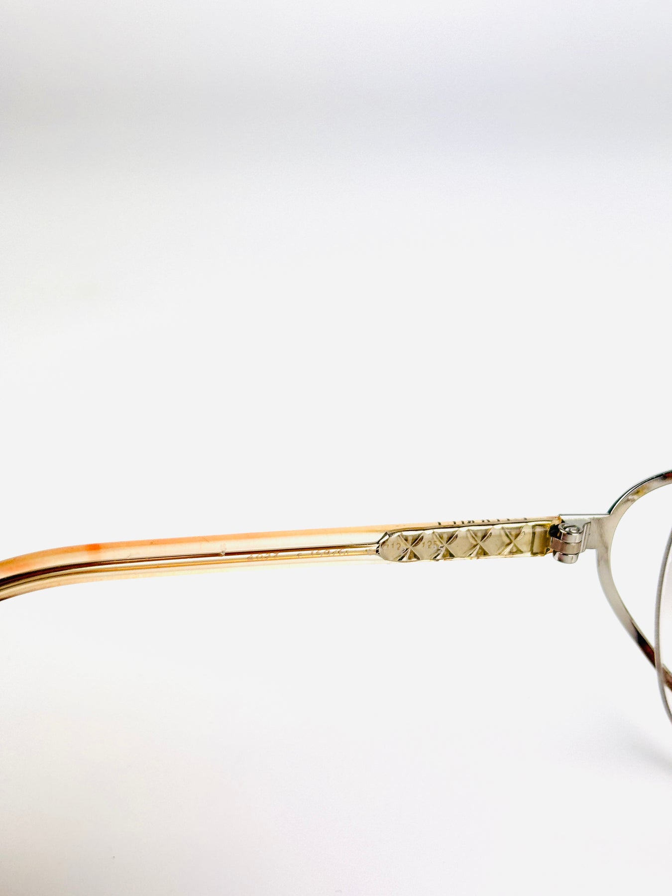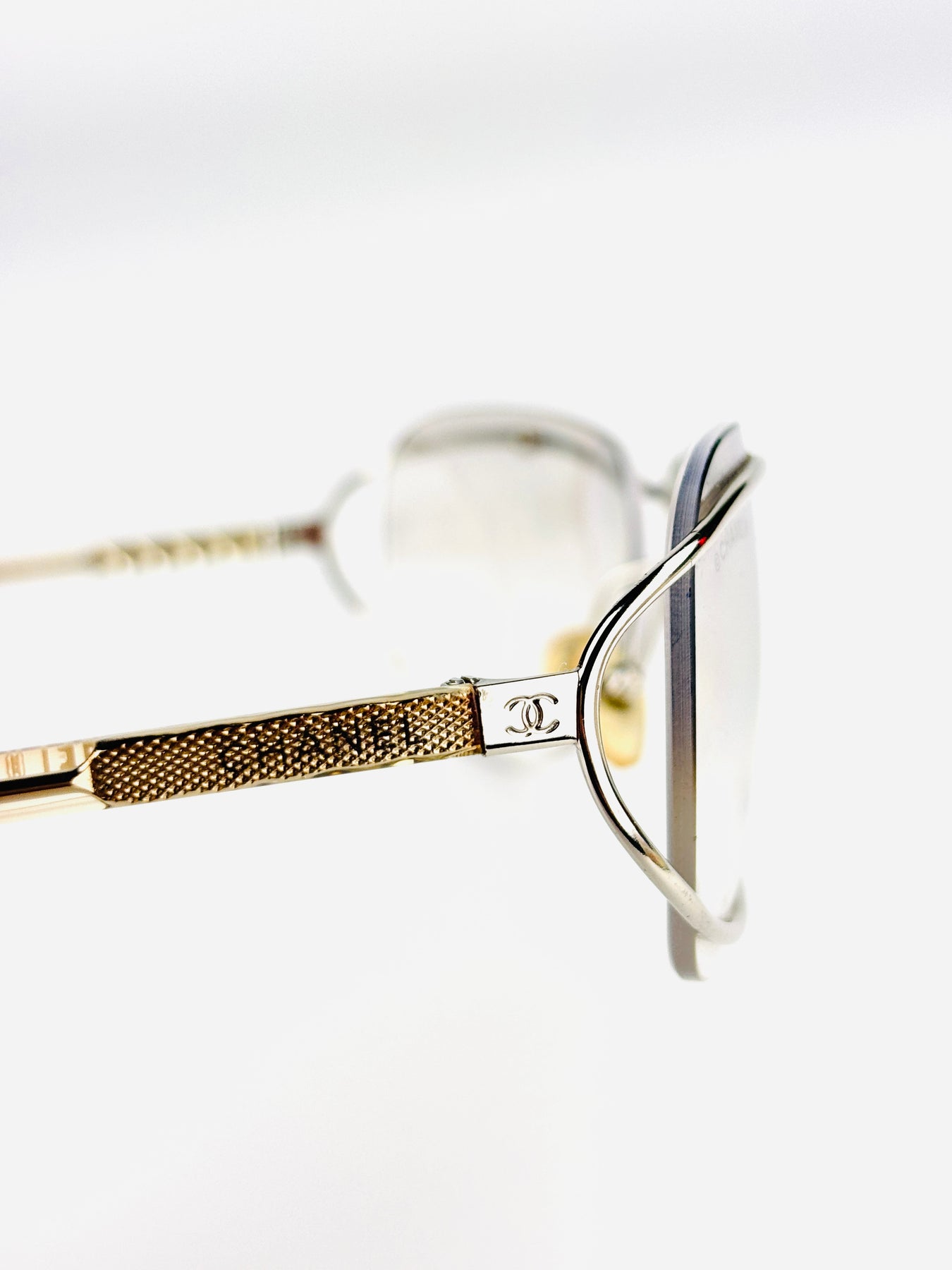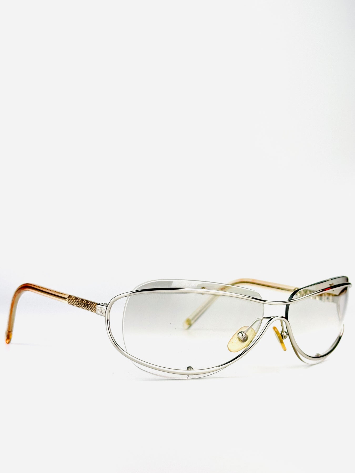 This version features a clear transparent lens paired with a thin metallic silver frame, highlighted by subtle golden temples — a true collector’s piece from the Y2K Chanel archive.