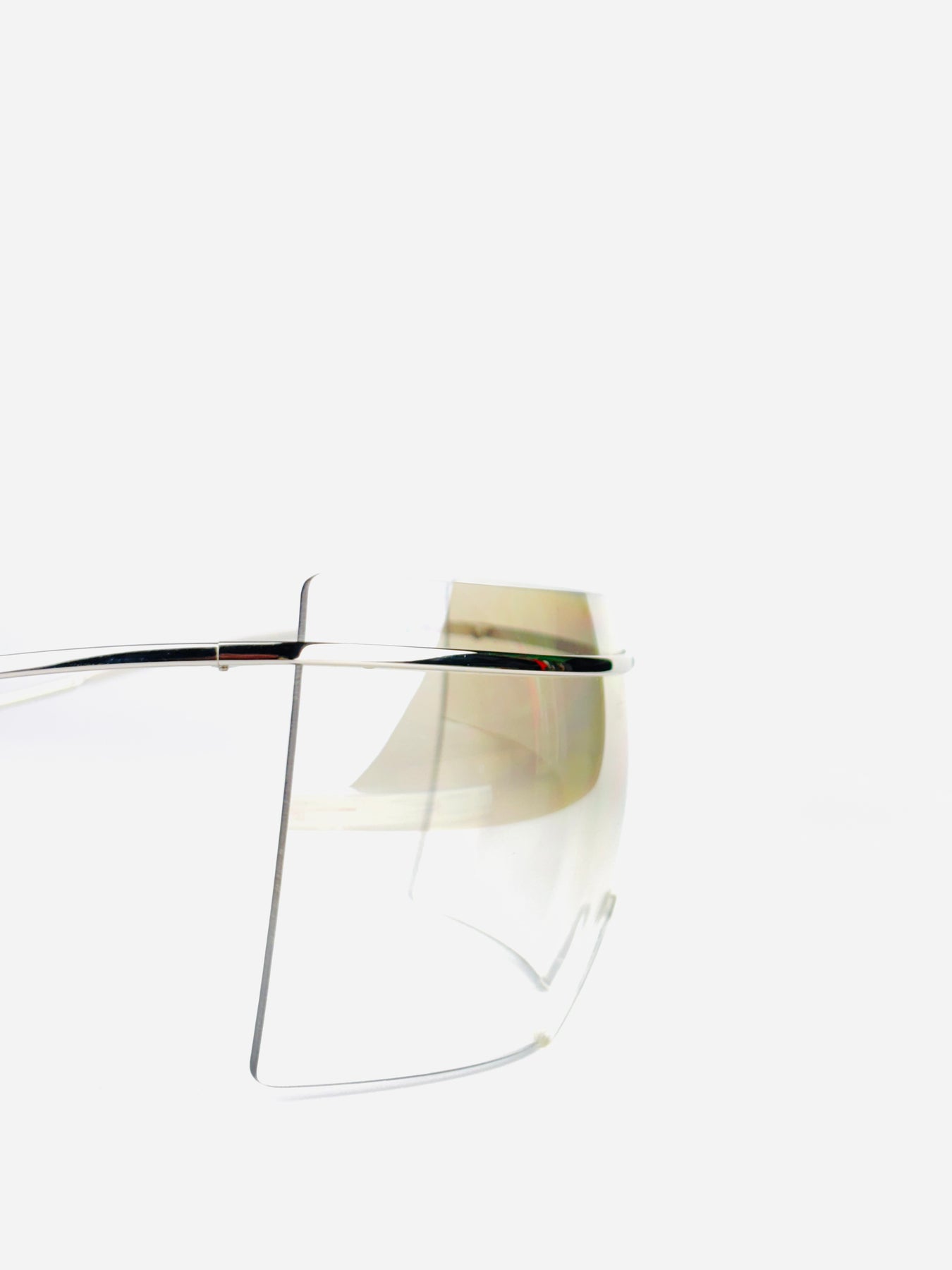 This ultra-rare transparent model features a single shield lens framed by a thin metal top bar, creating a bold and aerodynamic silhouette.