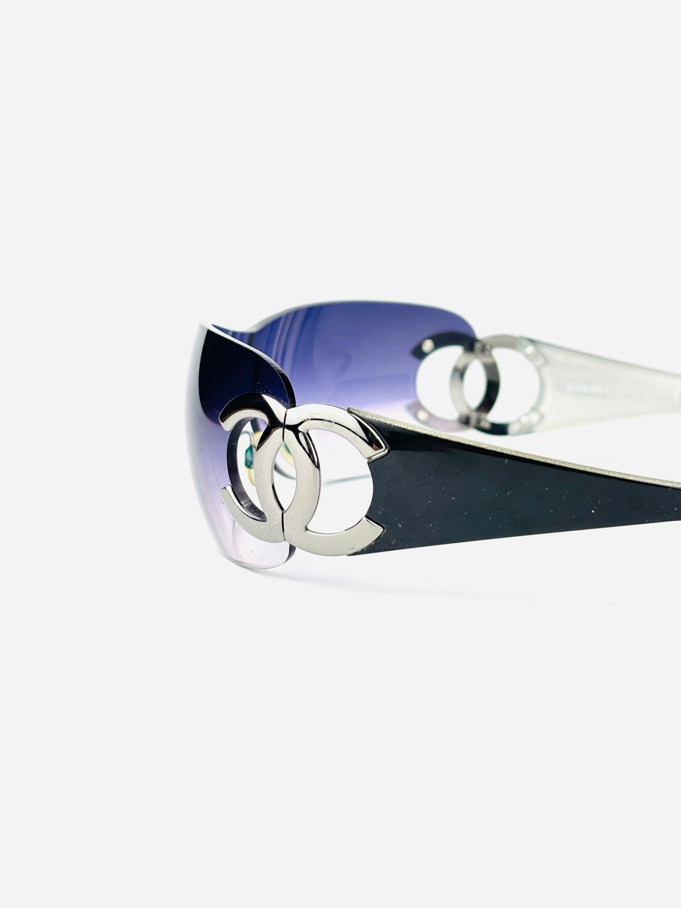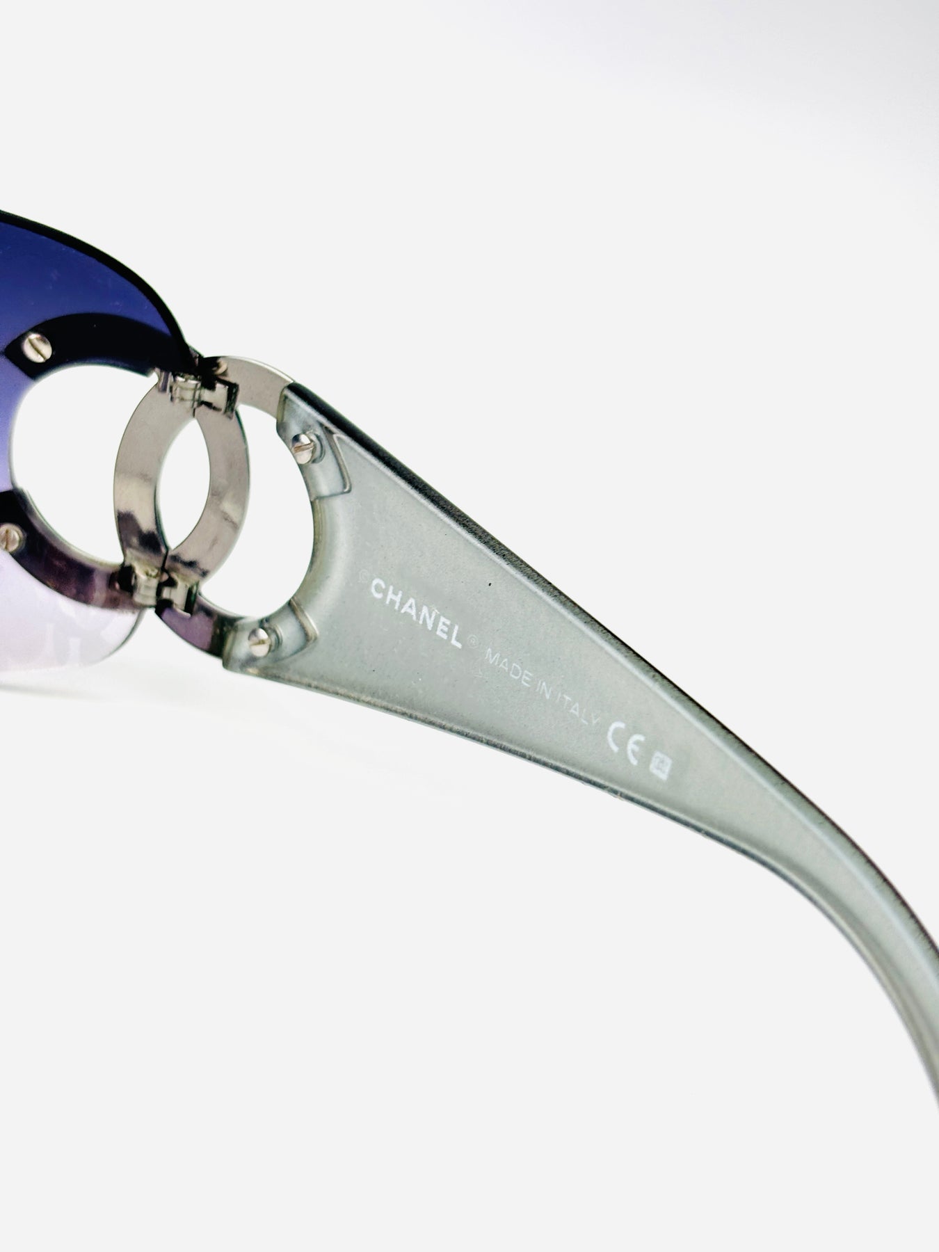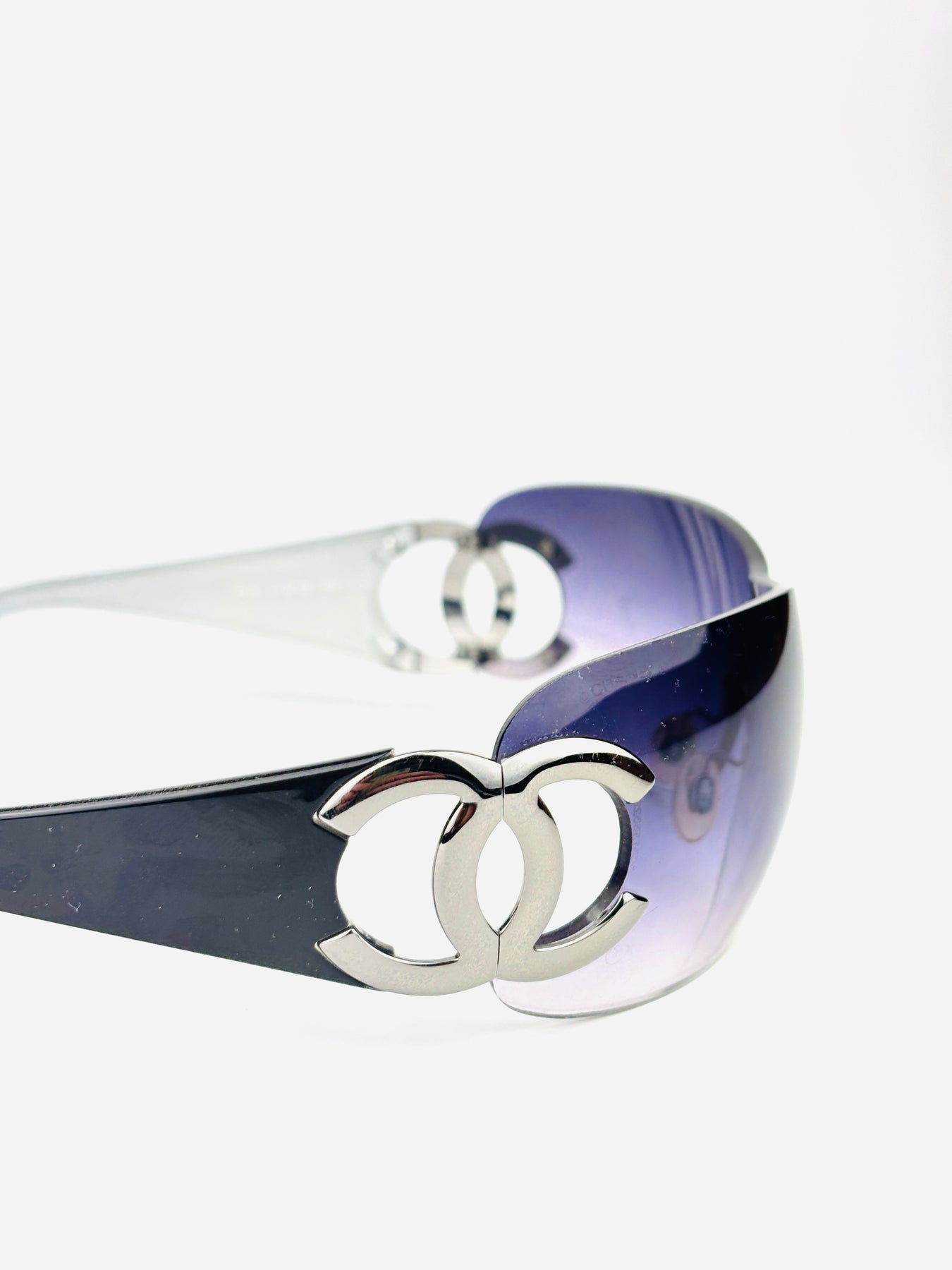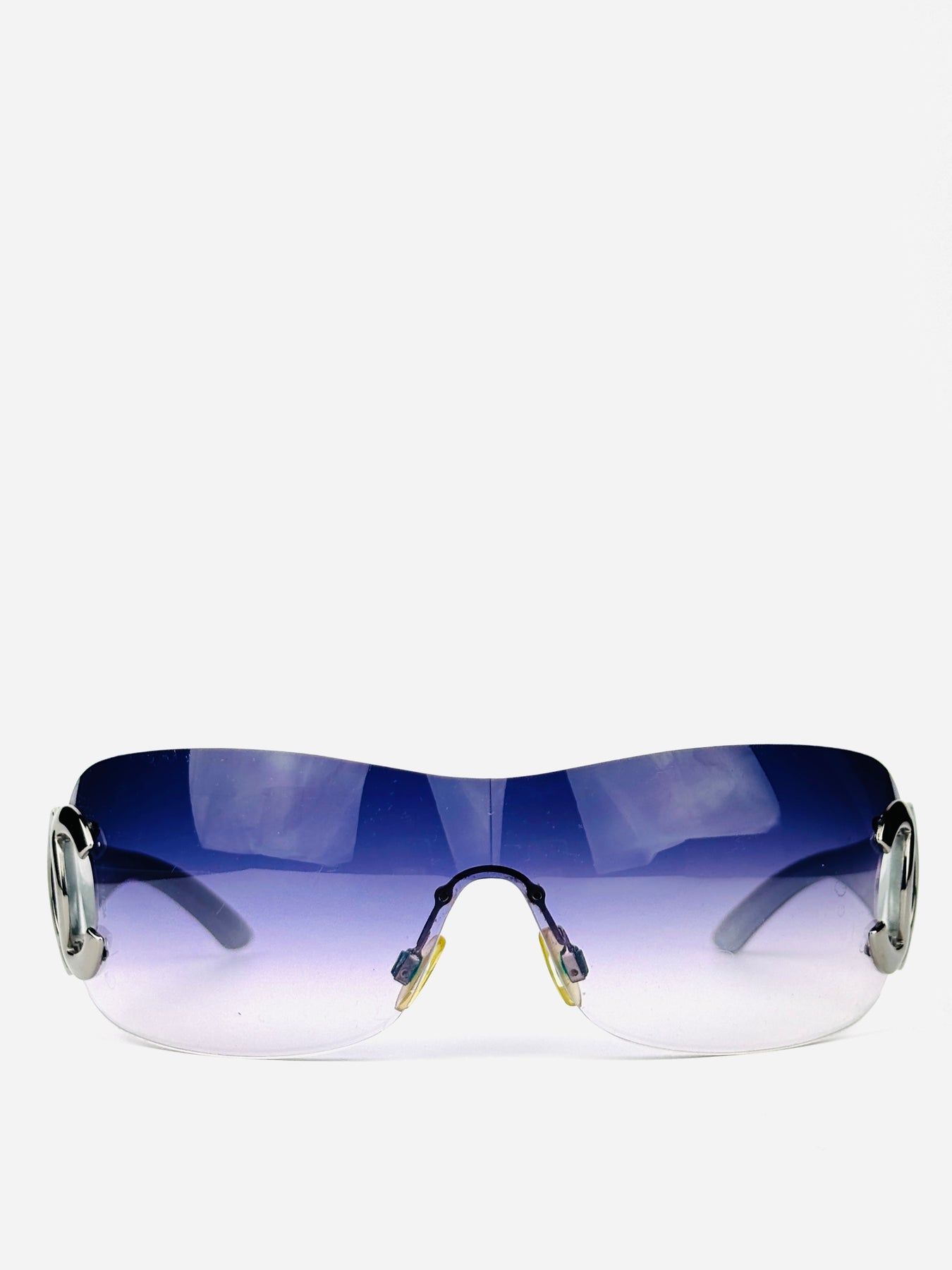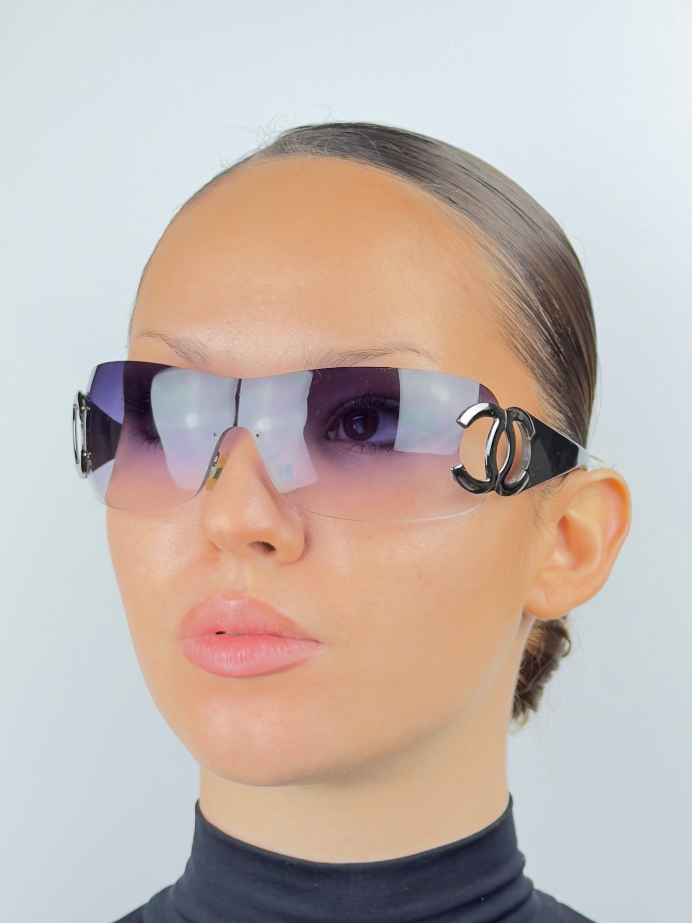 The Chanel 4125 is an iconic Y2K statement piece, instantly recognizable by its bold shield-style lens and oversized silver CC logo. The blue to white-violet gradient lenses create a dramatic, futuristic effect that defines early-2000s Chanel eyewear.