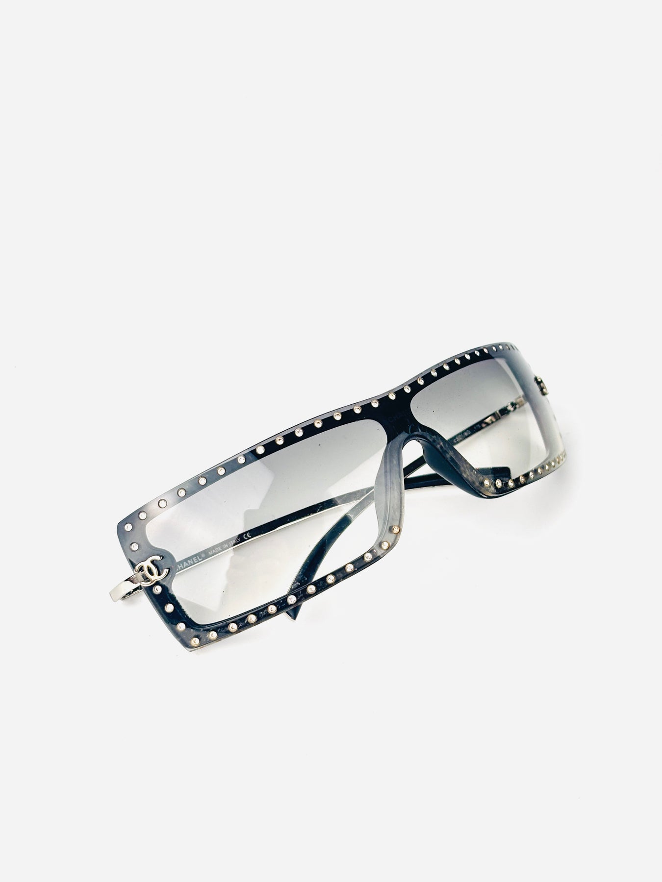 An iconic Chanel shield design from the Karl Lagerfeld era. This futuristic mask silhouette is framed with signature stud detailing and metallic structure — a true Y2K runway energy piece.