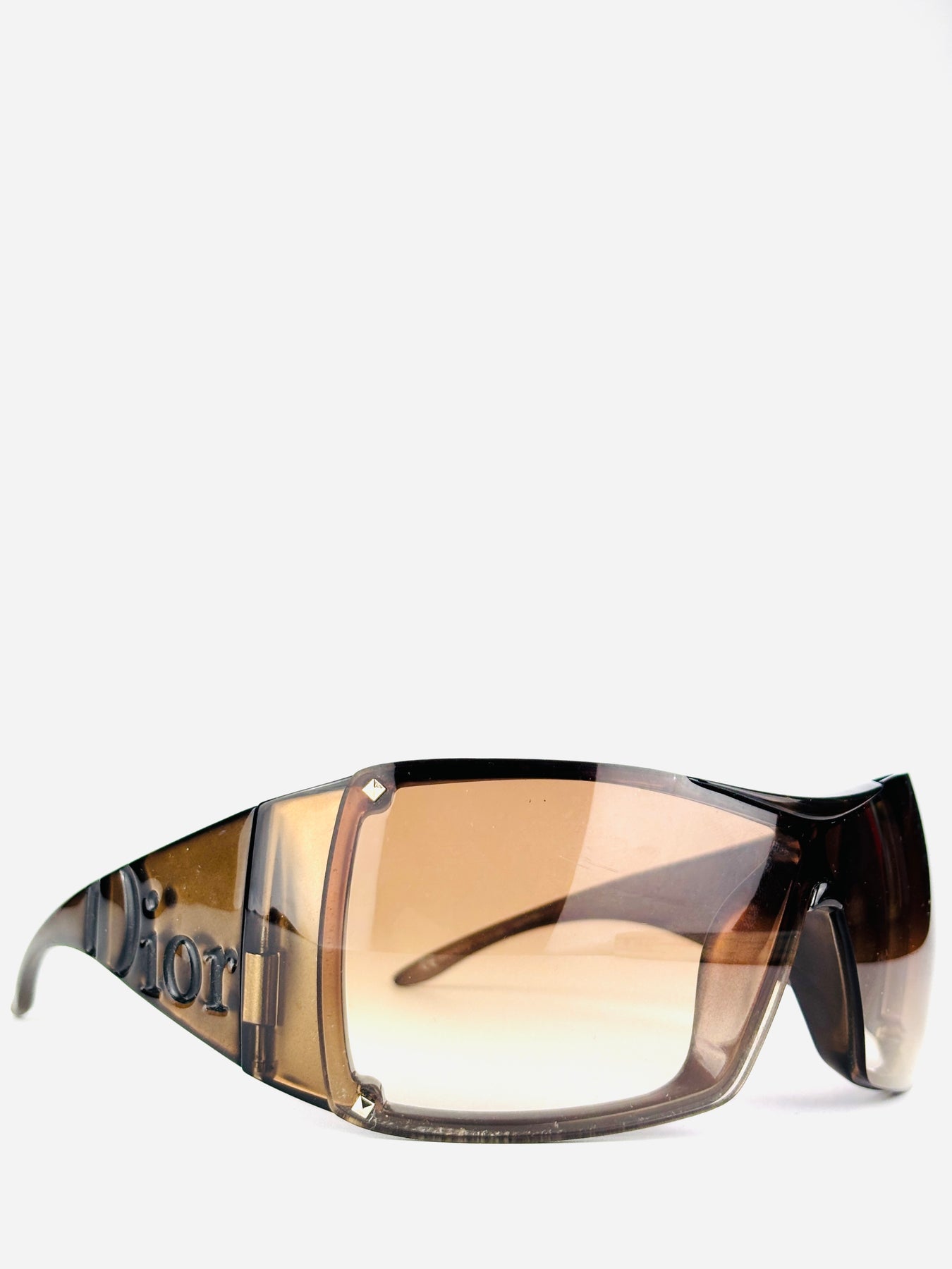 Featuring a brown translucent acetate frame with a large embossed Dior logo on the temples and brown gradient lenses, this piece combines glamour and attitude in pure Y2K style.
