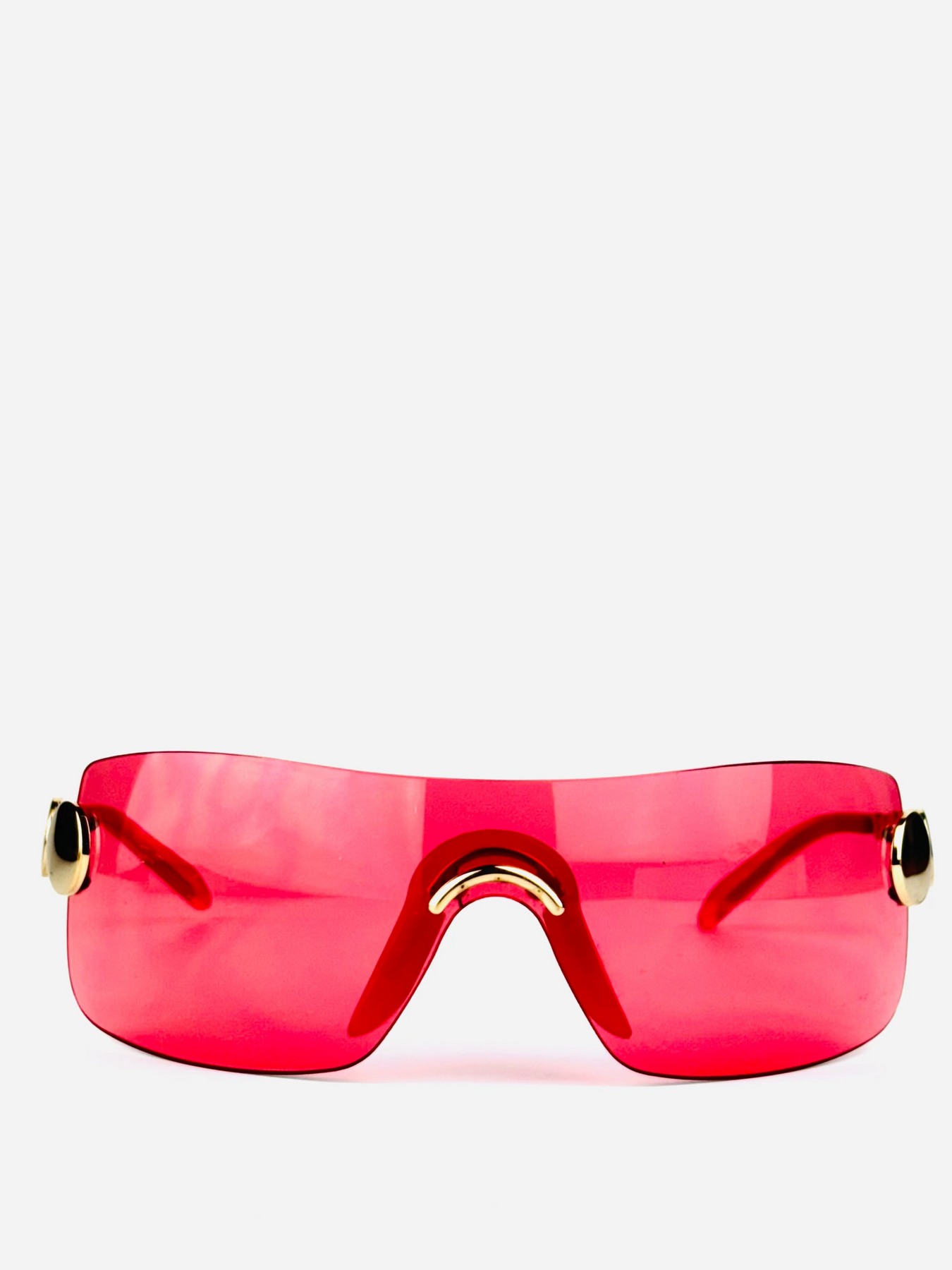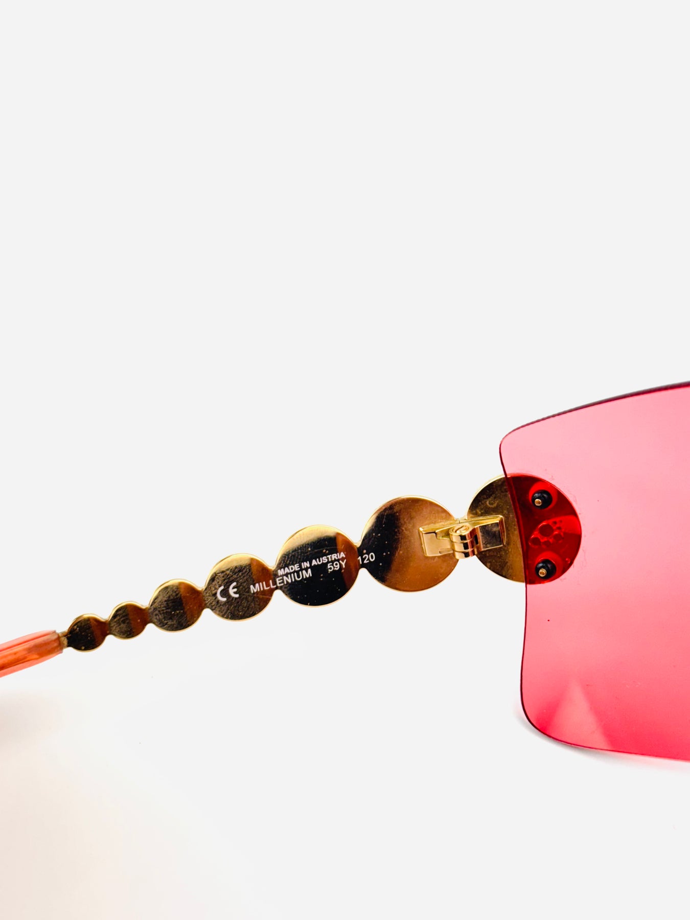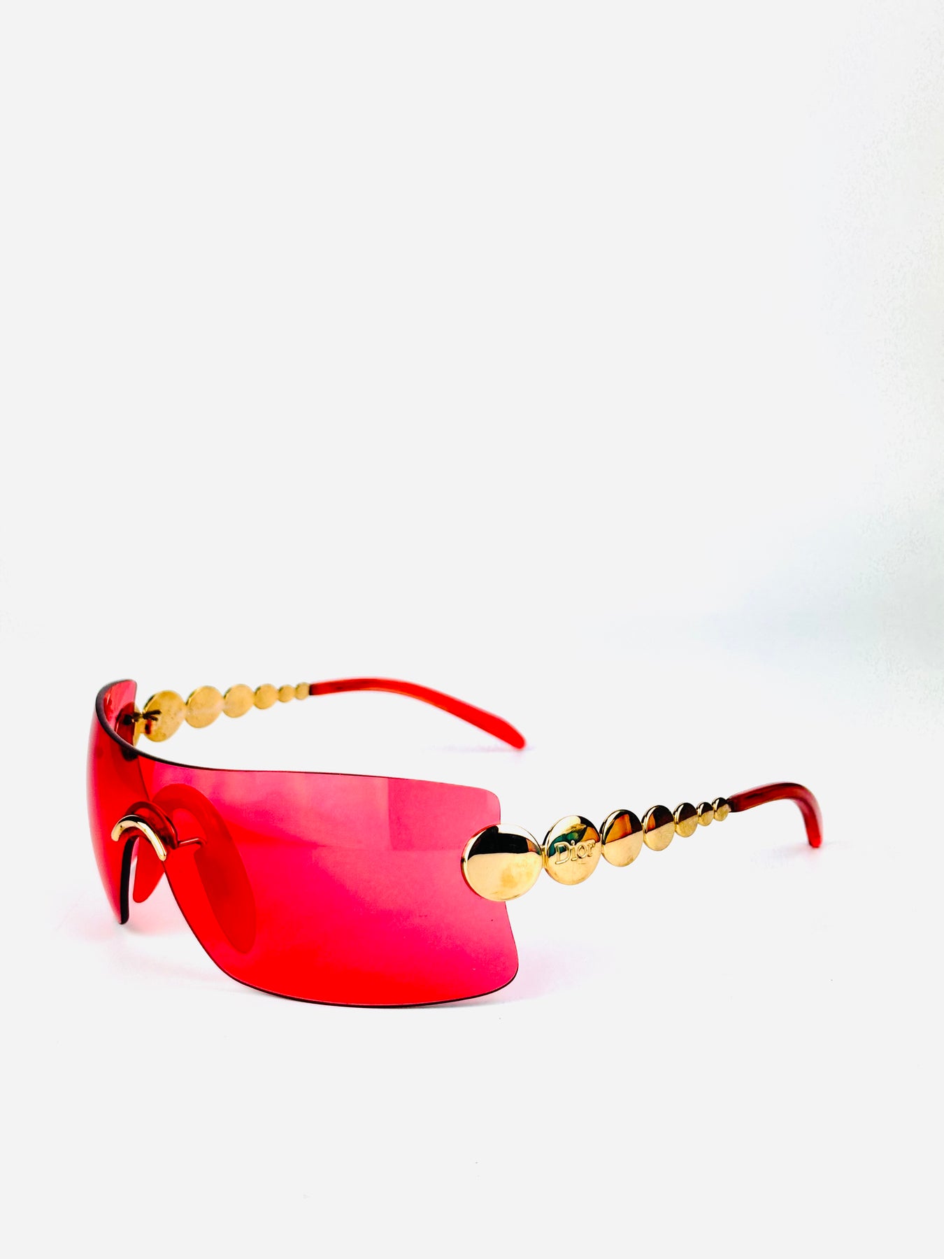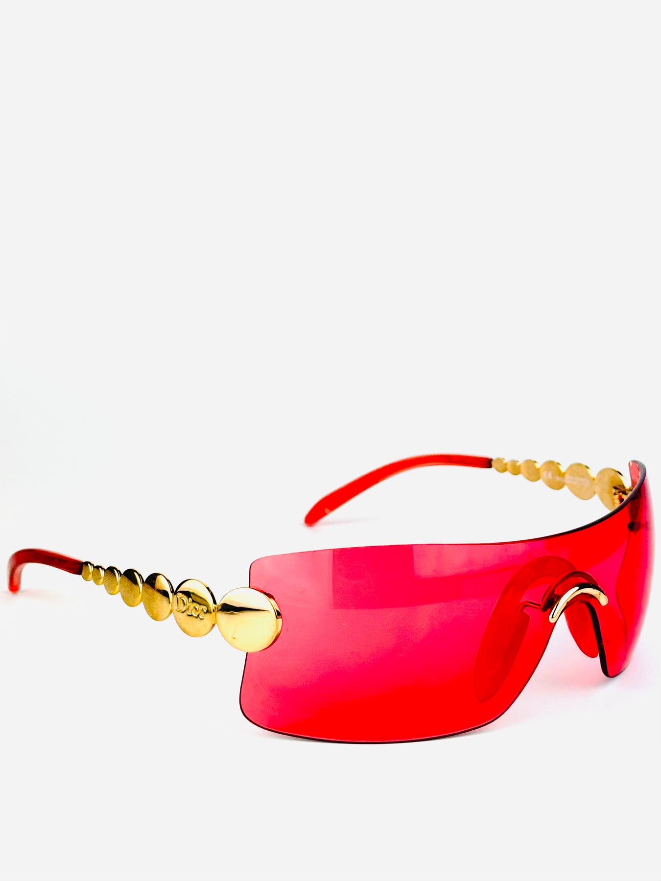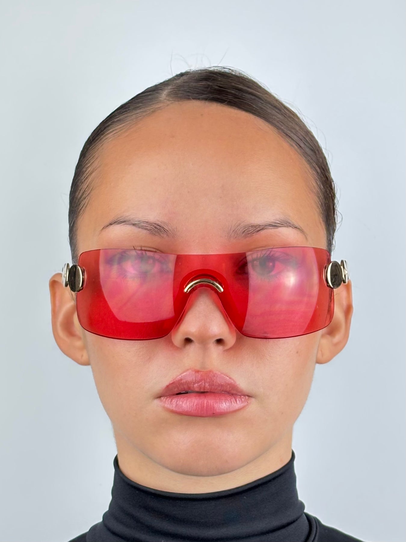 A striking and rare Dior creation from the early 2000s, the Rhuterium captures the bold energy of Galliano’s futuristic couture vision. The vivid red metallic front paired with golden sculpted temples creates a powerful, luxurious contrast — both fiery and elegant.