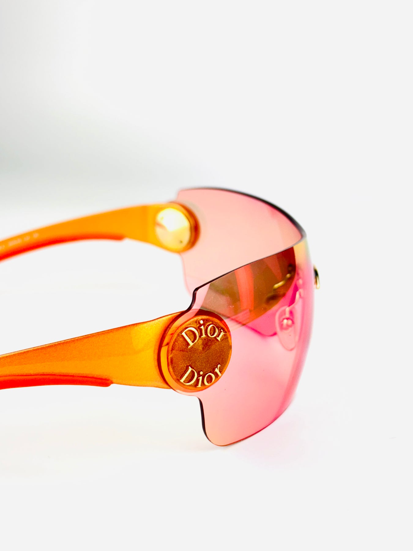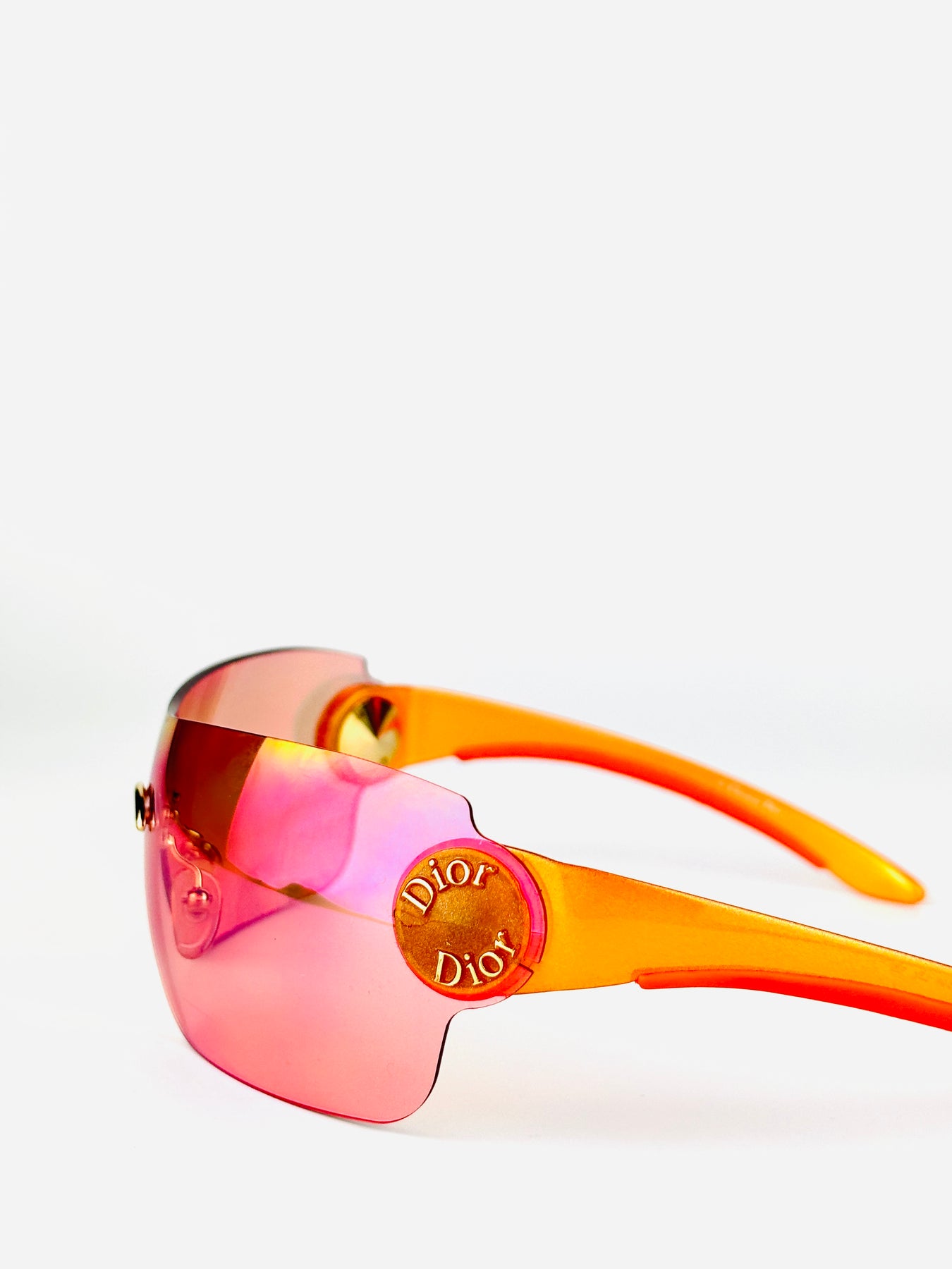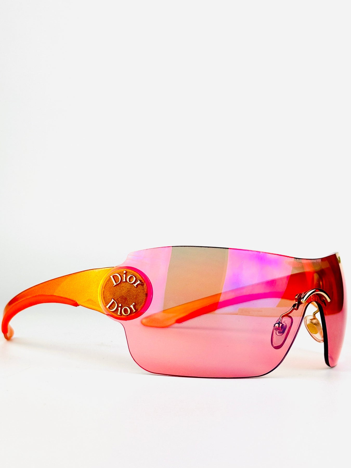 Their distinctive orange-to-red shield lens and sculpted frame make them one of the most collectible Dior designs of the decade.