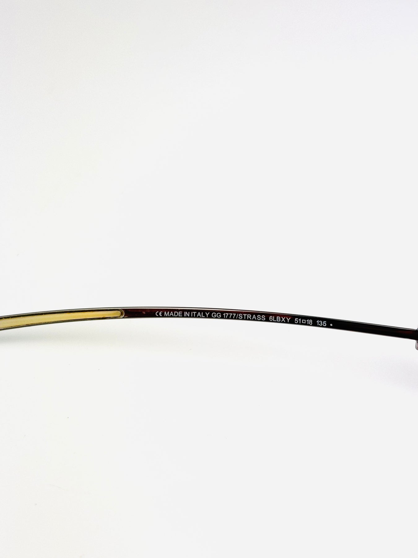 A rare and glamorous Gucci design from the Tom Ford era, the 1777 Strass features a sleek ruthenium metallic frame with crystal-encrusted “G” logos on each temple.