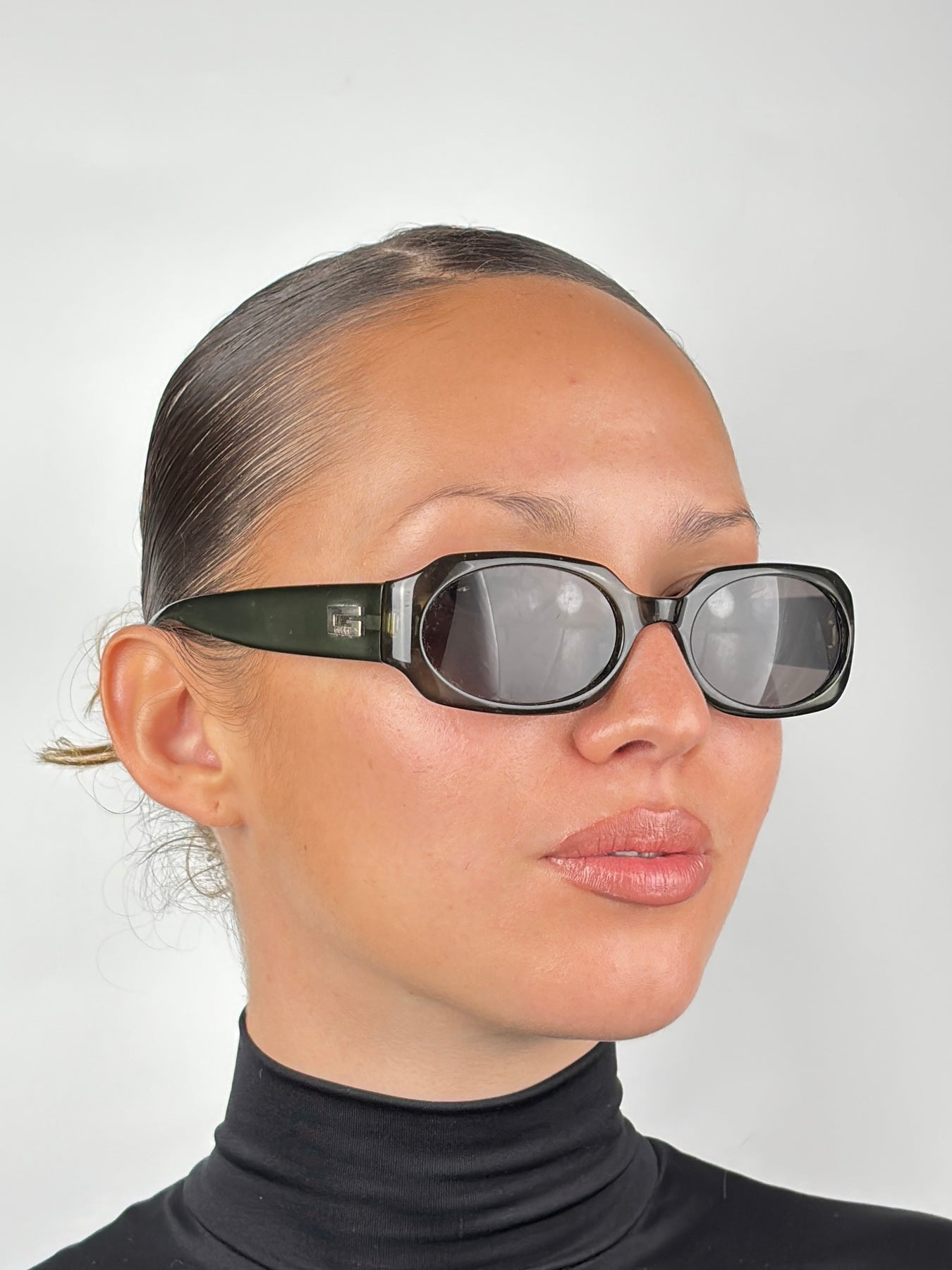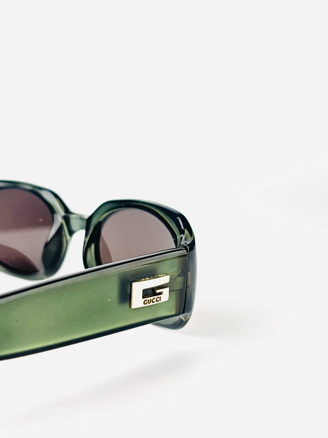 This Gucci 2436 features a beautifully sculpted green acetate frame paired with dark lenses. The iconic metal G logo detail enhances its strong Y2K silhouette. Very good vintage condition.