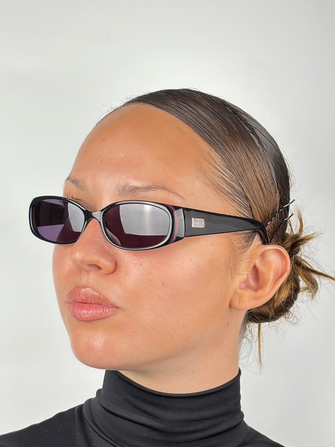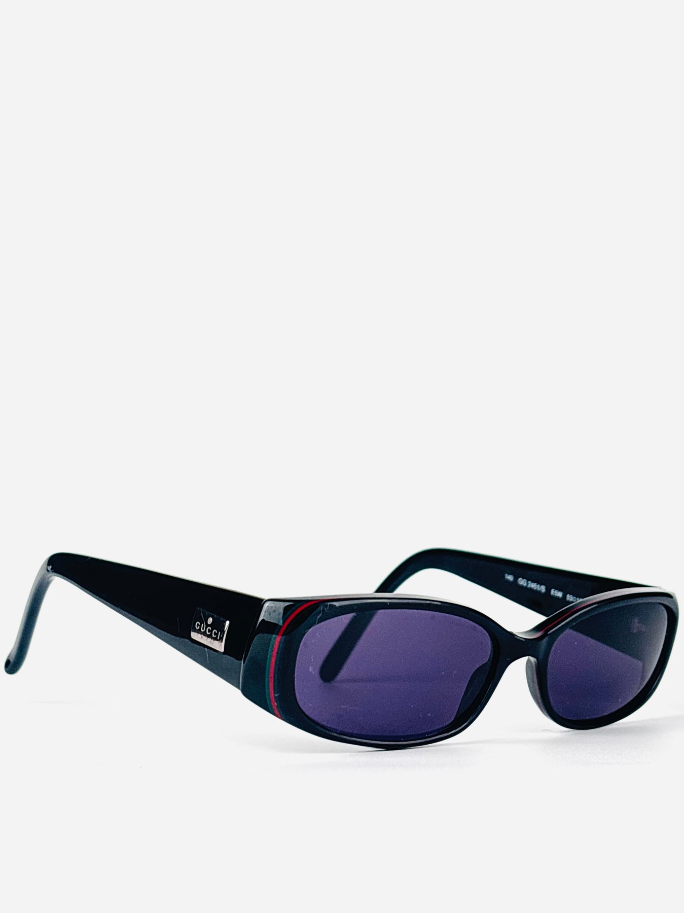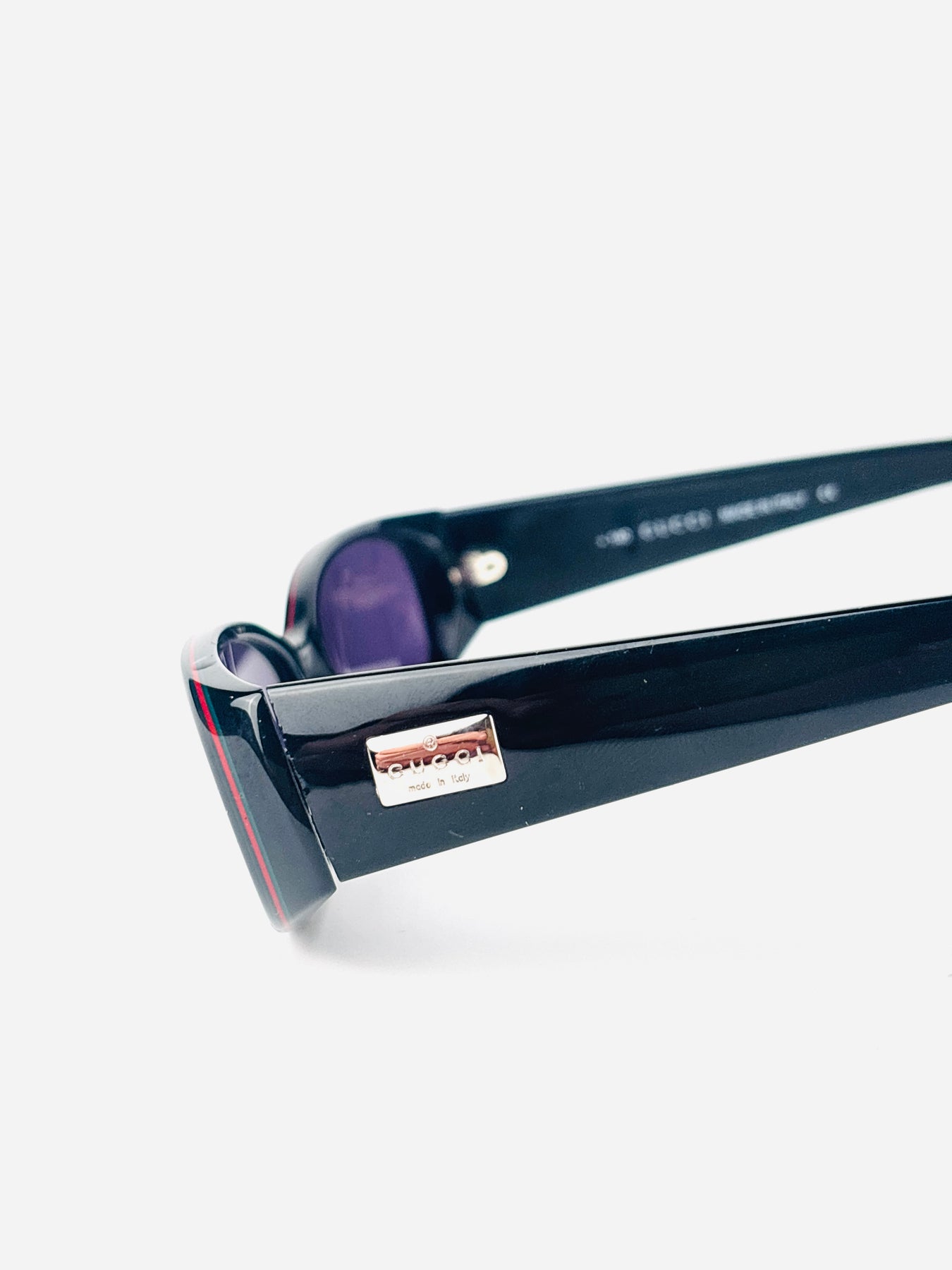 This Gucci 2451 showcases a black acetate frame paired with violet lenses. The signature green and red stripe detail adds an unmistakable Gucci heritage touch. Very good vintage condition.