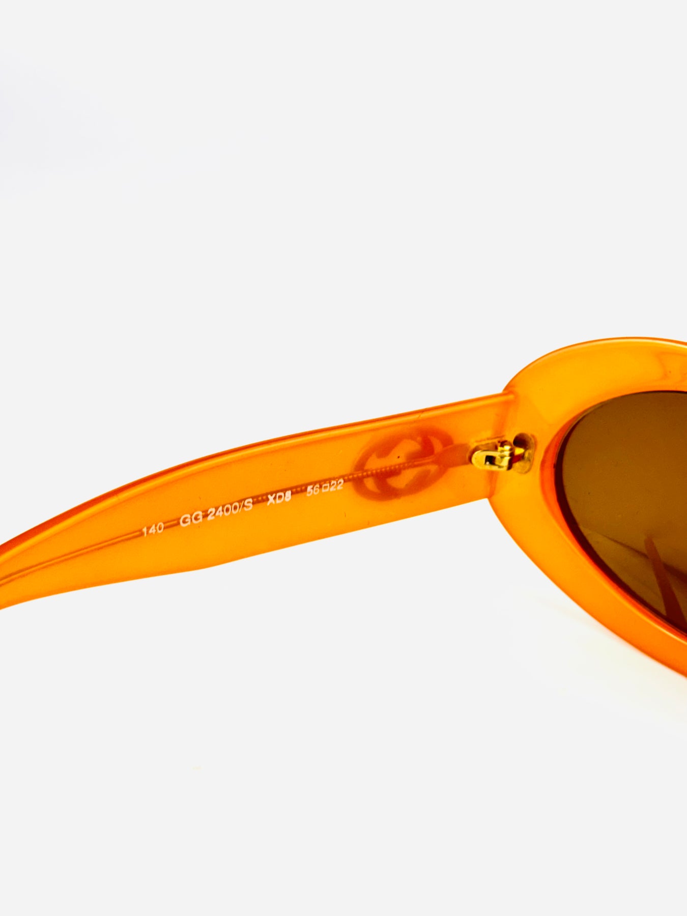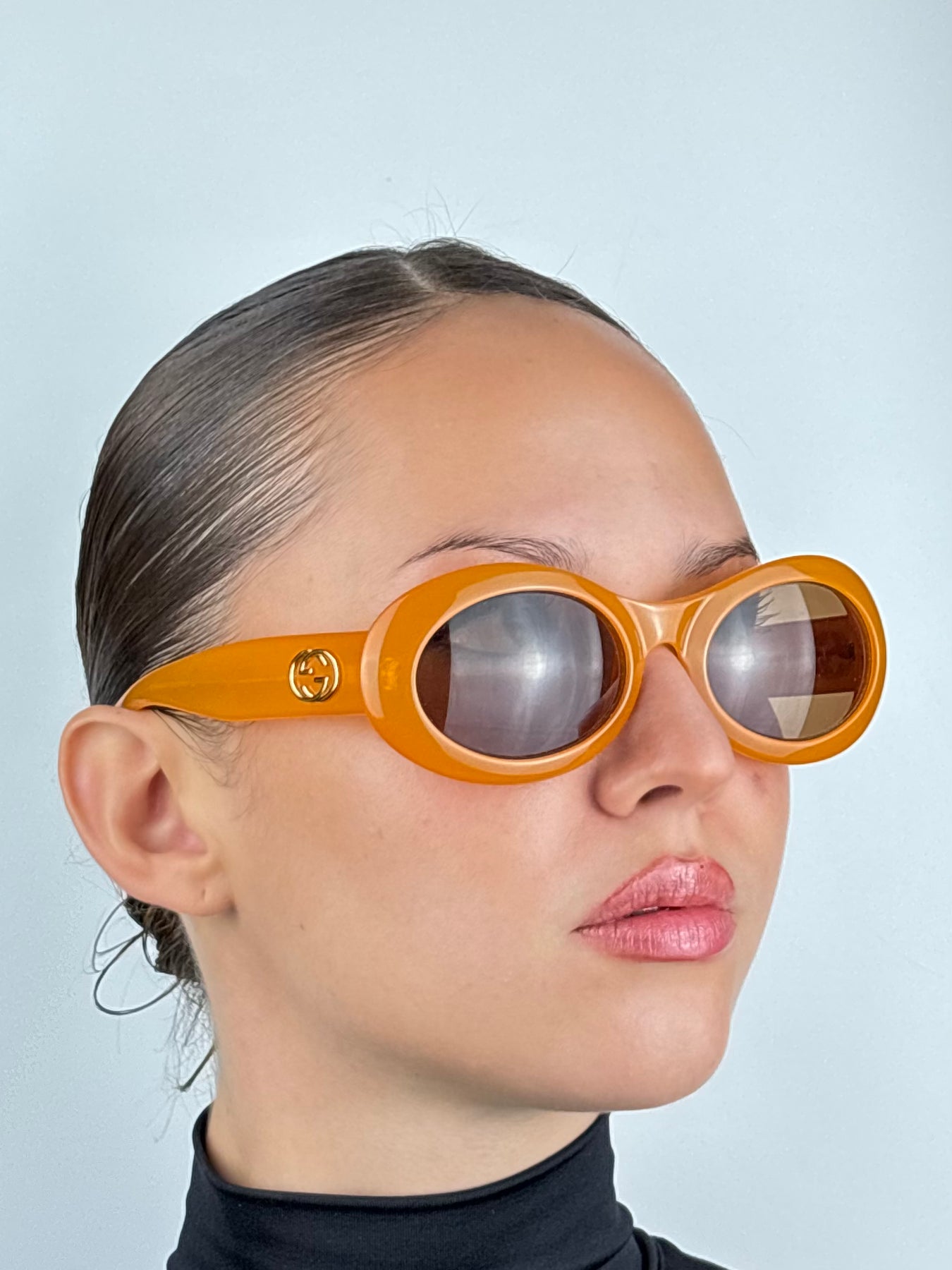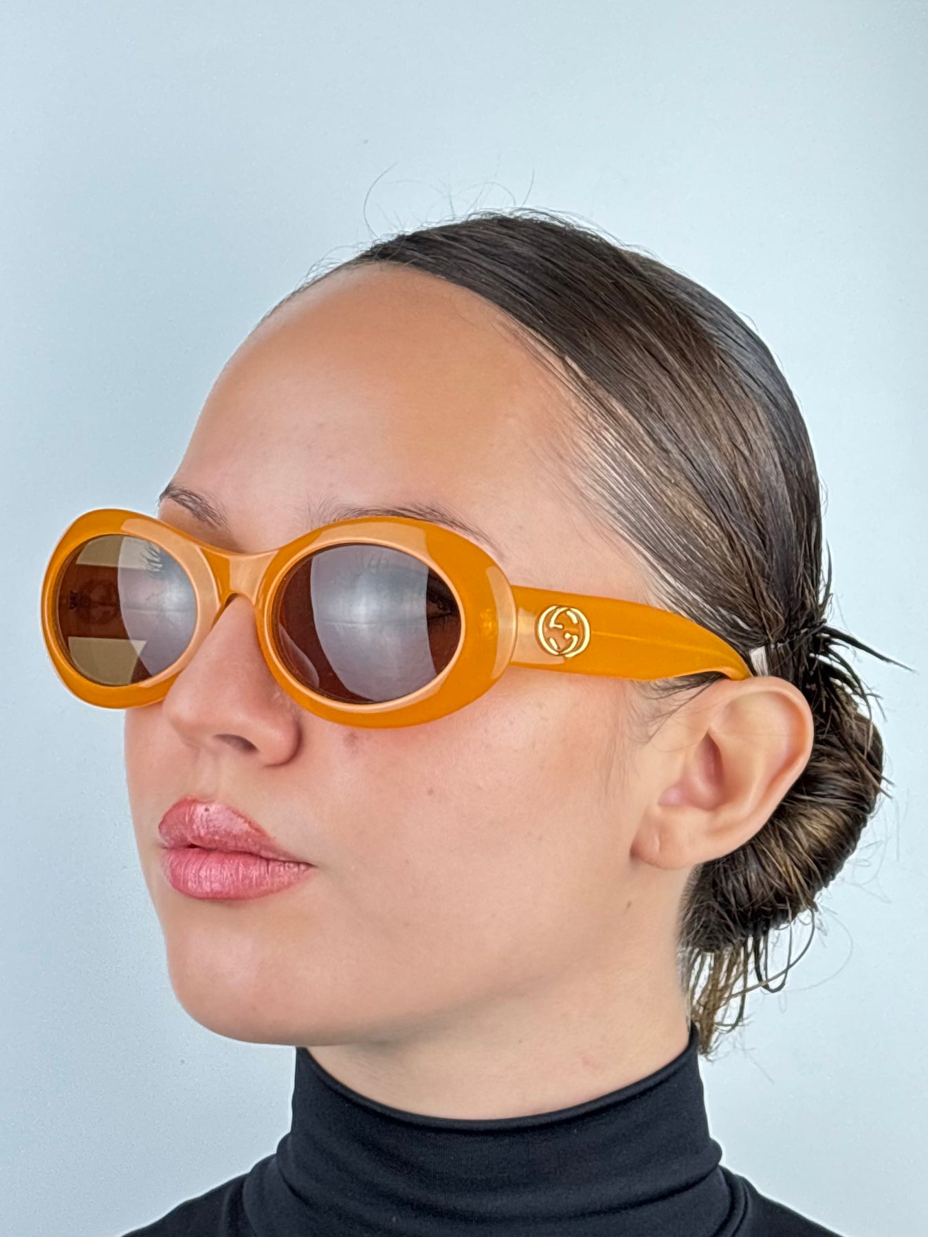 A rare and radiant Gucci frame from the 1990s, the 2400 stands out with its soft oval shape and translucent orange tone — a signature of Gucci’s warm and refined vintage aesthetic. Light, elegant, and full of personality, this model embodies the effortless charm of Italian eyewear design.