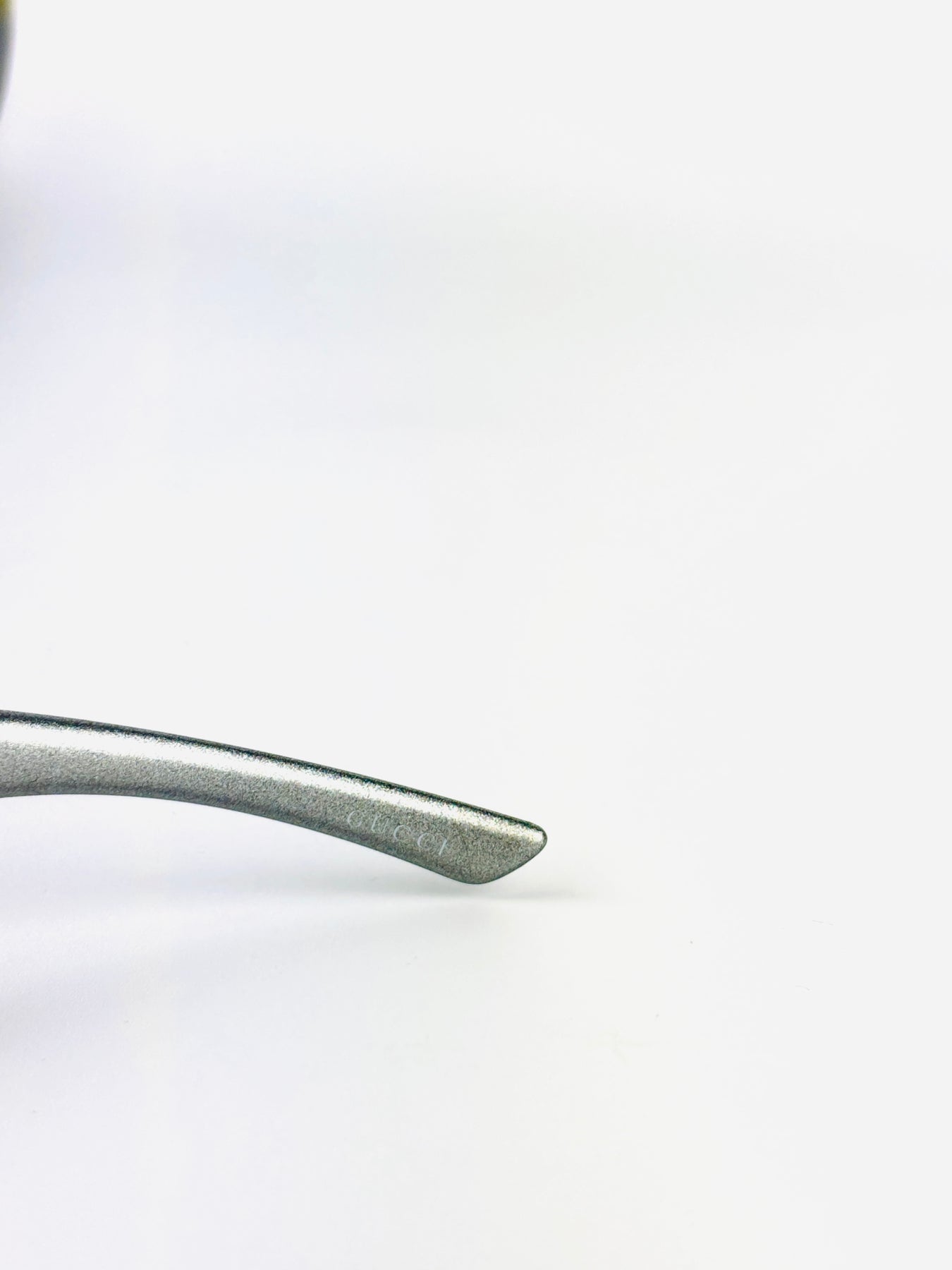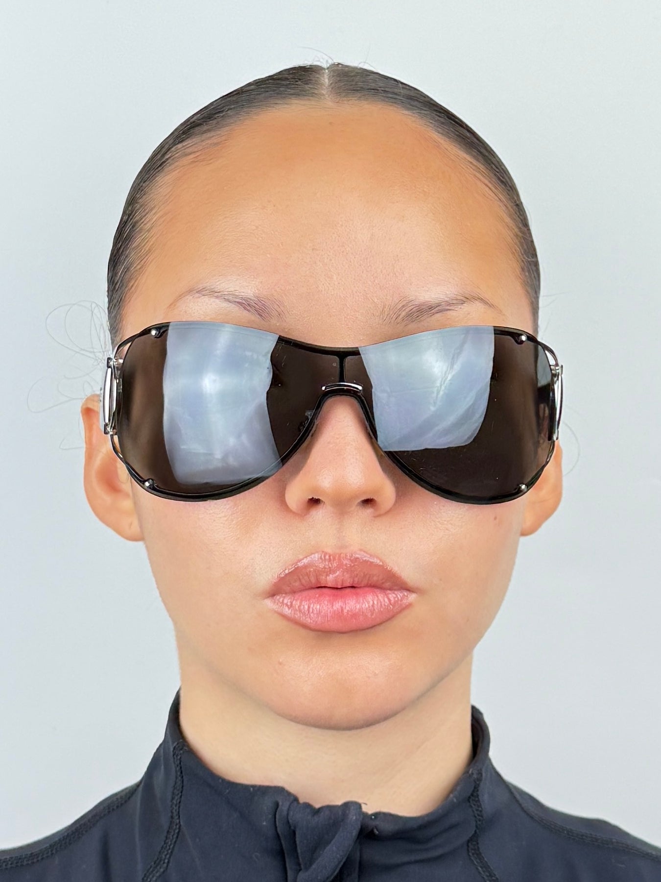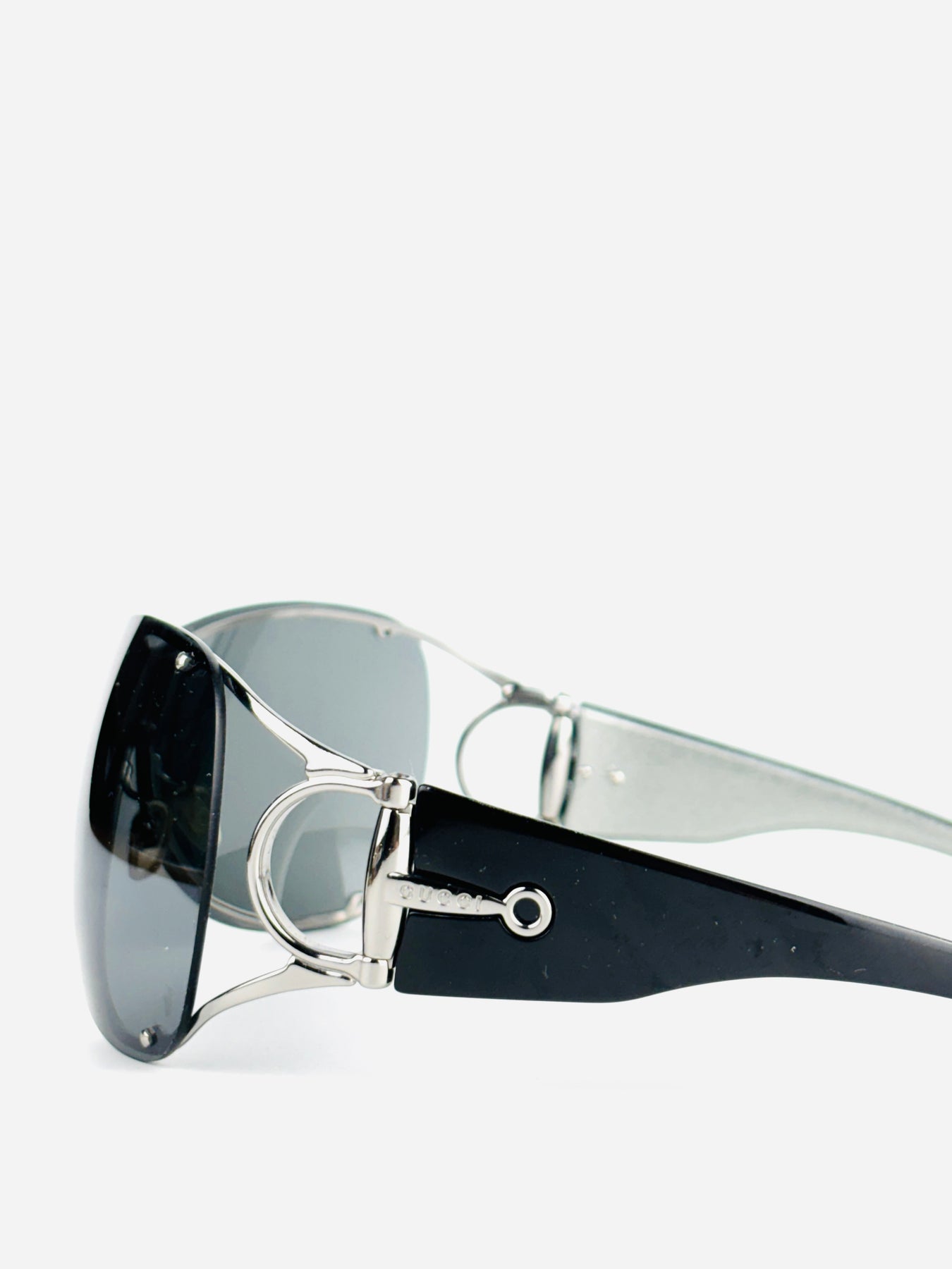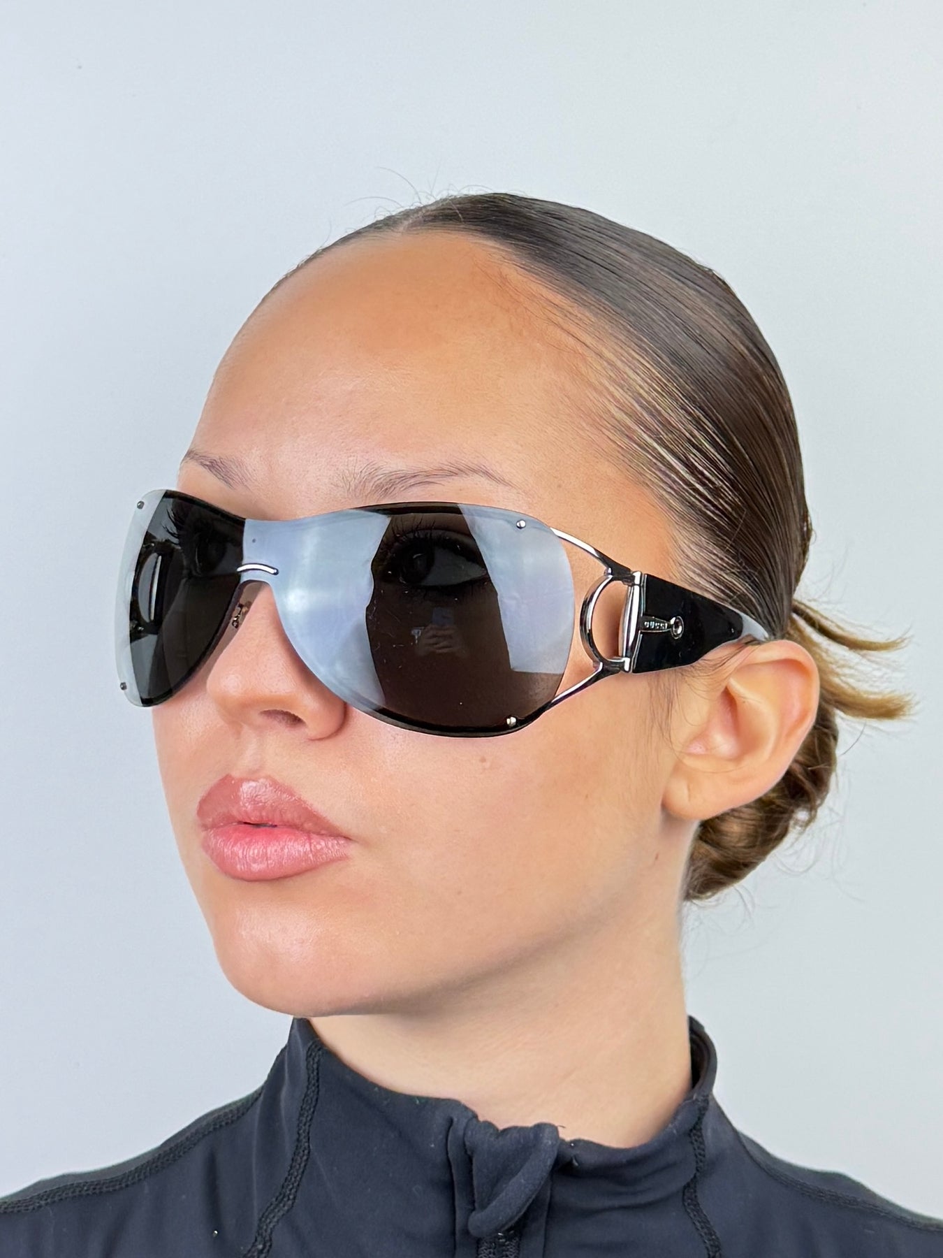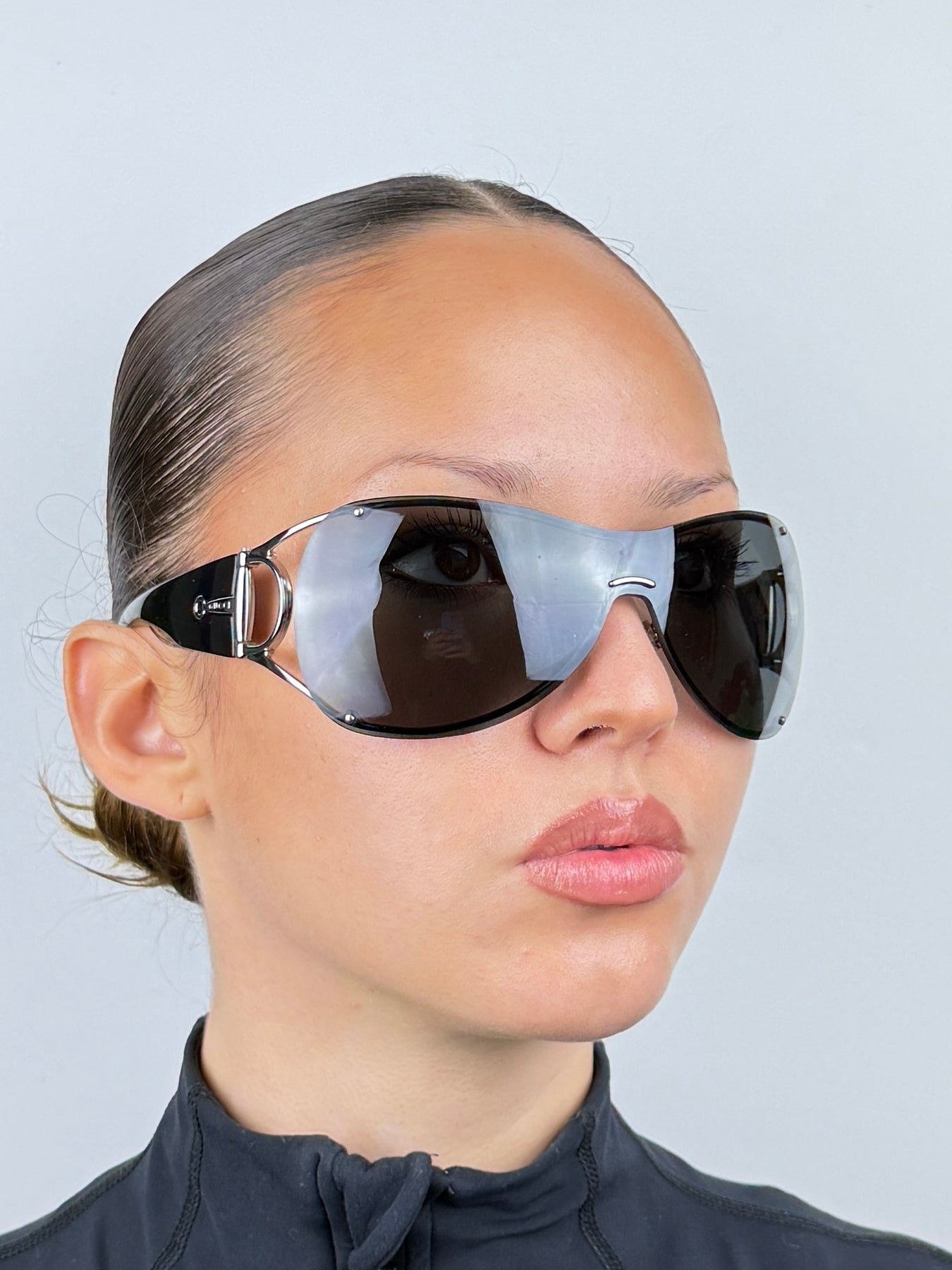 The Gucci 2764 is a bold, sculptural mask with a sleek black wraparound silhouette — a strong representation of Gucci’s futuristic Y2K aesthetic. The large grey lens is secured with metallic rivets and contrasted with polished black acetate temples featuring the Gucci emblem.