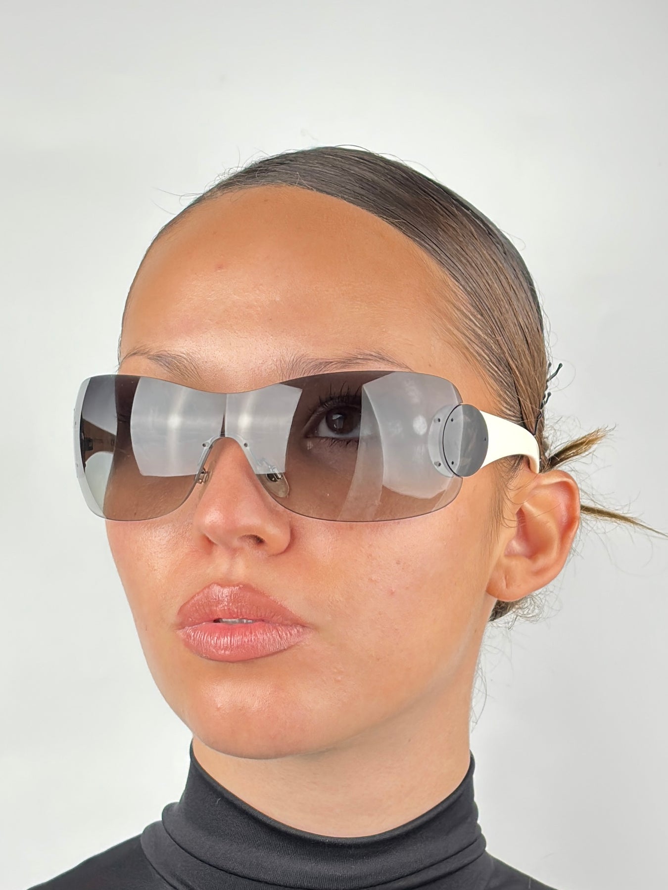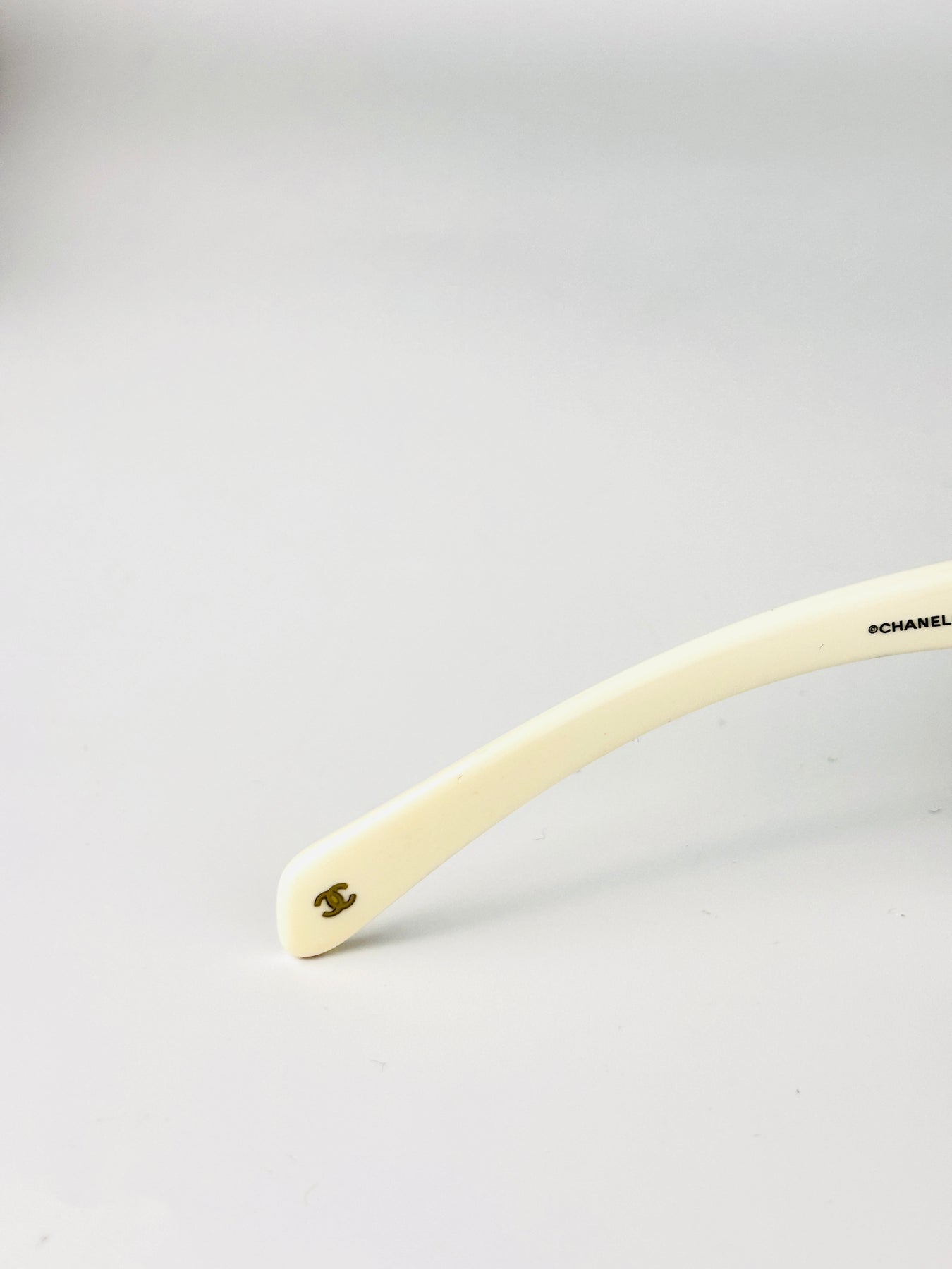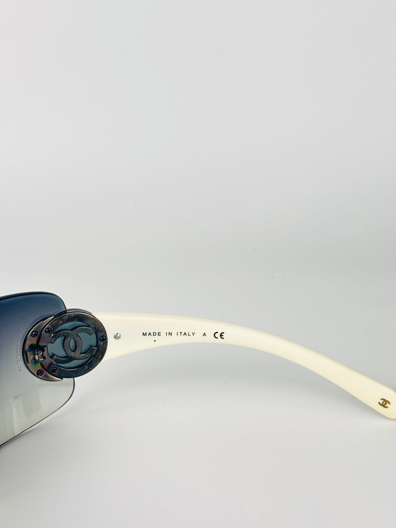 White frame paired with soft grey gradient lenses. Black CC logo integrated into the lens design. Feminine and modern silhouette. Very good condition.