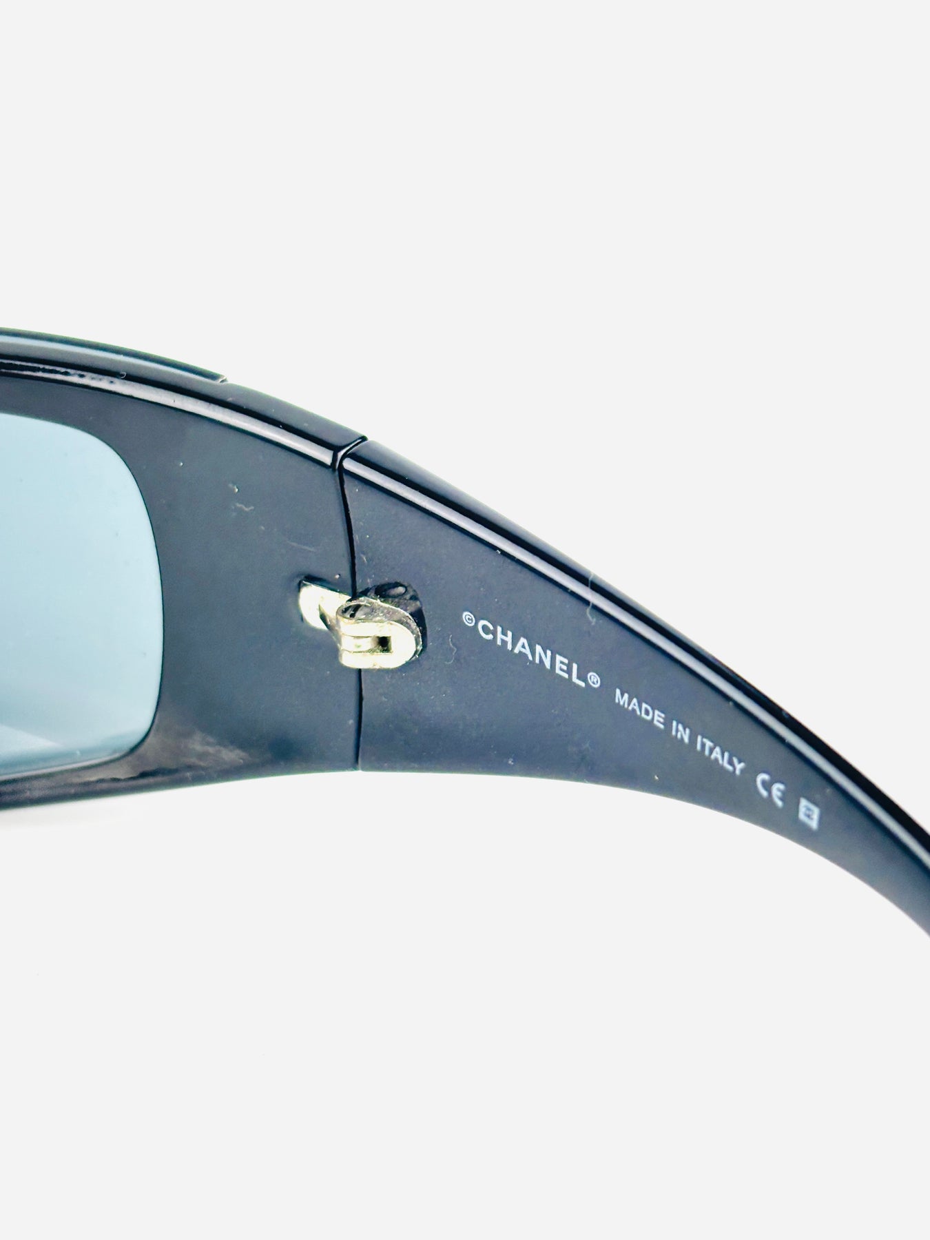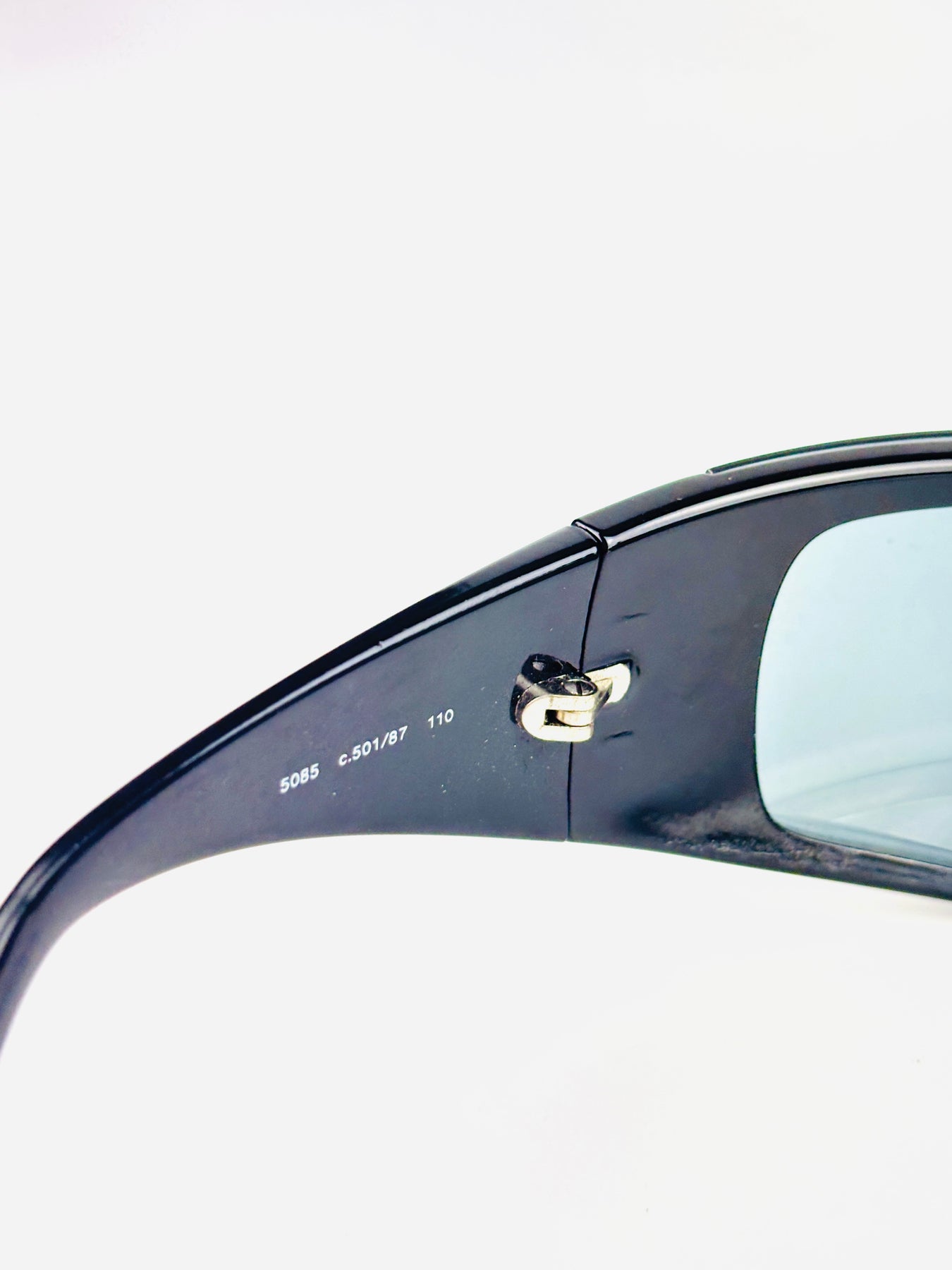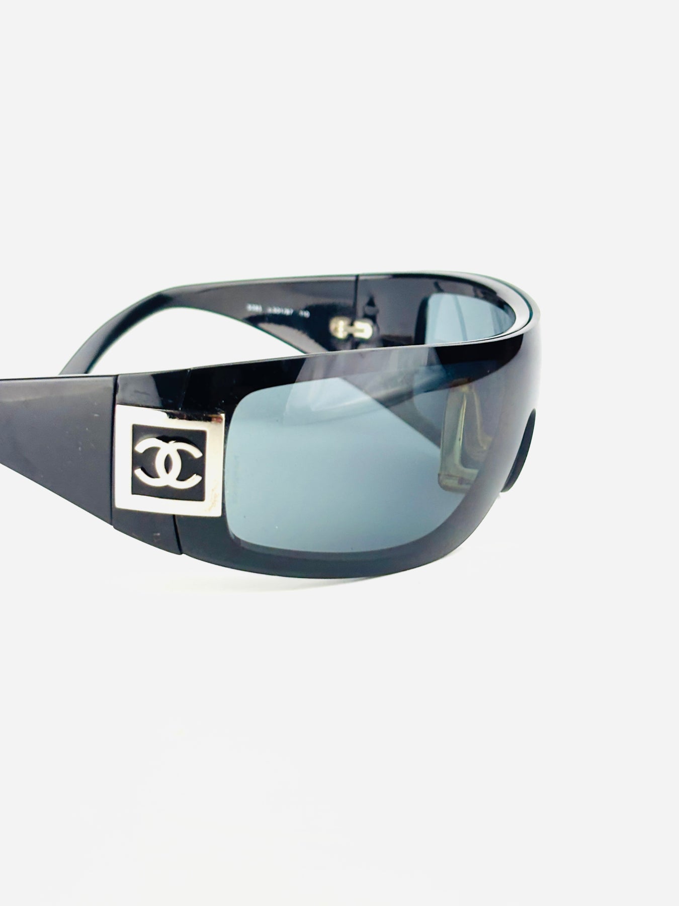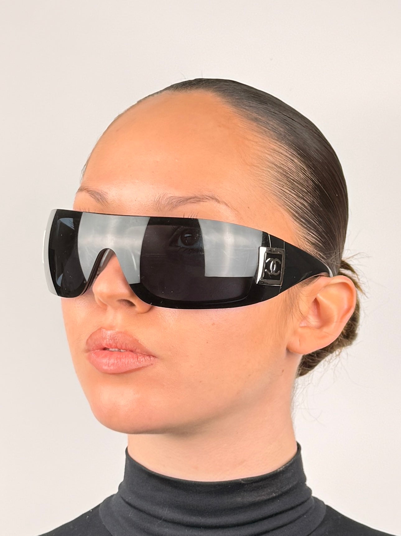 This Chanel 5085 mask is a clean and powerful expression of early-2000s luxury eyewear. With its bold shield construction and glossy black finish, it delivers a timeless yet futuristic look.