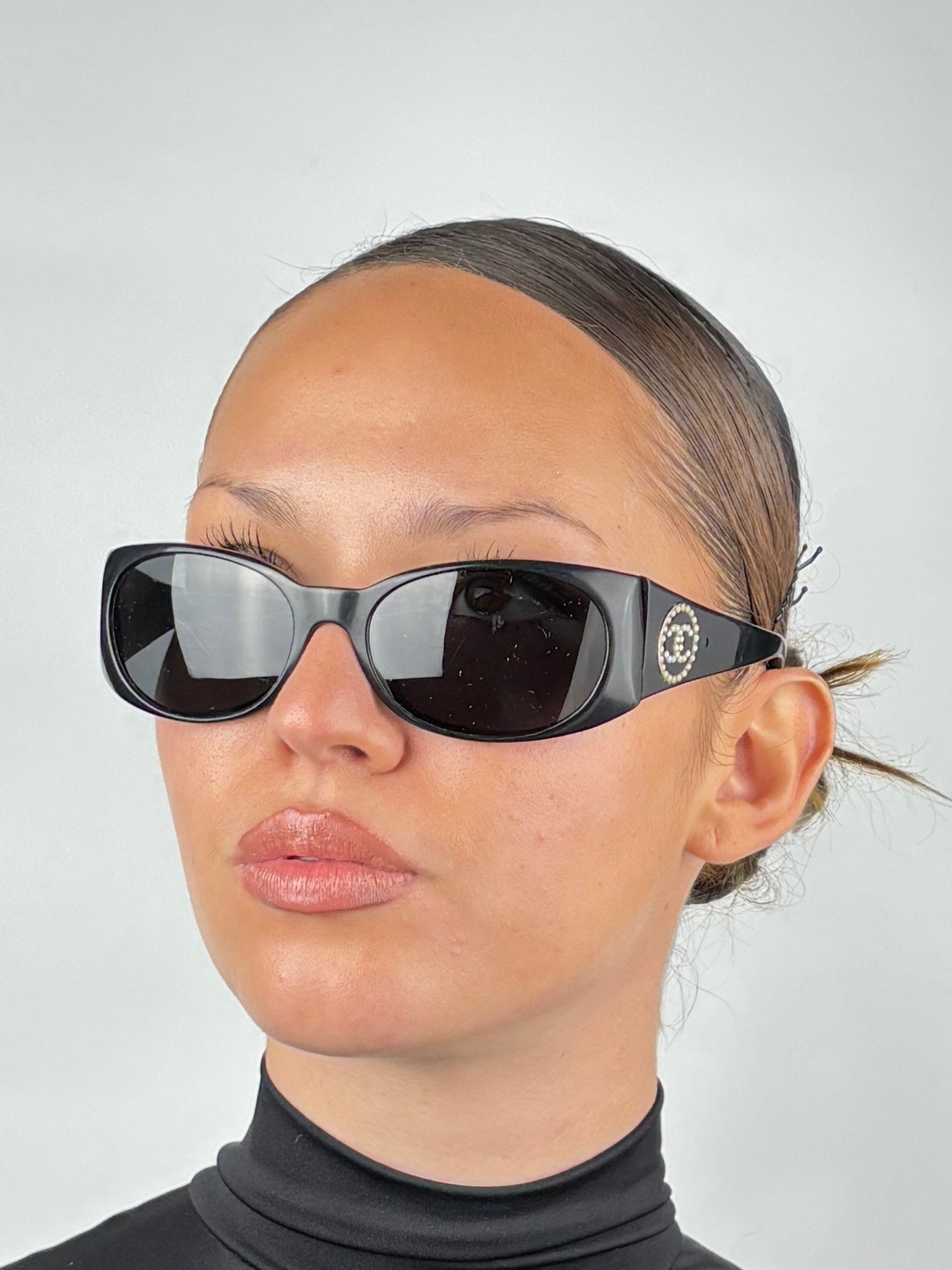 The Chanel 5082 is a bold early 2000s silhouette that perfectly embodies the house’s glamorous Y2K aesthetic. A sculptural black acetate frame combined with Chanel’s iconic pearl-set CC logo makes this piece instantly recognizable.