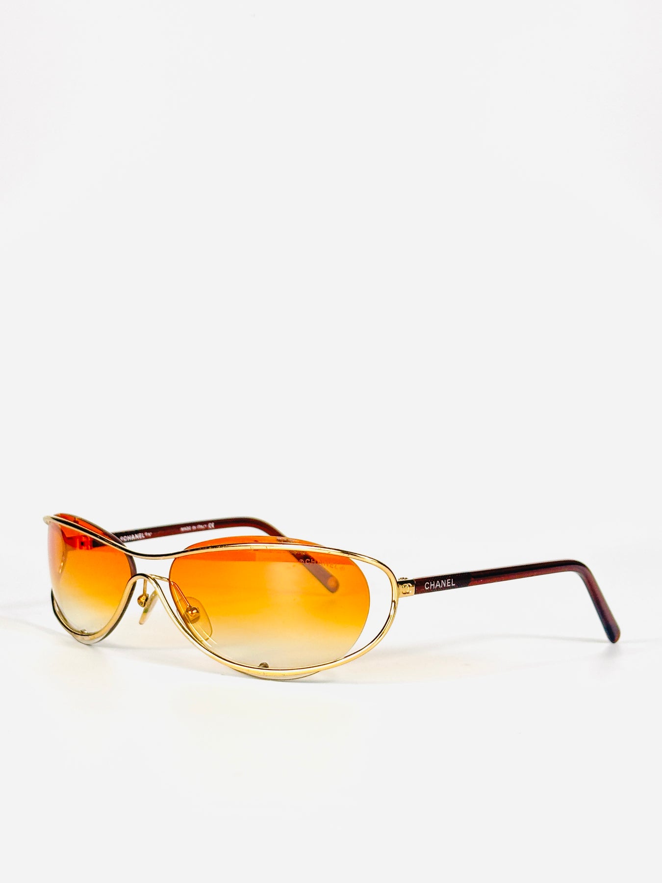 The Chanel 4020 is a striking early 2000s model featuring a refined gold metal frame paired with vibrant orange lenses. Its elegant yet bold design captures the fashion-forward spirit of Chanel eyewear during that period.