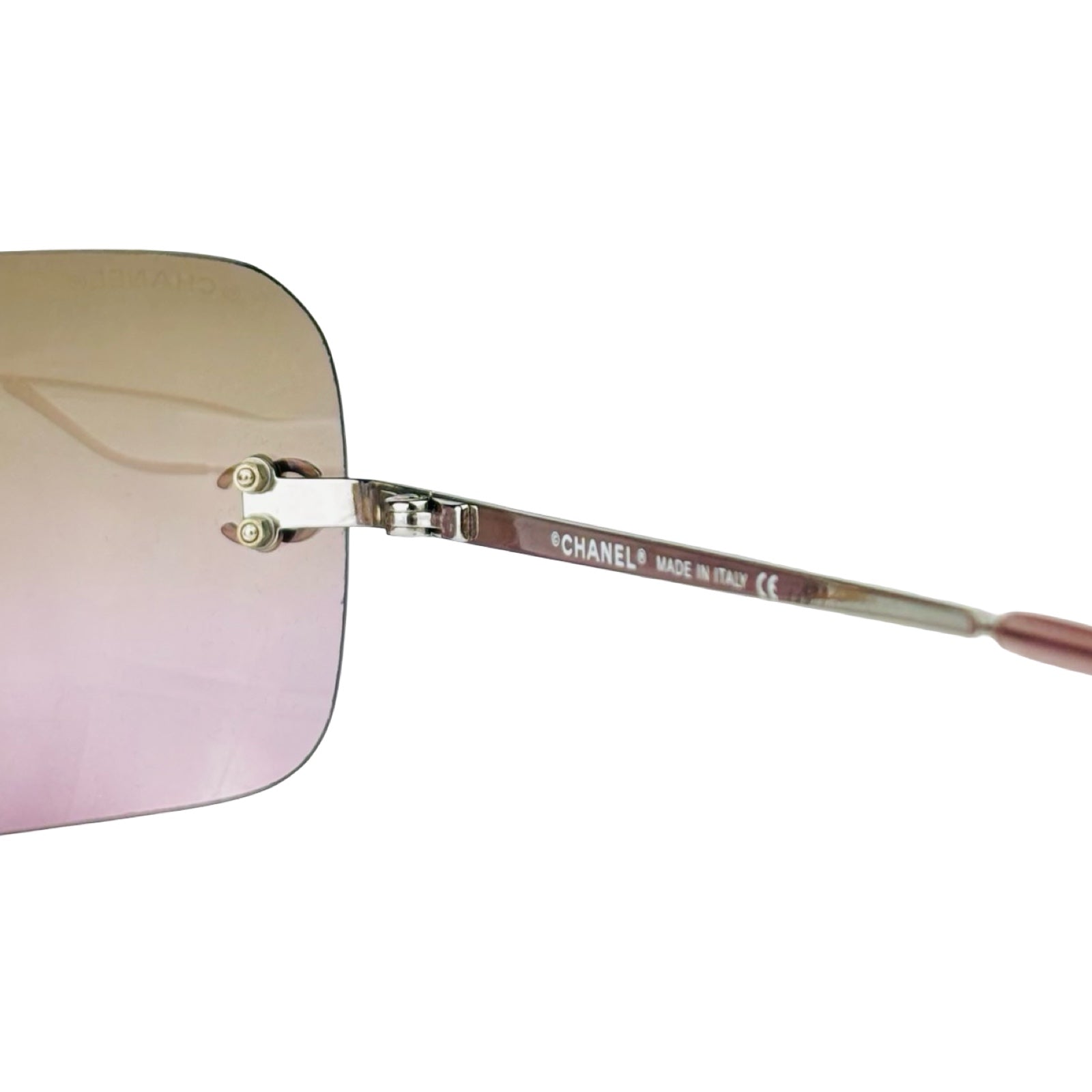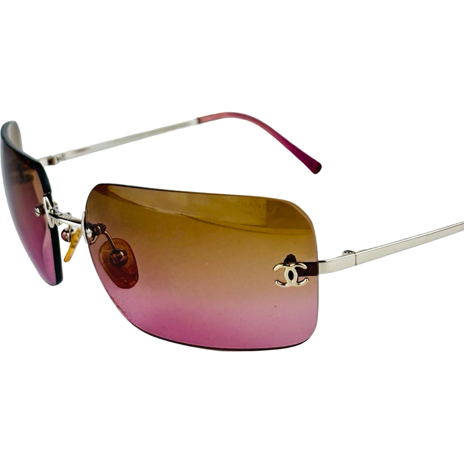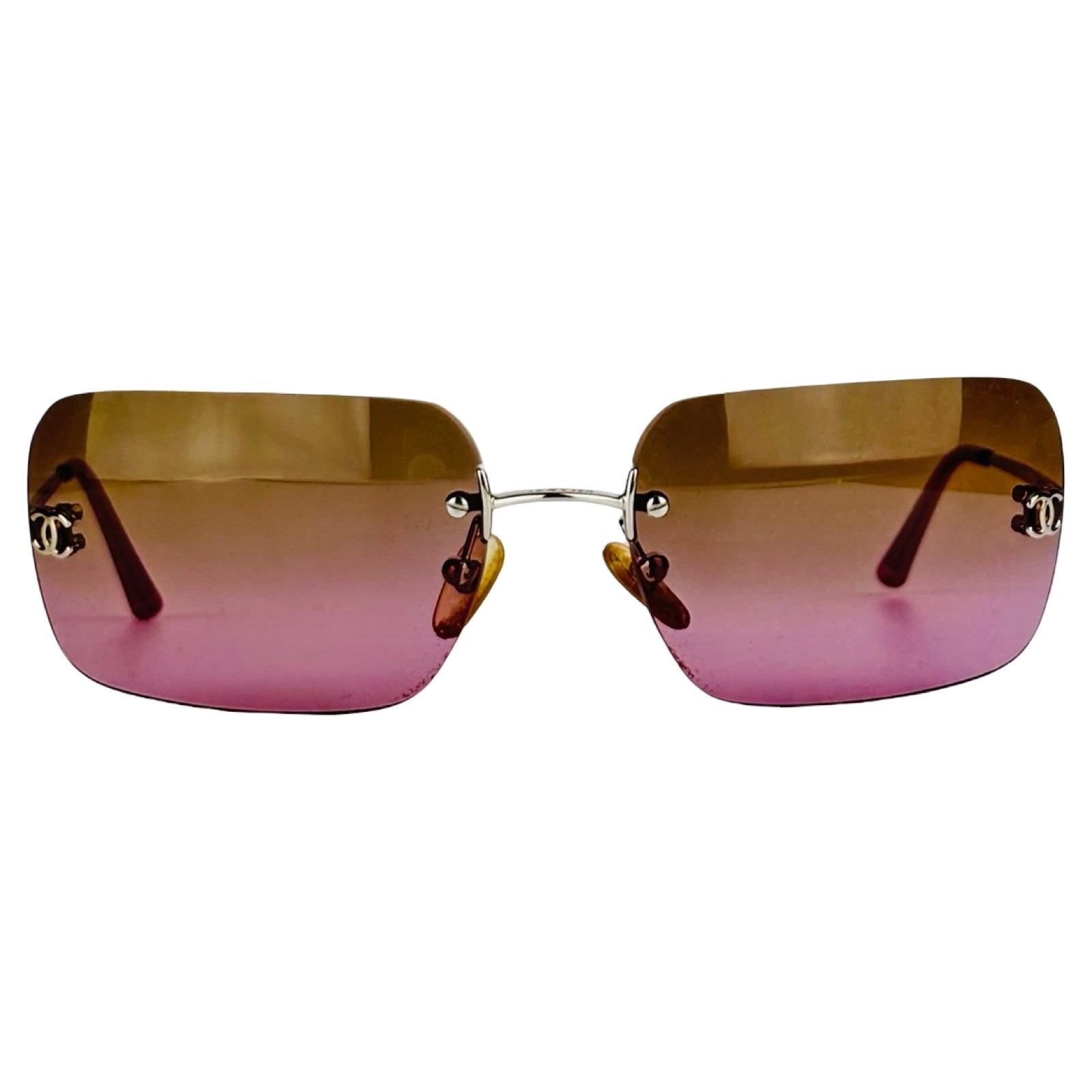 Iconic rimless sunglasses from the late '90s, the CHANEL 4018 model features gradient amber to pink lenses and slim burgundy arms adorned with silver-toned CC logos. A rare, elegant piece with a sleek, minimalist Y2K aesthetic.