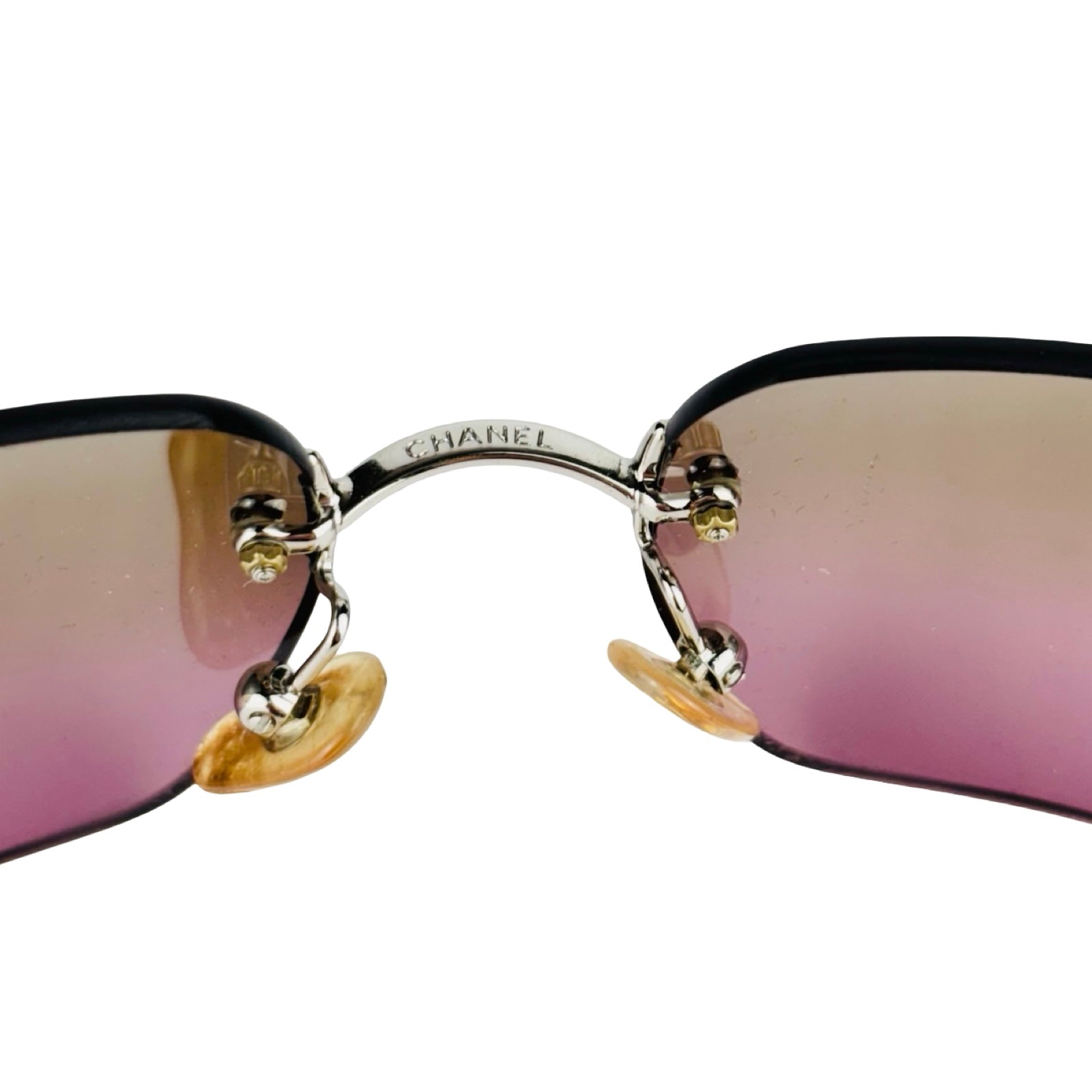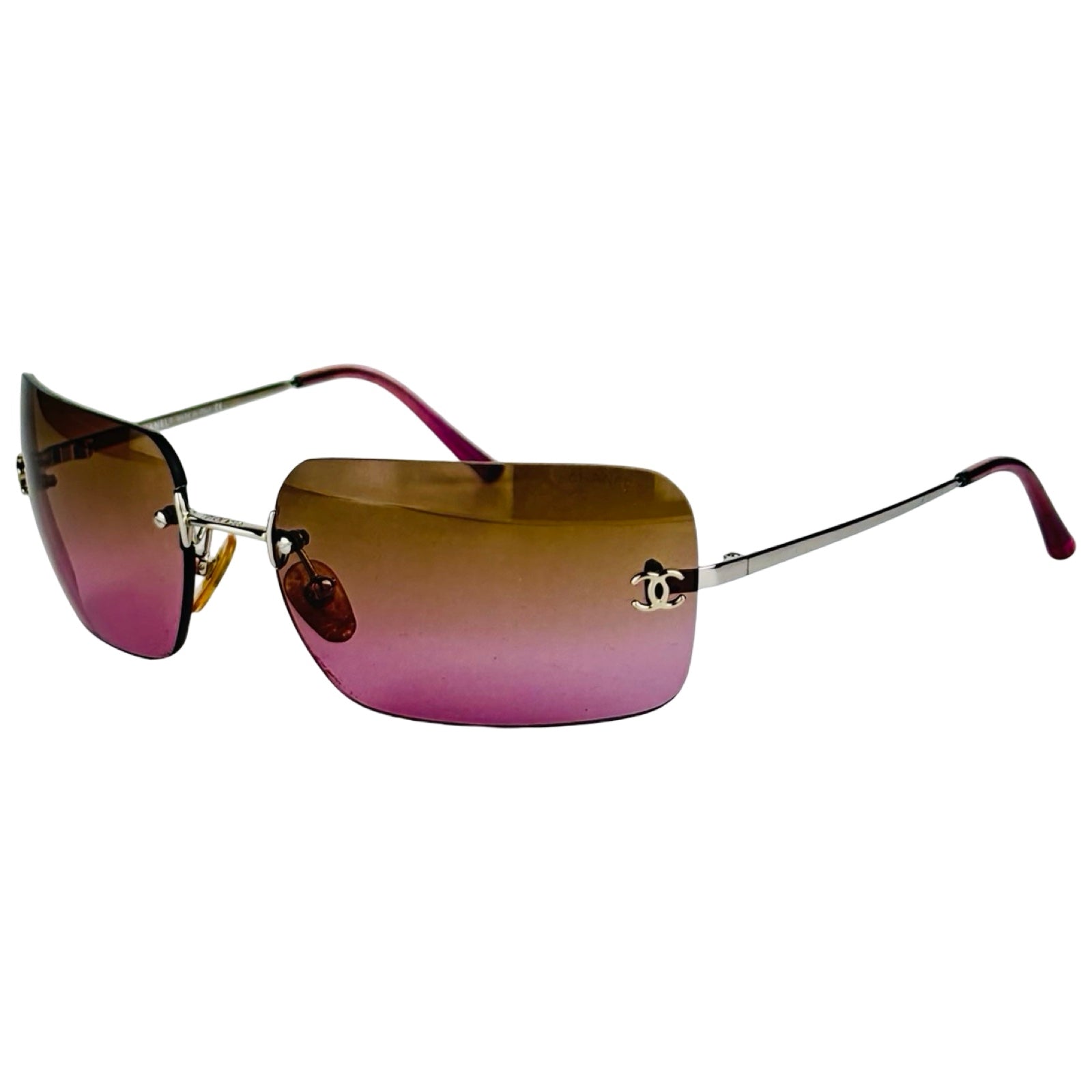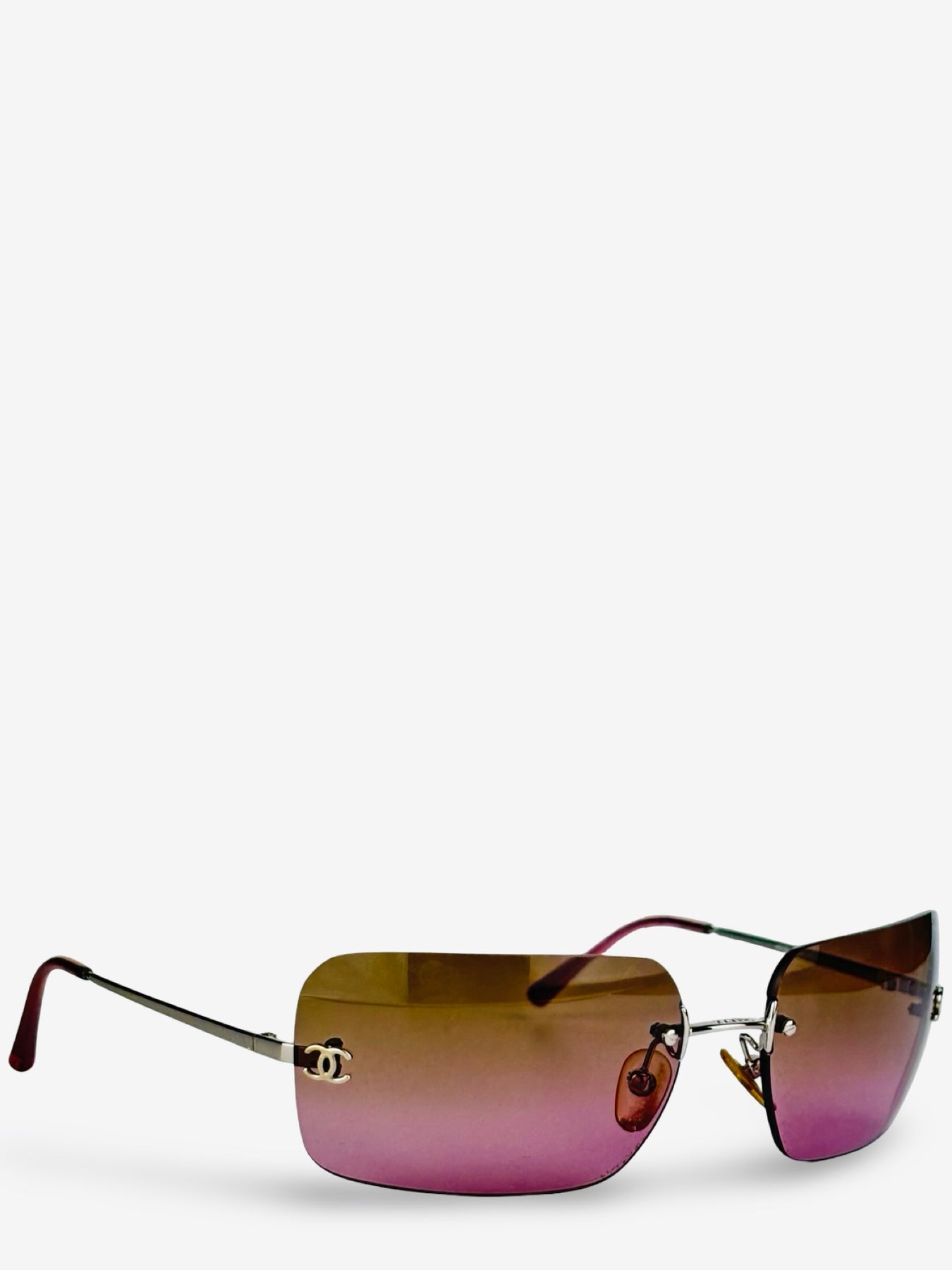 Iconic rimless sunglasses from the late '90s, the CHANEL 4018 model features gradient amber to pink lenses and slim burgundy arms adorned with silver-toned CC logos. A rare, elegant piece with a sleek, minimalist Y2K aesthetic.