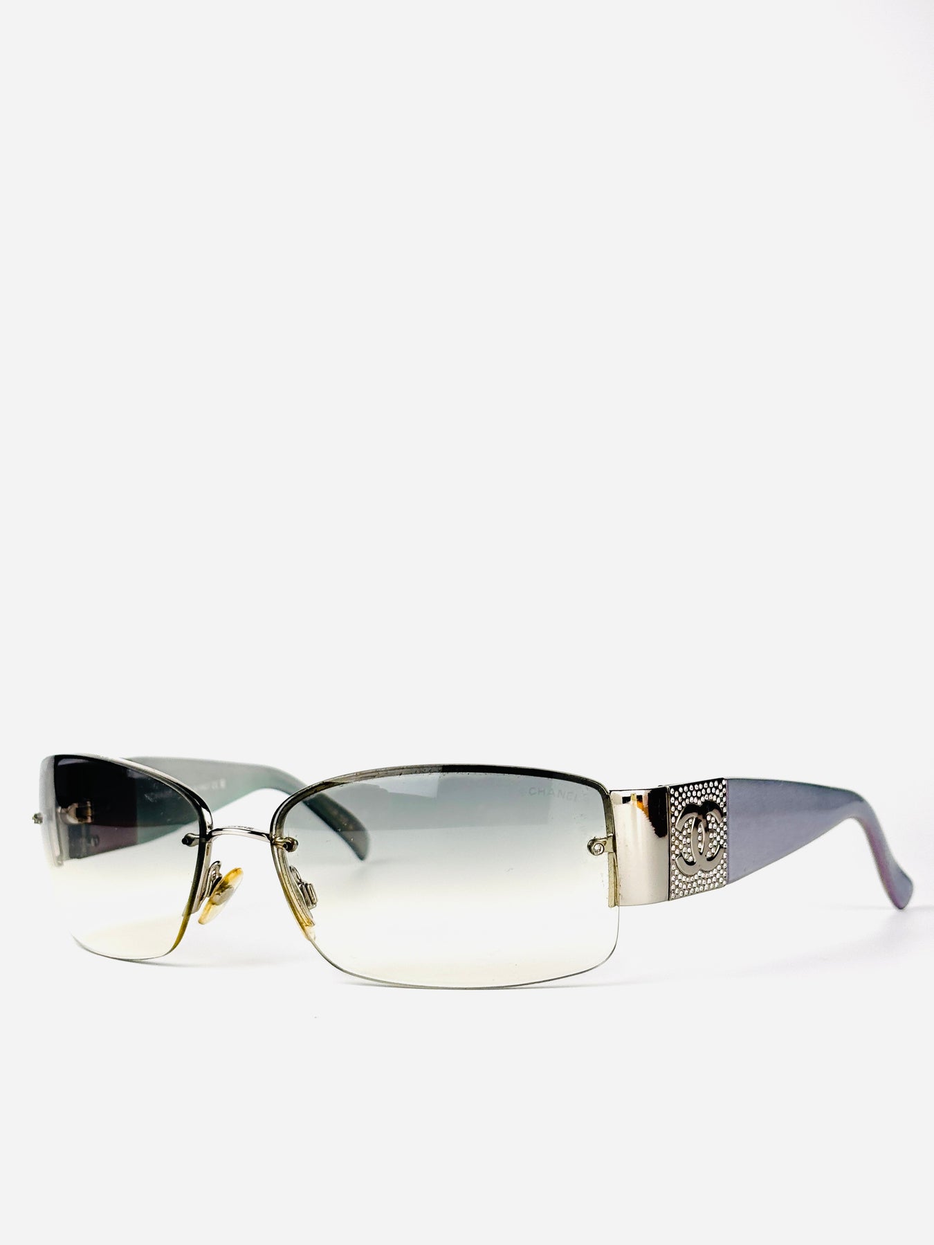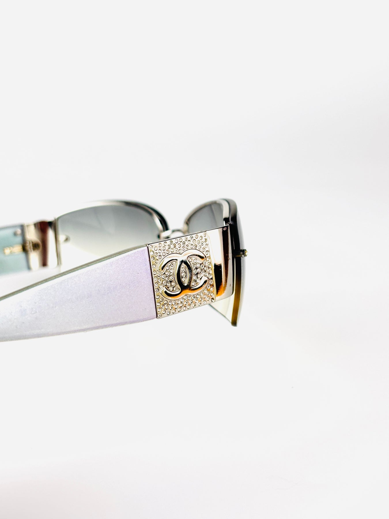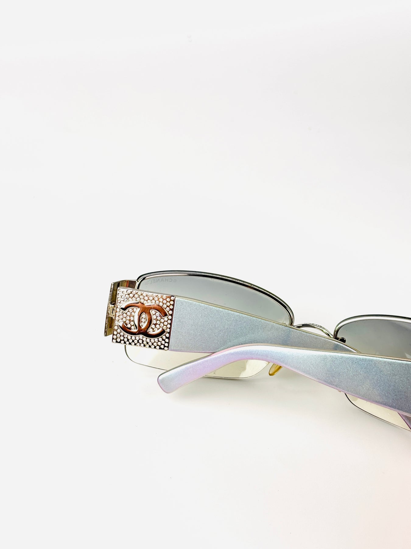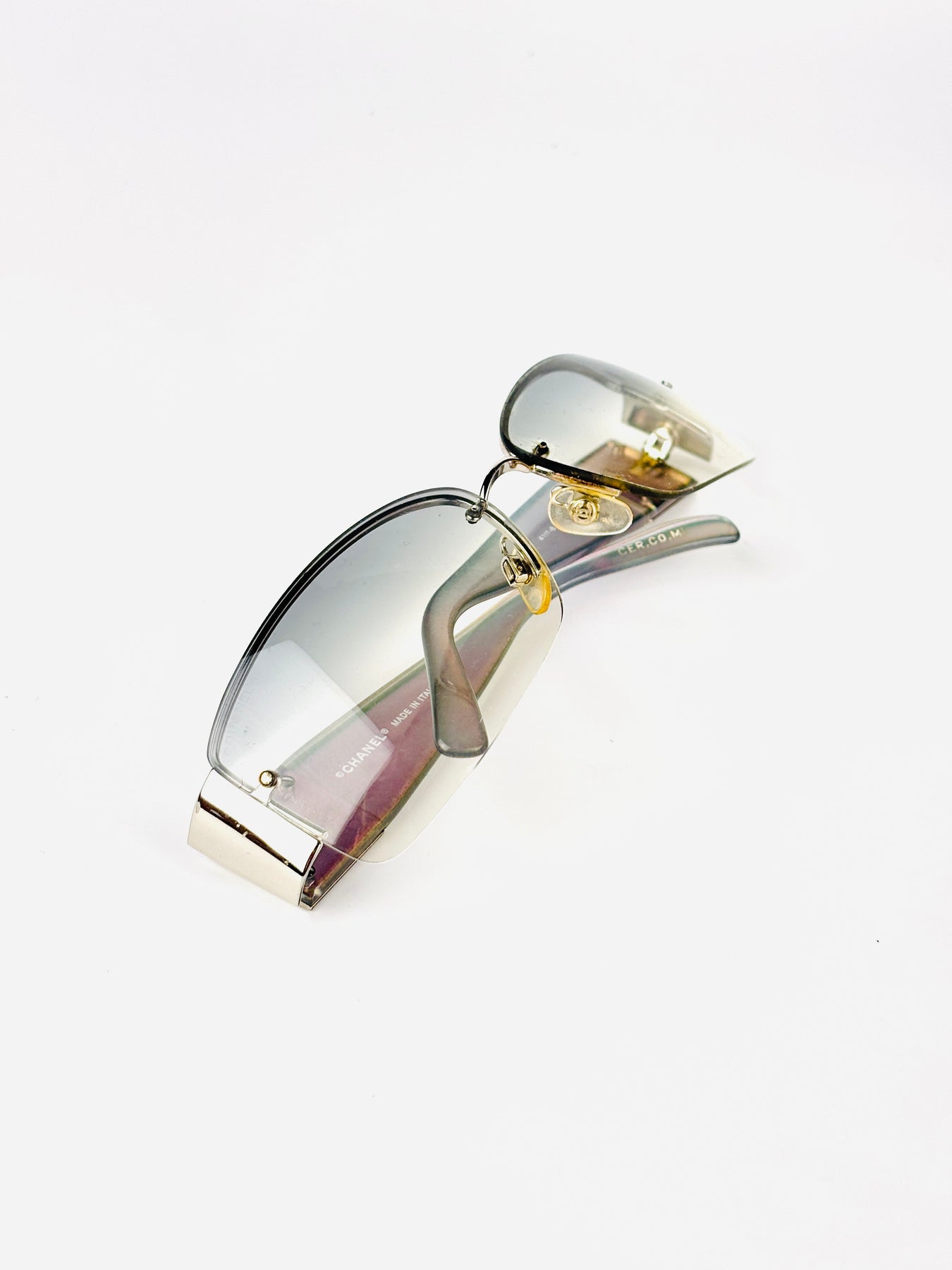 The Chanel 4117-B is an extraordinary rimless rectangular design featuring an iridescent nacre-inspired finish. This model is a perfect example of Chanel’s refined experimentation during the early 2000s.