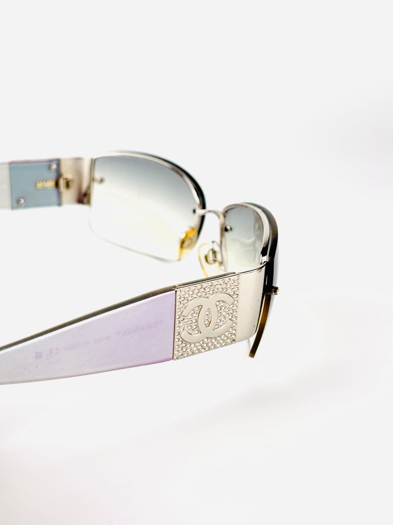 The grey gradient lenses float within a delicate rimless construction, while the violet pearl-effect temples create a luminous, almost opalescent reflection. The strass-embellished Chanel logo adds subtle brilliance without overpowering the elegance of the design.