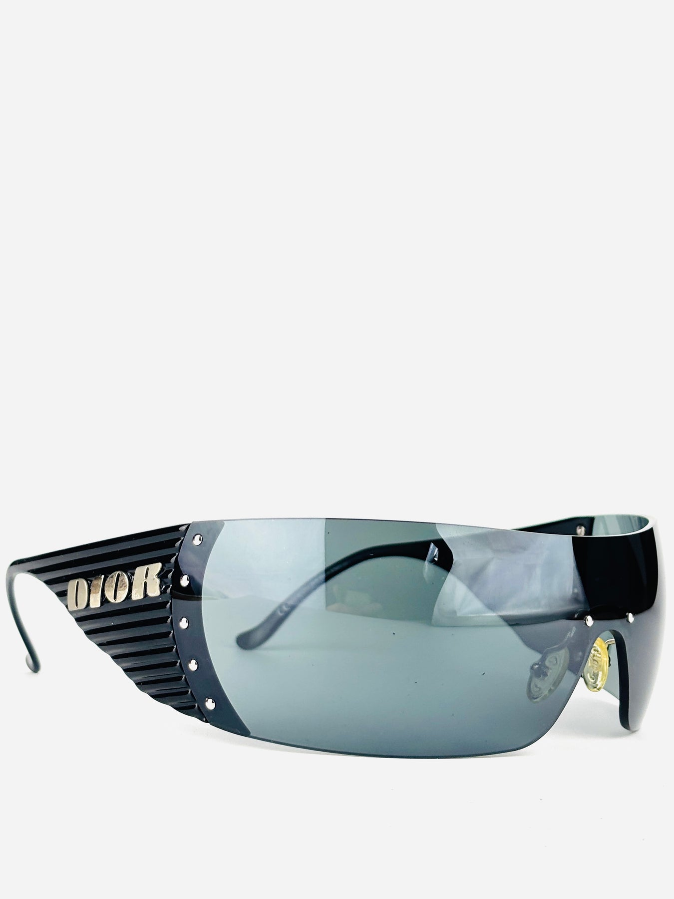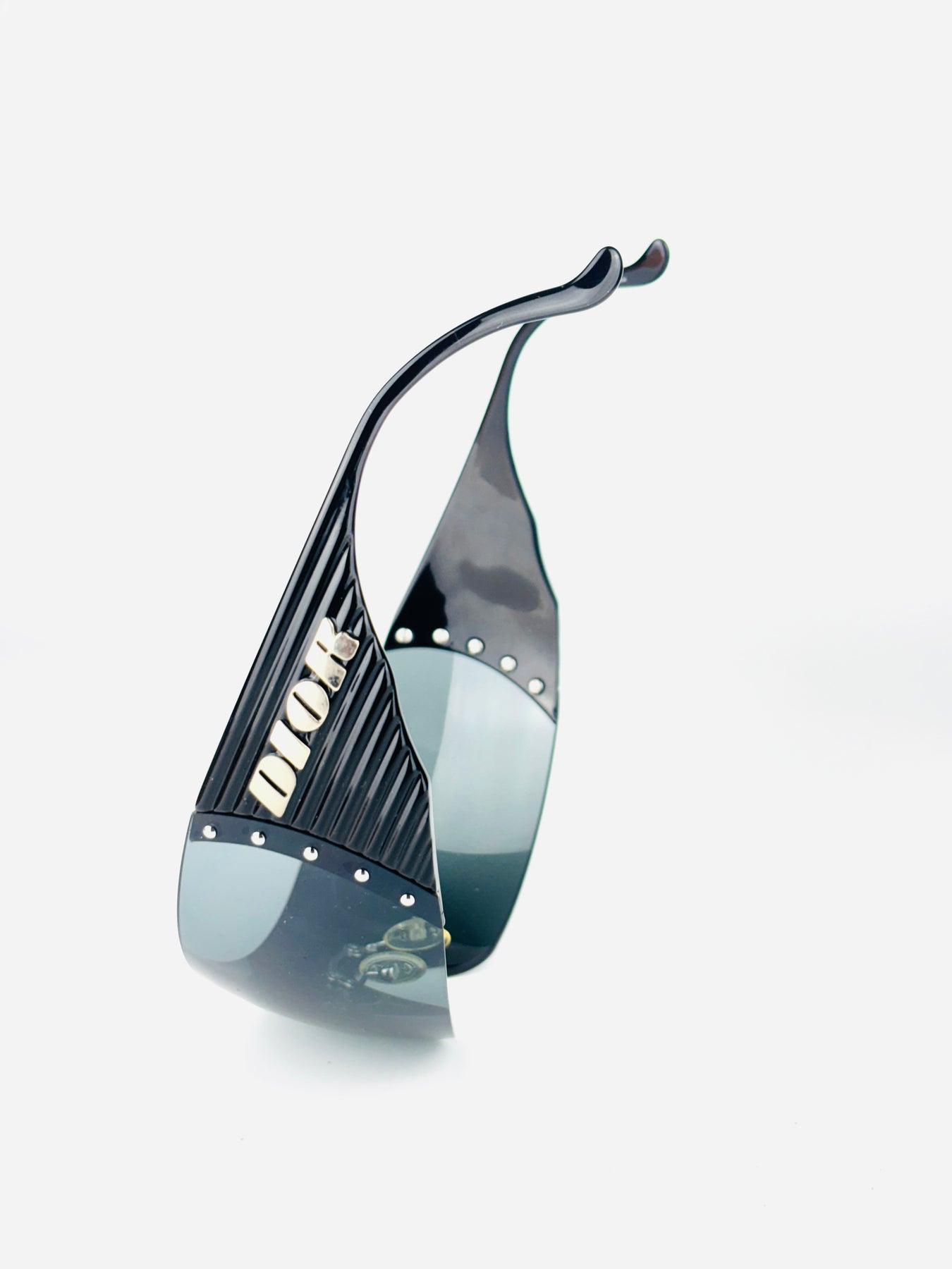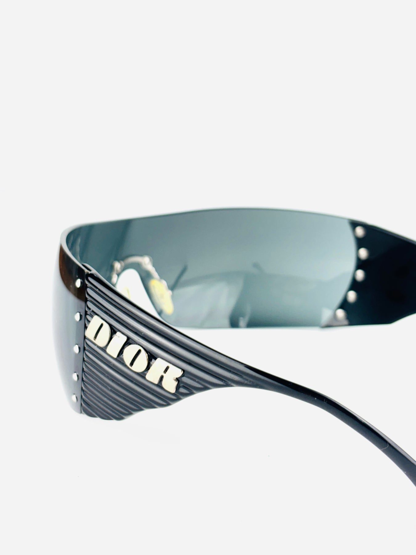 The black frame is paired with a dark shield lens, giving the model an aggressive yet refined look. Ribbed temple details and bold Dior branding emphasize its industrial, avant-garde identity. The sunglasses are in very good condition with minimal signs of wear.