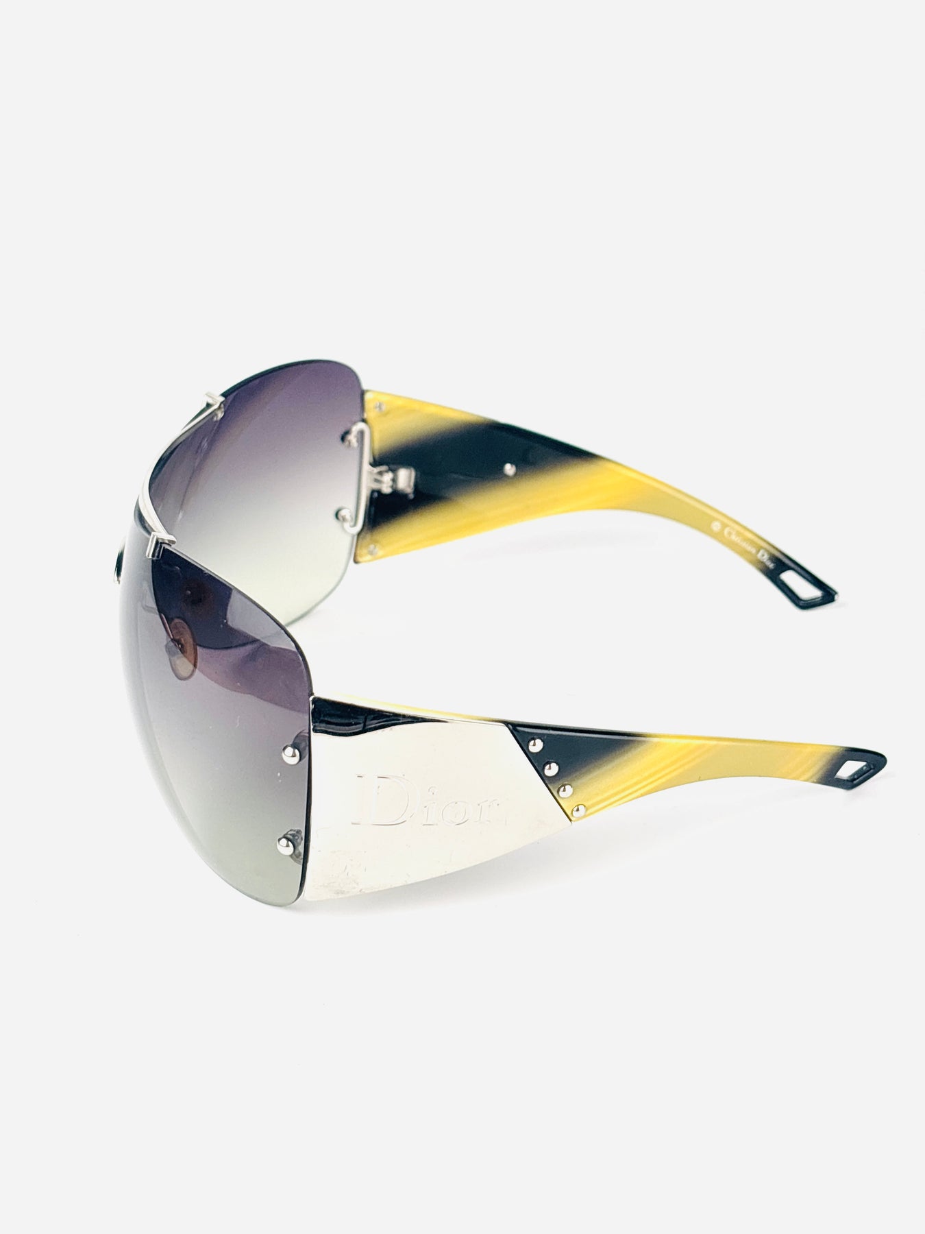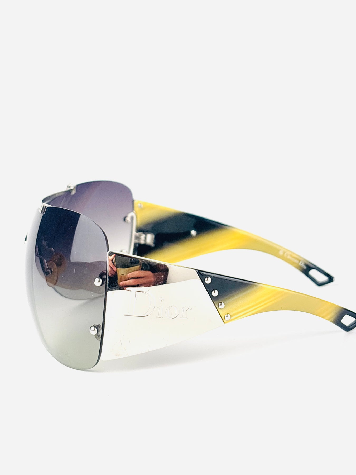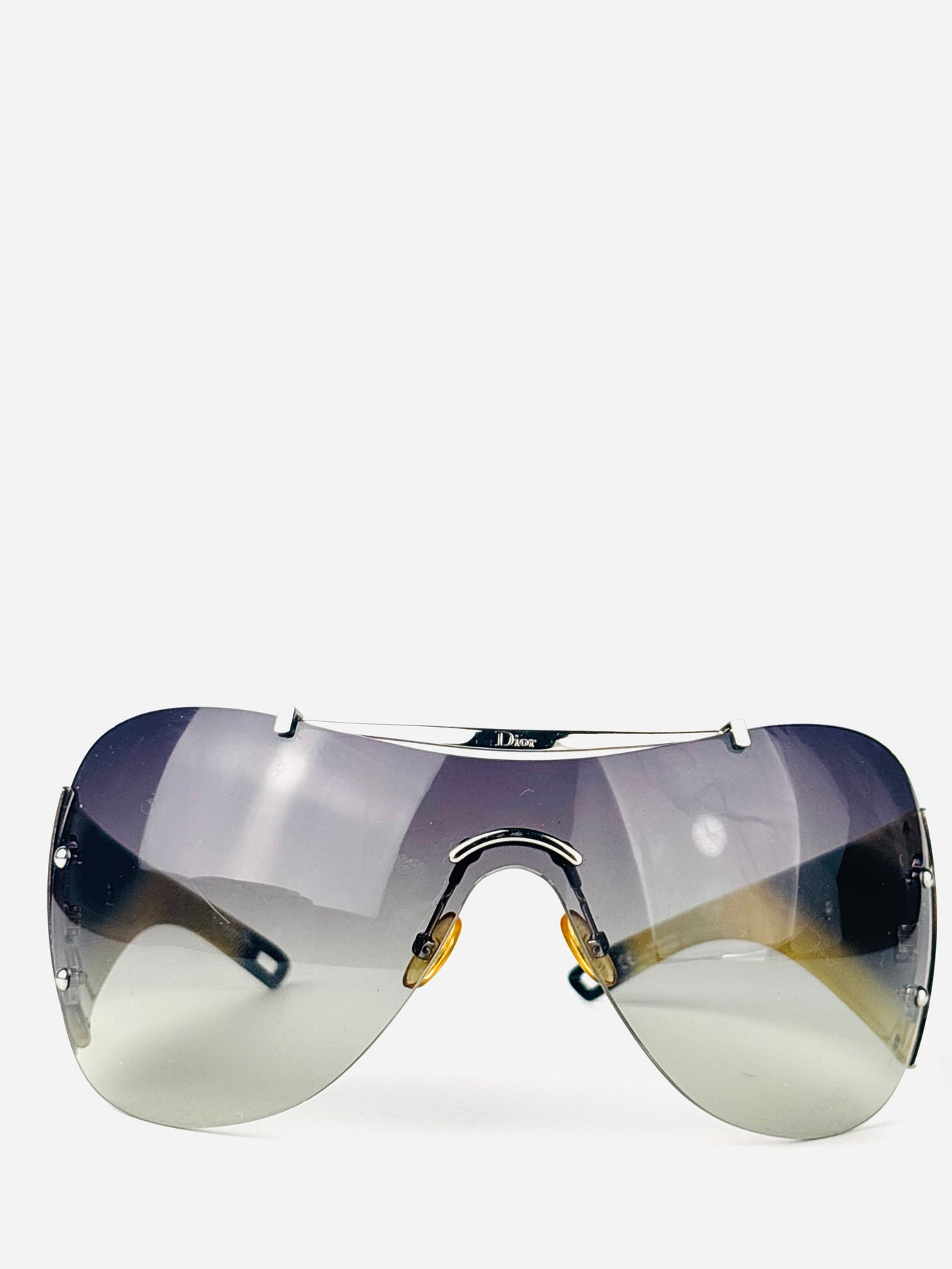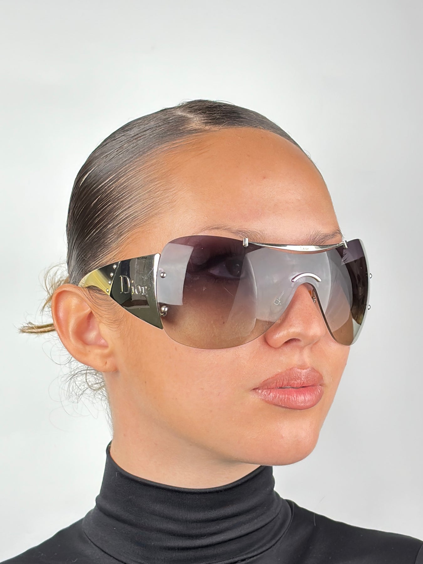 This ultra-rare zebra-effect frame features bone-inspired detailing and a light violet gradient lens. Finished with silver Dior branding, it perfectly embodies the theatrical spirit of early 2000s Dior.