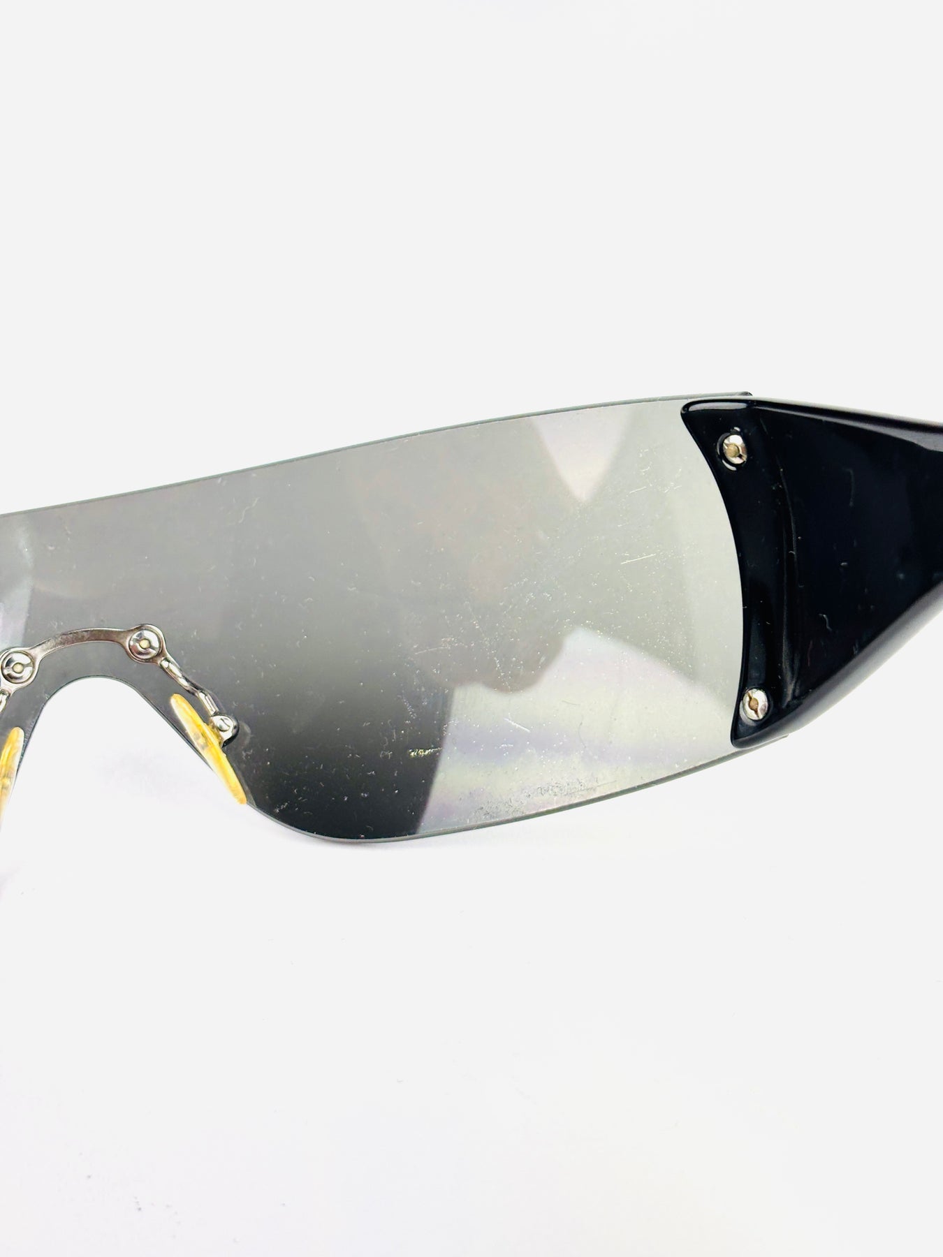 Featuring a glossy black frame paired with a dark shield lens, this piece delivers a strong, architectural presence. The signature Dior logo and star details reinforce its unmistakable identity.