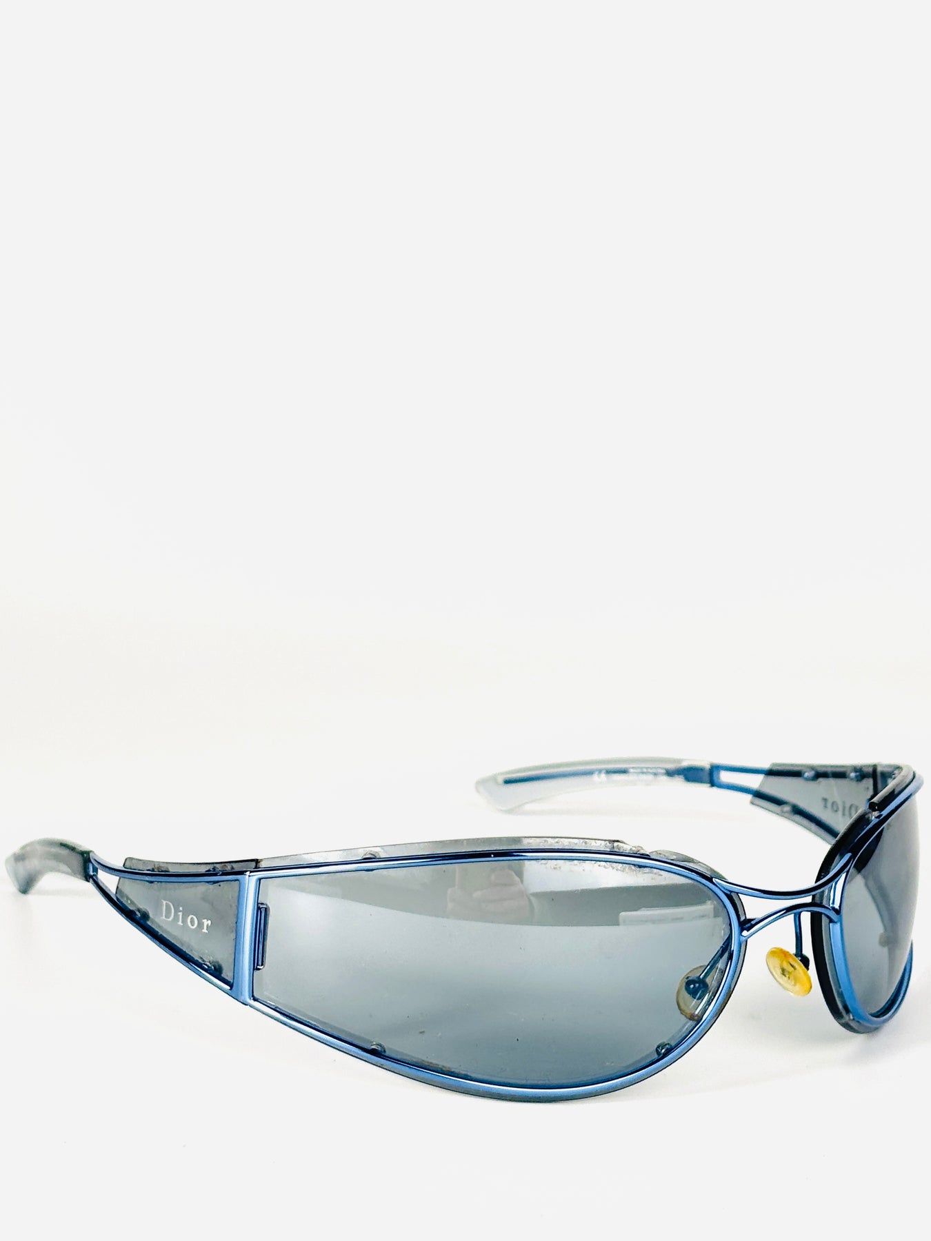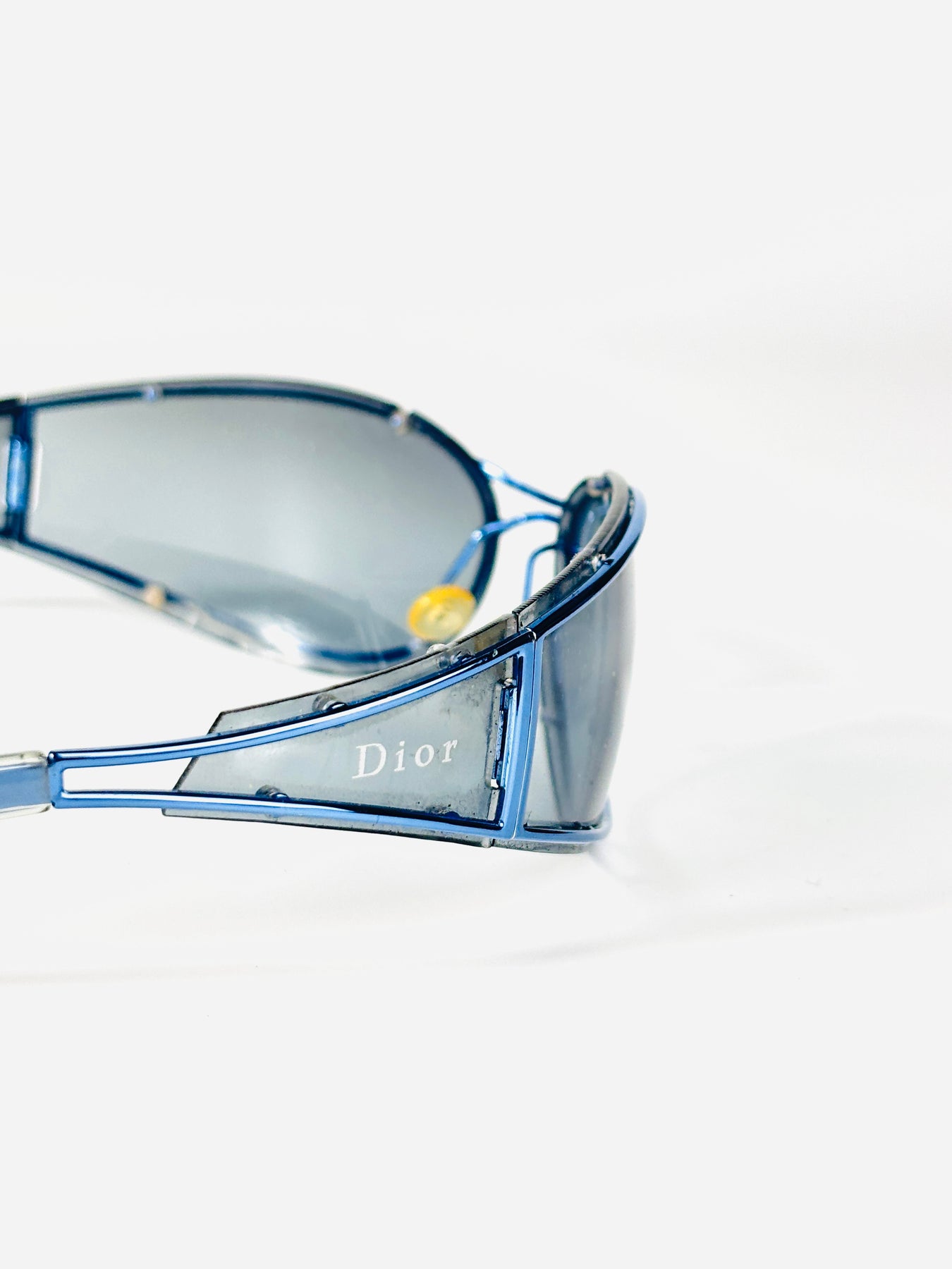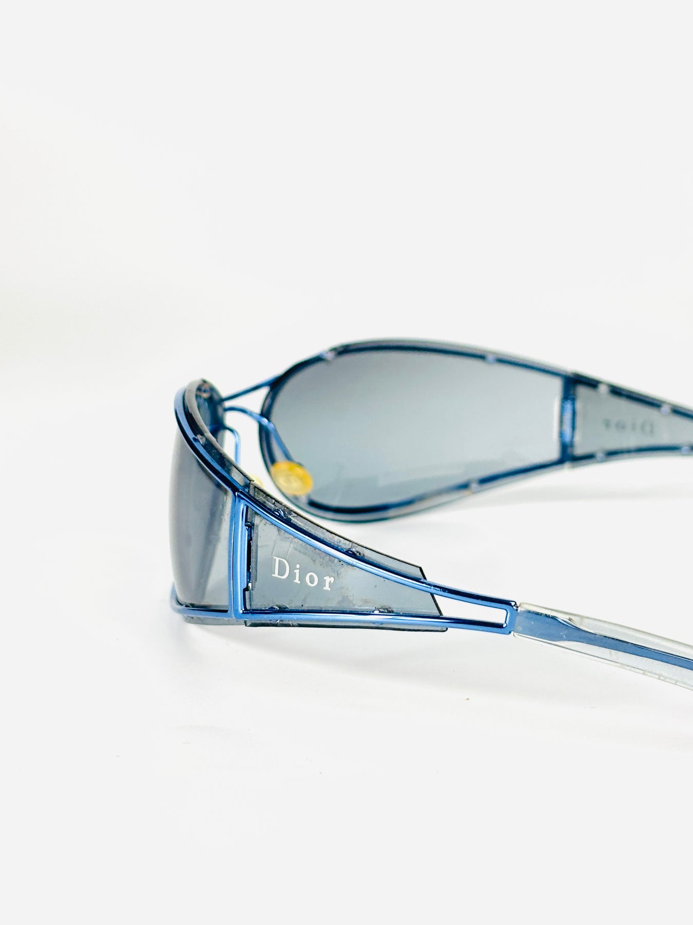 The oversized blue-tinted shield lens is paired with transparent blue side panels, creating a fully glass-constructed look that feels both technical and fashion-forward. The Dior signature appears subtly on the sides, reinforcing its archival status.