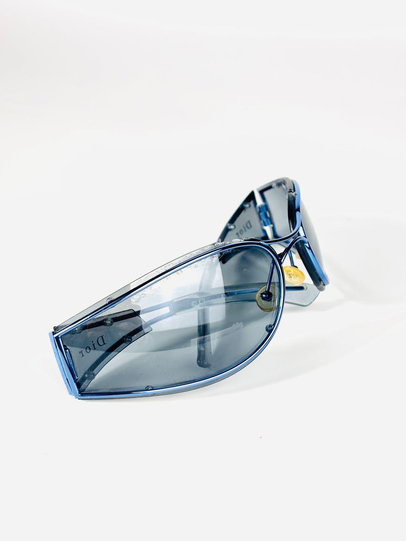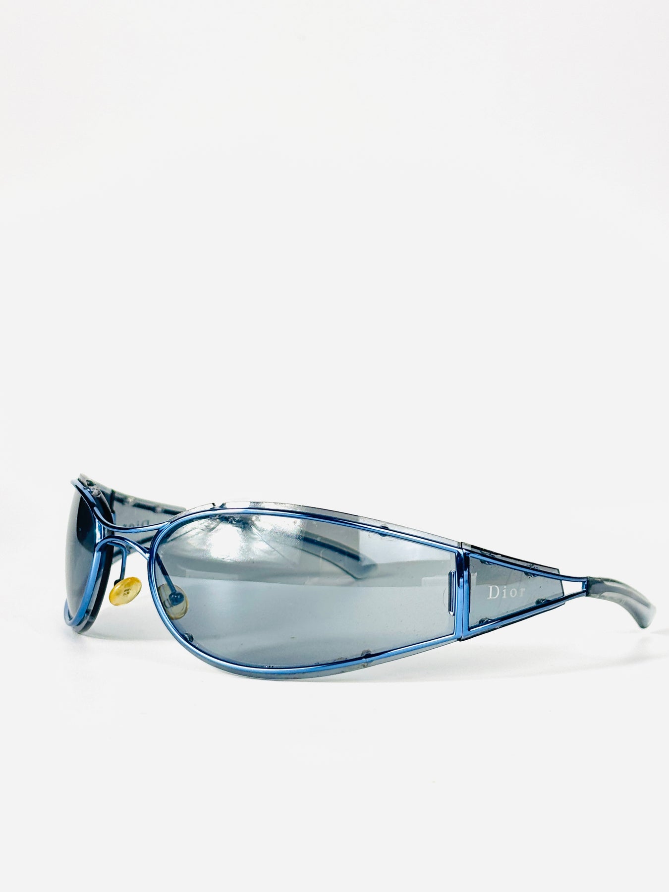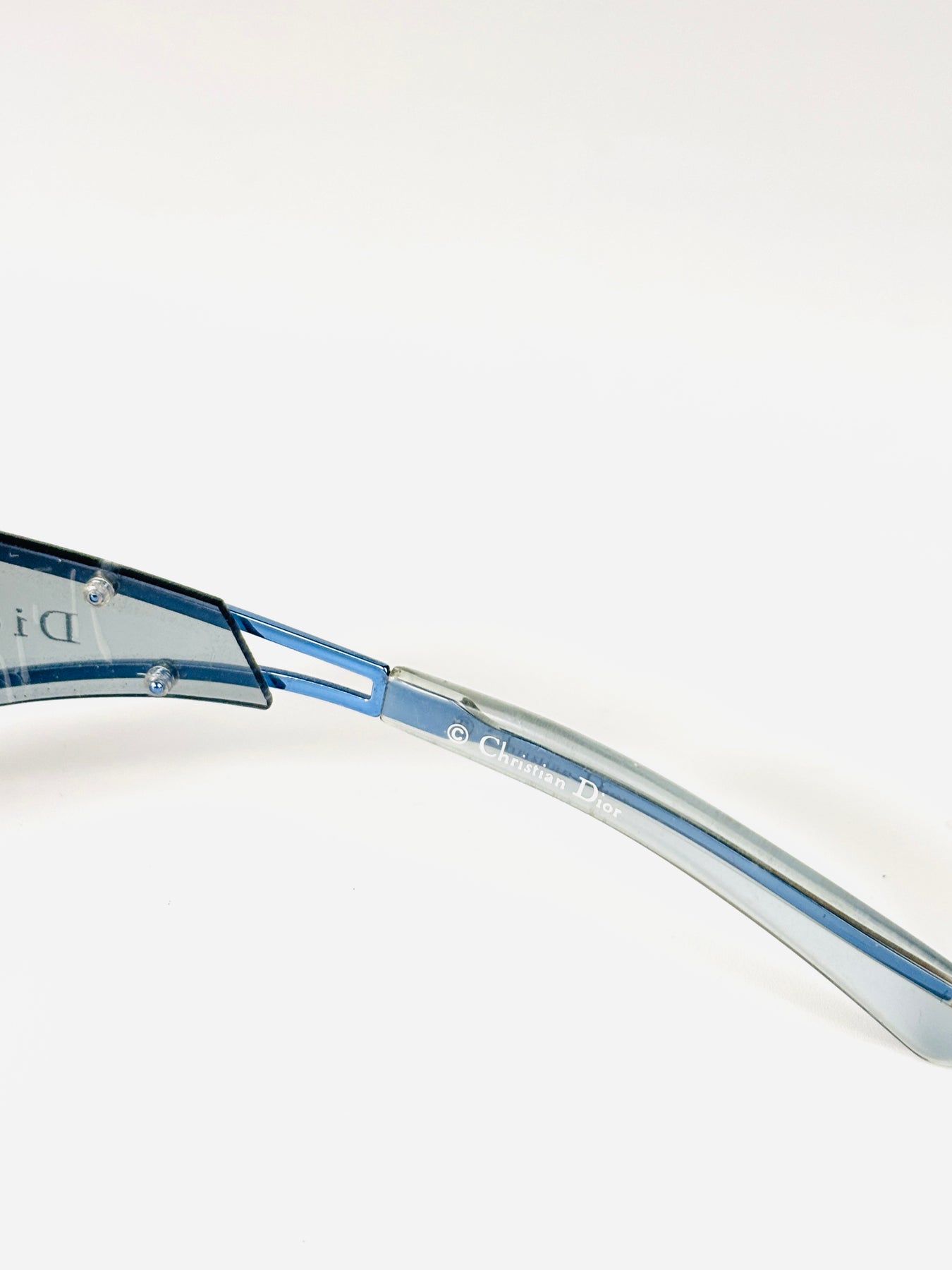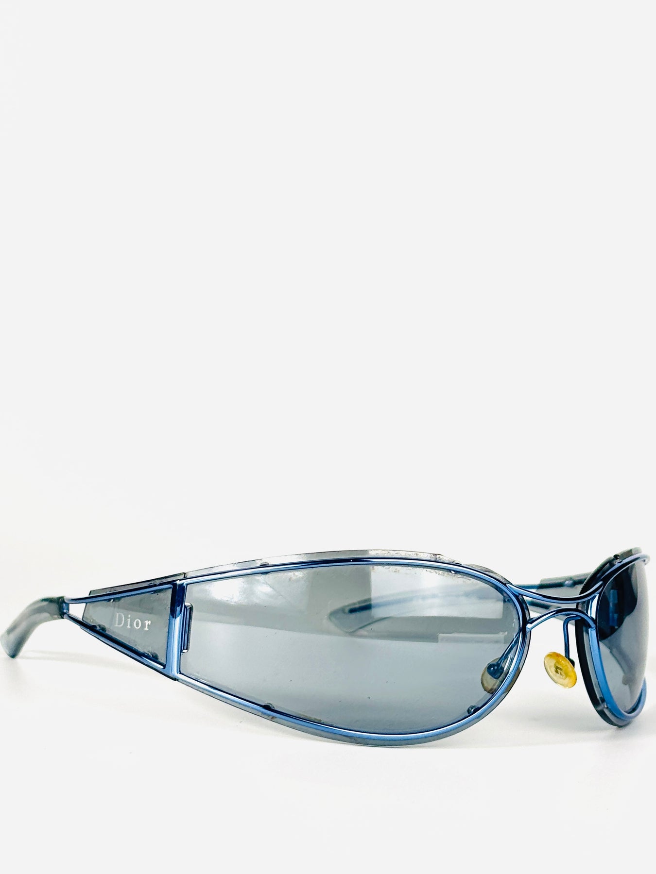 The oversized blue-tinted shield lens is paired with transparent blue side panels, creating a fully glass-constructed look that feels both technical and fashion-forward. The Dior signature appears subtly on the sides, reinforcing its archival status.