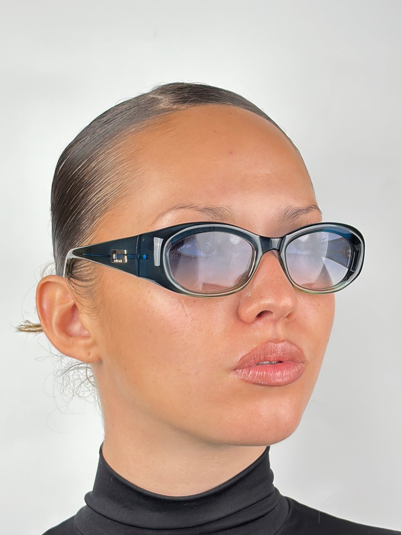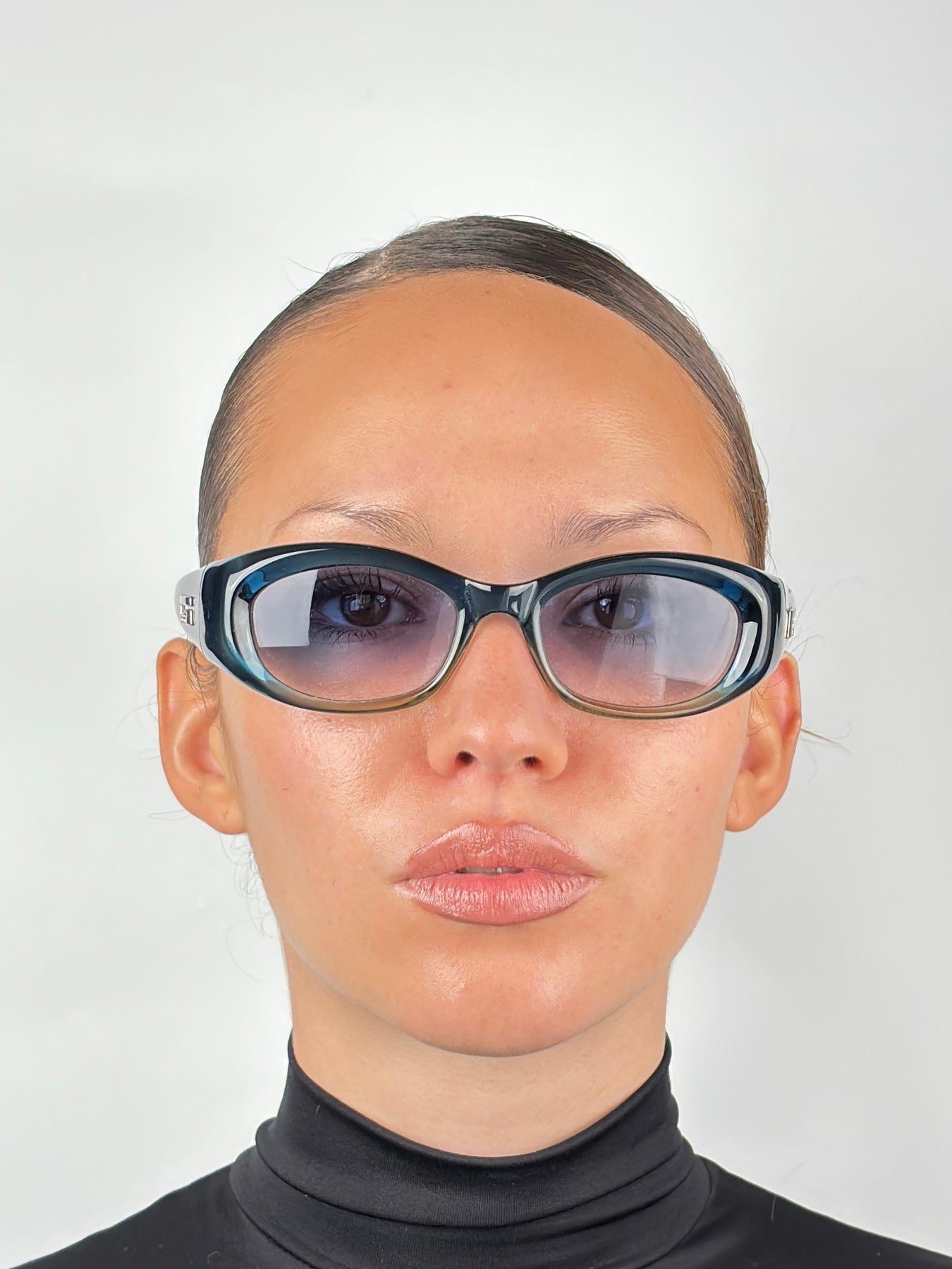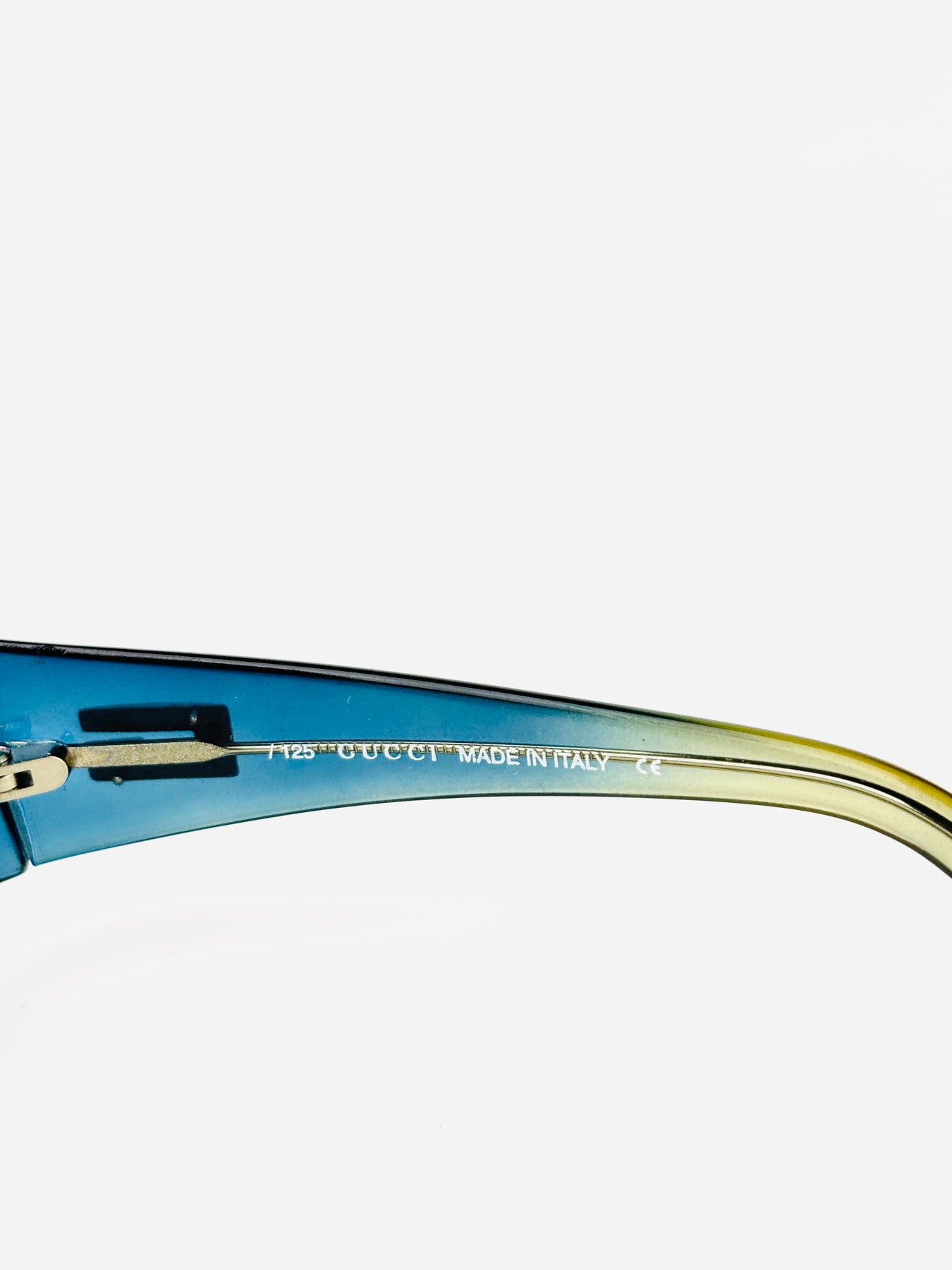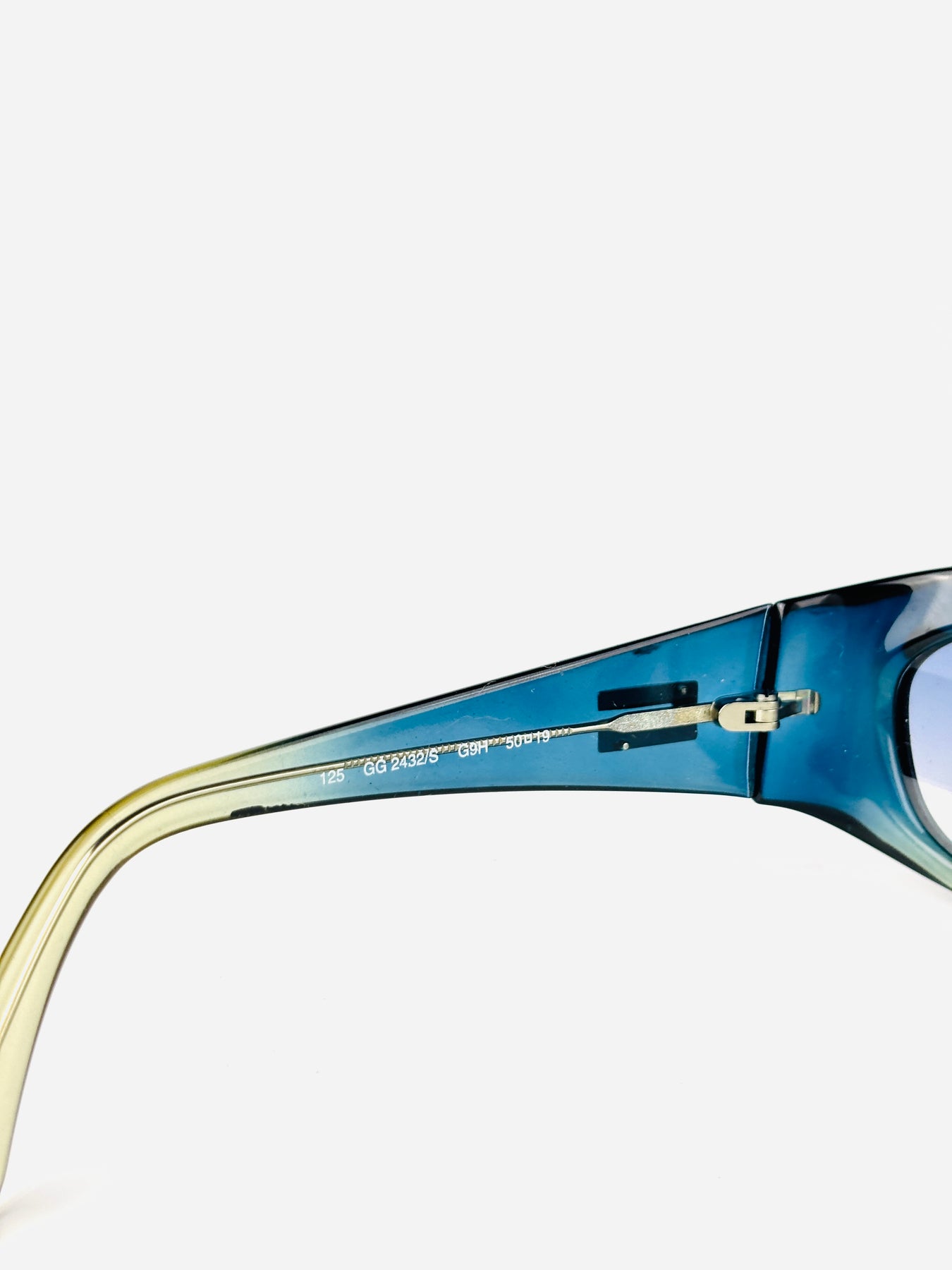 This GG2432/S presents a vivid blue acetate frame fading into a yellow gradient, paired with light gradient lenses. The oval silhouette and bold color contrast make it a true Y2K statement. Very good vintage condition.